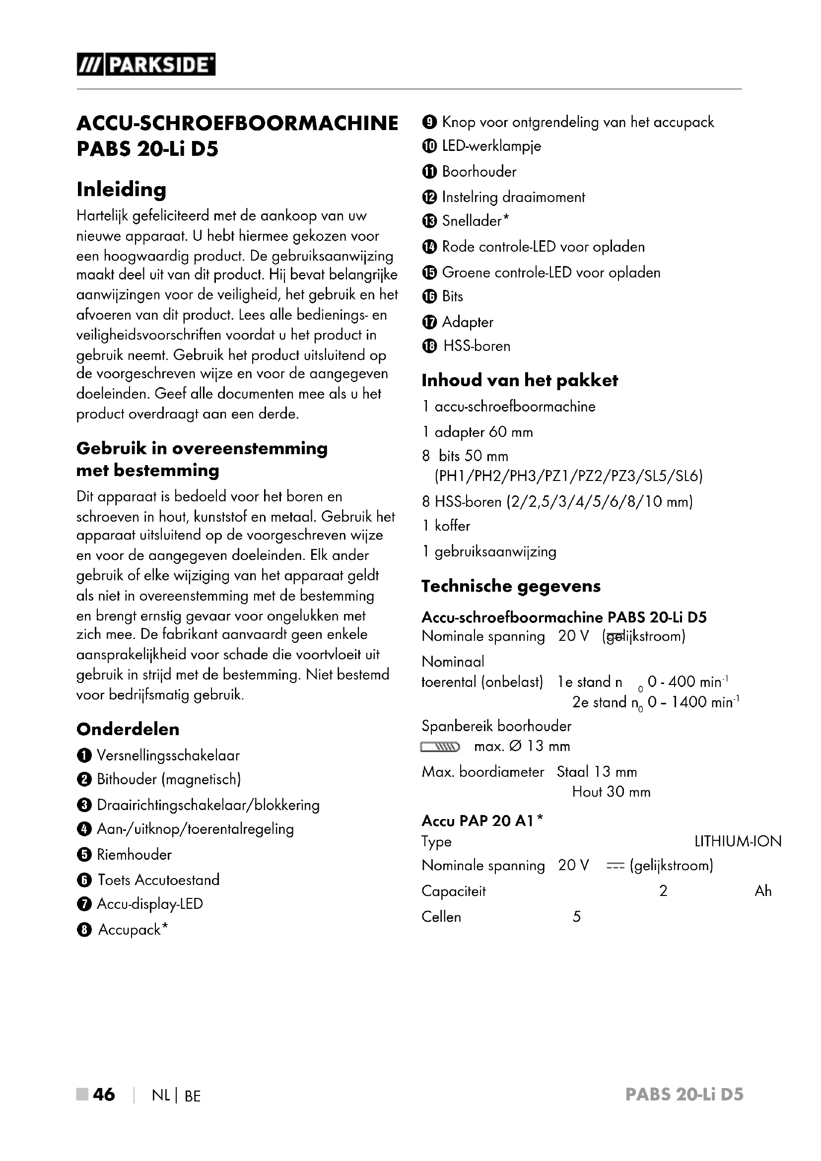 GEBRUIKSAANWIJZING PABS 20Li D5 PARKSIDE