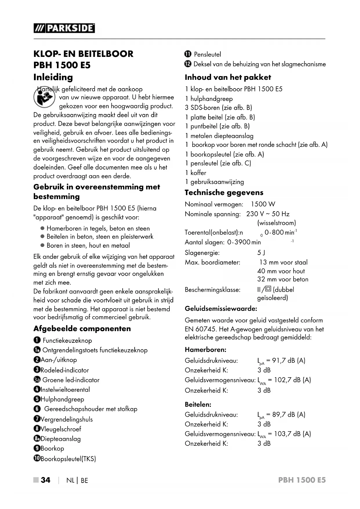 Groene led-indicator Instelwiel toerental Hulphandgreep Gereedschapshouder met stofkap Vergrendelingshuls Vleugelschroef Diepteaanslag Boorkop Boorkopsleutel (TKS) Pensleutel Deksel van de behuizing van het slagmechanisme Inhoud van het pakket 1 klop- en beitelboor PBH 1500 E5 1 hulphandgreep 3 SDS-boren (zie afb. B) 1 platte beitel (zie afb. B) 1 puntbeitel (zie afb. B) 1 metalen diepteaanslag 1 boorkop voor boren met ronde schacht (zie afb. A) 1 boorkopsleutel (zie afb. A) 1 pensleutel (zie afb. C) 1 koffer 1 gebruiksaanwijzing Technische gegevens Nominaal vermogen: 1500 W Nominale spanning: 230 V ∼ 50 Hz (wisselstroom) Toerental (onbelast): n