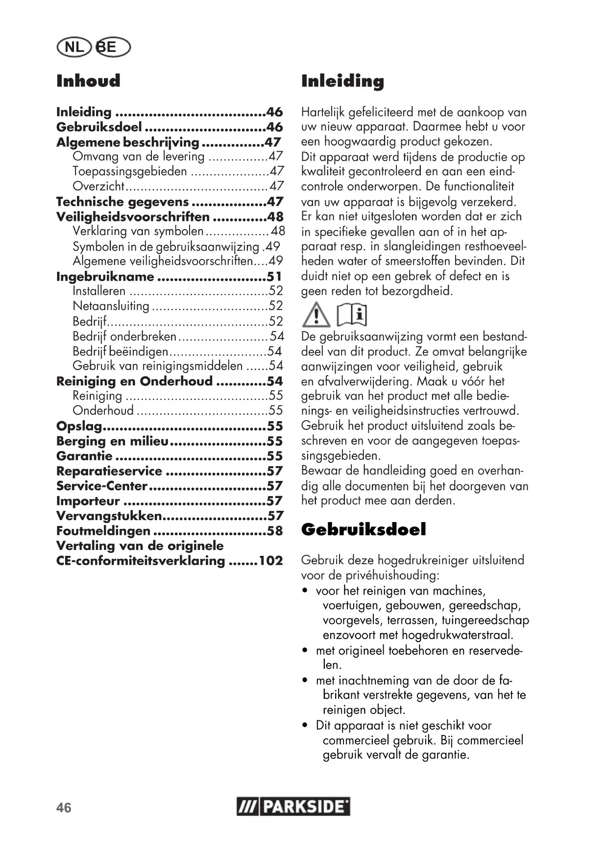 - Ter bescherming tegen te-50 NL BE voer of andere belangrke onderdelen zoals de hoge- drukslang of het spuitpistool beschadigd resp. lek is/zn.