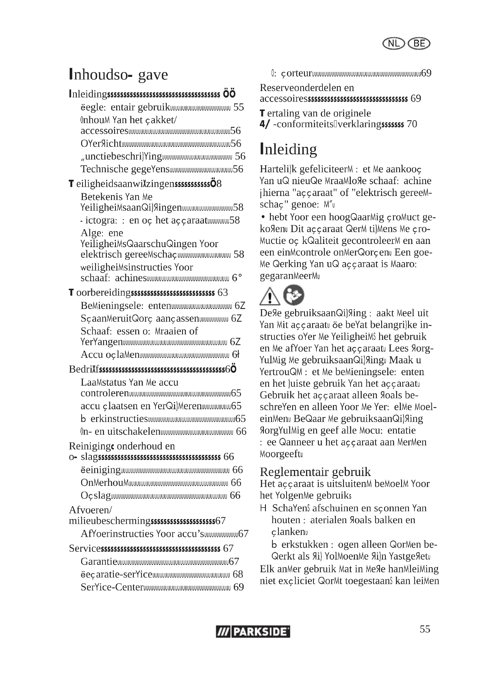- Vertaling van de originele EG-conformiteitsverklaring Inleiding Hartelijk gefeliciteerd met de aankoop van uw nieuwe draadloze schaafmachine (hierna "apparaat" of "elektrisch gereed- schap" genoemd). U hebt voor een hoogwaardig product ge- kozen. Dit apparaat werd tijdens de pro- ductie op kwaliteit gecontroleerd en aan een eindcontrole onderworpen. Een goe- de werking van uw apparaat is daarom gegarandeerd. Deze gebruiksaanwijzing maakt deel uit van dit apparaat. Ze bevat belangrijke in- structies over de veiligheid, het gebruik en de afvoer van het apparaat. Lees zorg- vuldig de gebruiksaanwijzing. Maak u vertrouwd met de bedieningselementen en het juiste gebruik van het apparaat. Gebruik het apparaat alleen zoals be- schreven en alleen voor de vermelde doel- einden. Bewaar de gebruiksaanwijzing zorgvuldig en geef alle documentatie mee wanneer u het apparaat aan derden doorgeeft. Reglementair gebruik Het apparaat is uitsluitend bedoeld voor het volgende gebruik: p. 70