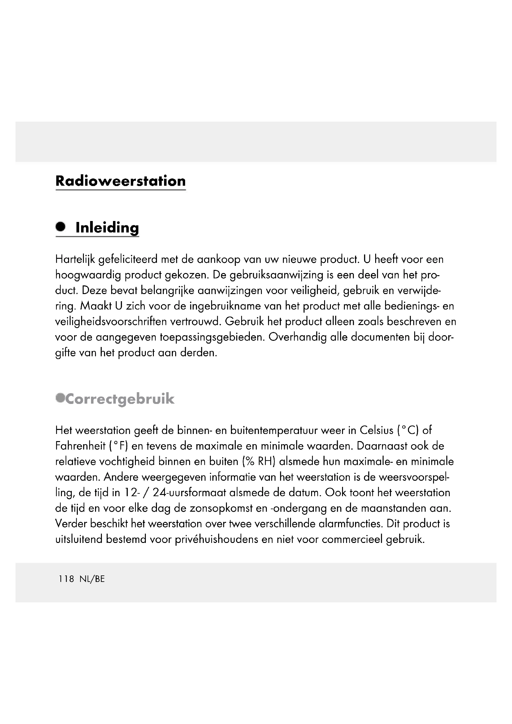 Tijdzone / Tijd / Datum / Taal handmatig instellen ............................... Pagina 130 Wektijd instellen ..................................................................................... Pagina 132 Wekfunctie activeren / deactiveren ...................................................... Pagina 133 Alarmsignaal uitschakelen ..................................................................... Pagina 134 SNOOZE-functie .................................................................................... Pagina 134 Weersverwachting in gebruik nemen ................................................... Pagina 134 Standplaats kiezen ................................................................................. Pagina 136 Standplaats handmatig kiezen .............................................................. Pagina 137 Maanfasen ............................................................................................. Pagina 141117 NL/BE Luchtdruk van de afgelopen 12 uur aflezen ........................................ Pagina 141 Instelling van de luchtdrukweergave .................................................... Pagina 142 Kanaal instellen ...................................................................................... Pagina 143 Temperatuur en temperatuurtrend weergeven ..................................... Pagina 144 Luchtvochtigheid en luchtvochtigheidstrend weergeven ...................... Pagina 144 Maximale / minimale temperatuur / luchtvochtigheid weergeven ...... Pagina 145 Temperatuur- en vorstalarm ................................................................... Pagina 146 Temperatuur- en vorstalarm activeren / deactiveren ............................ Pagina 146 Achtergrondverlichting ........................................................................... Pagina 147 Batterij-indicator ..................................................................................... Pagina 147 Batterijen vervangen .............................................................................. Pagina 147 Storingen verhelpen ................................................................. Pagina 148 Reiniging en onderhoud ........................................................ Pagina 149 Verwijdering ................................................................................... Pagina 150 Garantie .............................................................................................. Pagina 151 Informatie .......................................................................................... Pagina 152 Conformiteitsverklaring .......................................................................... Pagina 152118 NL/BE Radioweerstation Inleiding Hartelijk gefeliciteerd met de aankoop van uw nieuwe product. U heeft voor een hoogwaardig product gekozen. De gebruiksaanwijzing is een deel van het pro- duct. Deze bevat belangrijke aanwijzingen voor veiligheid, gebruik en verwijde- ring. Maakt U zich voor de ingebruikname van het product met alle bedienings- en veiligheidsvoorschriften vertrouwd. Gebruik het product alleen zoals beschreven en voor de aangegeven toepassingsgebieden. Overhandig alle documenten bij door- gifte van het product aan derden. Correct gebruik Het weerstation geeft de binnen- en buitentemperatuur weer in Celsius (°C) of Fahrenheit (°F) en tevens de maximale en minimale waarden. Daarnaast ook de relatieve vochtigheid binnen en buiten (% RH) alsmede hun maximale- en minimale waarden. Andere weergegeven informatie van het weerstation is de weersvoorspel- ling, de tijd in 12- / 24-uursformaat alsmede de datum. Ook toont het weerstation de tijd en voor elke dag de zonsopkomst en -ondergang en de maanstanden aan. Verder beschikt het weerstation over twee verschillende alarmfuncties. Dit product is uitsluitend bestemd voor privéhuishoudens en niet voor commercieel gebruik.119 NL/BE Onderdelenbeschrijving Weerstation: