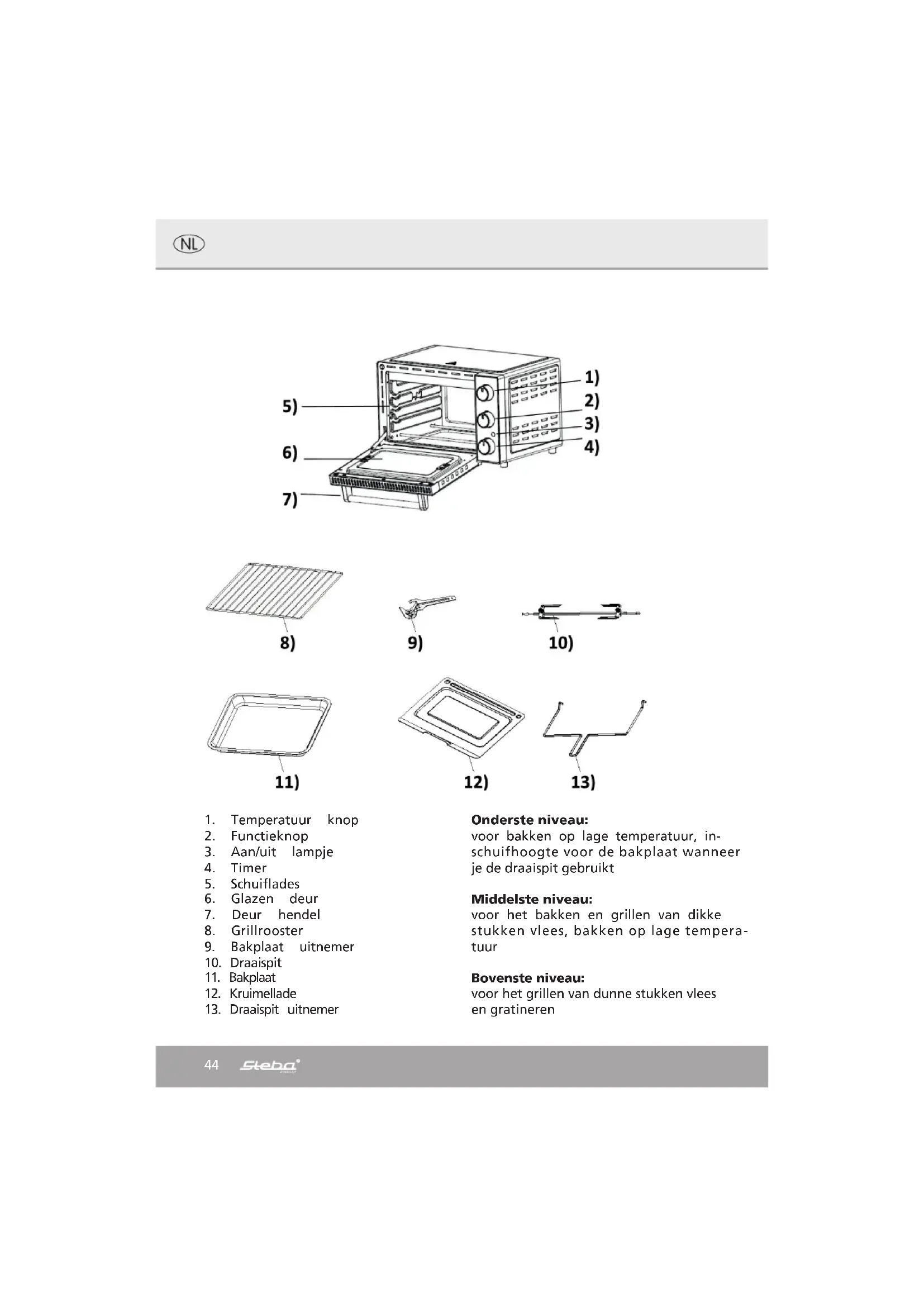 Onderste niveau: voor bakken op lage temperatuur, in- schuifhoogte voor de bakplaat wanneer je de draaispit gebruikt Middelste niveau: voor het bakken en grillen van dikke stukken vlees, bakken op lage tempera- tuur Bovenste niveau: voor het grillen van dunne stukken vlees en gratineren45 Algemeen Dit apparaat is uitsluitend bedoeld voor privé gebruik en gebru- ik binnenshuis en niet geschikt voor commerciële doeleinden. Lees de handleiding zorgvuldig en bewaar deze op een veilige plaats. Wanneer het apparaat aan iemand anders wordt gege- ven, zorg ervoor dat de handleiding ook wordt meegegeven aan deze persoon. Gebruik het apparaat alleen zoals beschreven in de handleiding en let op de veiligheidsinformatie. Geen aanspra- kelijkheid voor schade of ongelukken wordt geaccepteerd welke worden veroorzaakt door het niet opvolgen van de instructies uit de handleiding. Verwijder alle verpakking en stickers voor ge- bruik. Was alle onderdelen zorgvuldig af (zie Reinigen). Veiligheidsinformatie u Heet oppervlak! Er bestaat gevaar voor verbranding wanneer u het oppervlak aanraakt tijdens gebruik. Plaats de achterzijde van het apparaat op 10 centimeter afstand van de keukenmuur. u Sluit het apparaat aan en gebruik het in overeenstemming met de specificaties op het etiket. u Dit apparaat is geen inbouwoven en kan niet op deze manier worden gebruikt. u Niet gebruiken wanneer het snoer of stekker is beschadigd. Controleer dit voor elk gebruik. u Sluit niet aan met natte handen. u Sluit de stekker alleen aan op een correct geïnstalleerd en gem- akkelijk toegankelijk stopcontact. u Trek altijd aan de stekker en niet aan het snoer om deze uit het stopcontact te verwijderen. u Haal de stekker na elk gebruik of in het geval van storing uit het stopcontact u Trek niet aan het snoer. Trek het snoer niet over randen en buig het niet te veel. u Houd het snoer uit de buurt van hete oppervlakken.46 u Het apparaat kan worden gebruikt door kinderen van 8 jaar en ouder en door personen met beperkte fysieke, sensorische of mentale capaciteiten of gebrek aan ervaring/ kennis, op voorwaarde dat er toezicht gehouden wordt of in- structies hebben gekregen over veilig gebruik van het apparaat en bewust zijn van de gevaren die hierbij komen kijken. Kin- deren mogen de verpakking niet als speelgoed gebruiken. Rei- niging en gebruikersonderhoud mogen niet door kinderen worden uitgevoerd, tenzij ze 8 jaar of ouder zijn en onder toe- zicht staan. u Kinderen onder de 8 jaar moeten uit de buurt van het apparaat en de stroomkabel worden gehouden. u Kinderen moeten onder toezicht staan om ervoor te zorgen dat ze niet met het apparaat of verpakkingsmateriaal spelen (bij- voorbeeld plastic zakken) u Het apparaat mag niet worden bediend met behulp van een externe timer of een afzonderlijk system op afstand. u Laat het apparaat nooit onbeheerd achter tijdens gebruik. u Laat het apparaat niet buiten of in een vochtige ruimte achter. u Plaats nooit iets bovenop het apparaat en bedek de venti- latiesleuven niet. u Dompel het apparaat nooit in water. u Laat een ruimte van ongeveer 10 cm rond het apparaat vrij. u Gebruik het apparaat nooit na een storing, bijvoorbeeld als het gevallen is of op een andere manier beschadigd is geraakt. u De fabrikant is niet aansprakelijk voor de schade die ontstaat door gebruik van het apparaat op een andere manier dan be- schreven, of een fout in het gebruikt. u Om letsel te voorkomen mogen reparaties zoals het vervangen van een beschadigd snoer alleen worden uitgevoerd door een reparatiedienst. Alleen originele onderdelen mogen worden gebruikt. u Het apparaat wordt heet, verplaats deze alleen wanneer hij af- gekoeld is.47 u Gebruik het apparaat alleen zoals beschreven is in deze hand- leiding. u U mag de grill niet omwikkelen met aluminiumfolie (ophoping van warmte). u Plaats geen materialen zoals papier, karton, plastic enz. In het apparaat. u Dit apparaat is bedoeld om te gebruiken voor huishoudelijk setting, zoals: o personeelskeukens in winkels, kantoren en andere wer- komgevingen o door gasten in hotels, motels en andere type woonom- gevingen o bed & breakfast-achtige omgevingen. u Voor het eerste gebruik: reinig alle delen – behalve de ver- warmingselementen – zorgvuldig en laat deze drogen. Ver- warm het apparaat gedurende 15 minuten om de geur van ni- euwheid te elimineren. u Let op! Apparaat is heet. Gevaar voor verbran- ding! Aanraakbare oppervlakken worden heet tijdens gebruik! Plaats het apparaat op een vlak en ongevoelig oppervlak en houd een afstand van minimaal 70 centimeter tot brandbare materialen. u Tijdens gebruik kan er stoom ontsnappen. Houd handen en ge- zicht weg. u Wanneer er een verlengkabel wordt gebruikt, moet deze een doorsnede van 1,5 mm² hebben. u Als een GS-geteste 16 A multi-pin extensie wordt gebruikt, wordt deze met niet meer dan 3680 watt belast wegens brand- gevaar. u Zorg ervoor dat kinderen niet met de kabel kunnen spelen of erover struikelen. u Het apparaat moet altijd worden losgekoppeld van de stroom- voorziening als het niet onder toezicht staat en voor montage, demontage of reiniging.48 u Let op: druipend vet kan eenvoudig ontbranden op de ver- warmingselementen, grill nooit zonder bakplaat! Wanneer de bakplaat wordt uitgenomen, mors dan geen vet op de verwar- mingselementen. u Gebruik de meegeleverde uitnemer om het rooster of bakplaat te verwijderen. u Reinig na elk gebruik. u Plaats altijd de kruimellade onder de onderste verwarmingse- lementen. u Hygiëne: Maak altijd het apparaat schoon om bacteriën en schimmelvorming te voorkomen. Reiniging u Let op! Haal de stekker uit het stopcontact voordat u hem schoonmaakt en laat hem eerst afkoelen. u Dompel het apparaat nooit onder in water. u Vetresten moeten worden verwijderd om hygiënische en brand- gevaarlijke redenen. u Gebruik geen schuurmiddelen, ovenspray of oplosmiddelen. u Reinig de behuizing en de binnenzijde met een vochtige doek met afwasmiddel, maak het glas schoon met glasreiniger en droog 