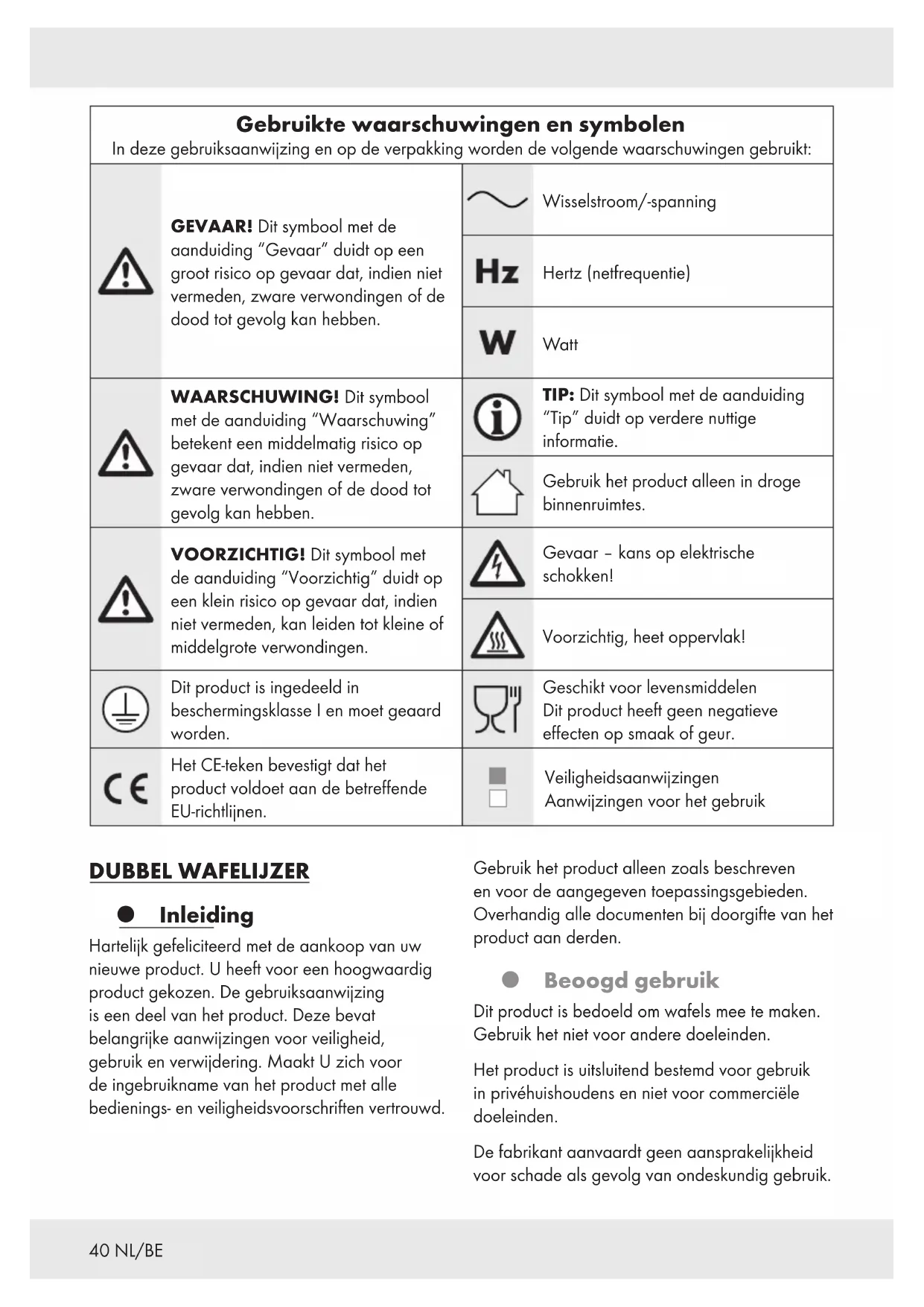 KINDEREN! Laat kinderen nooit zonder toezicht achter met het verpakkingsmateriaal. Het verpakkingsmateriaal vormt een verstikkingsgevaar. Kinderen onderschatten vaak de daaraan verbonden gevaren. Houd kinderen altijd uit de buurt van verpakkingsmateriaal. Dit product mag door kinderen vanaf 8jaar alsmede door personen met verminderde fy- sieke, sensorische of geestelijke vermogens of gebrek aan erva-42 NL/BE ring en kennis alleen gebruikt worden als ze onder supervisie staan of geïnstrueerd zijn wat betreft veilig gebruik van het product en begrepen hebben welke gevaren uit dat gebruik voortvloeien. Kinderen mogen niet met het product spelen. Reiniging en onderhoud door de gebruiker mogen niet zonder toezicht door kinderen worden uitgevoerd. Kinderen jonger dan 8jaar moeten uit de buurt van het product en het aansluitsnoer worden gehouden. Beoogd gebruik