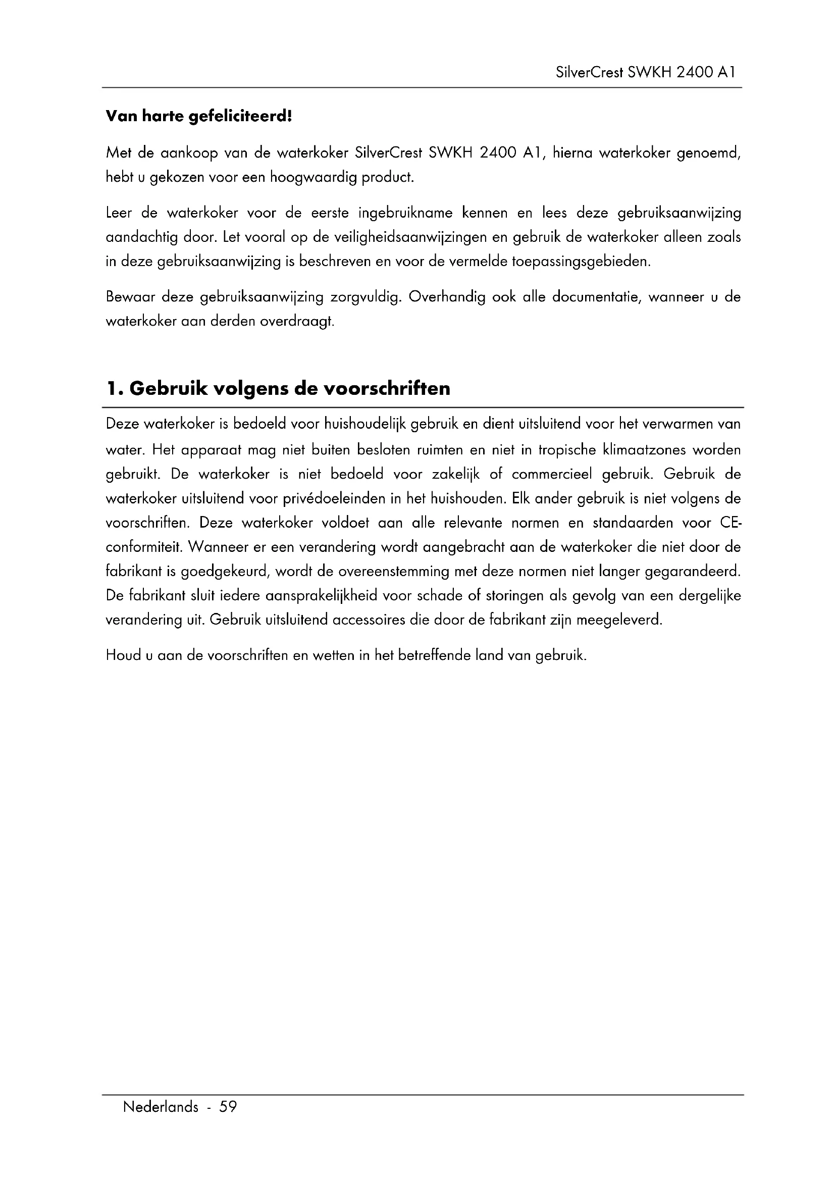 12. Garantiebepalingen ................................................................................... 74SilverCrest SWKH 2400 A1 Nederlands - 59 Van harte gefeliciteerd! Met de aankoop van de waterkoker SilverCrest SWKH 2400 A1, hierna waterkoker genoemd, hebt u gekozen voor een hoogwaardig product. Leer de waterkoker voor de eerste ingebruikname kennen en lees deze gebruiksaanwijzing aandachtig door. Let vooral op de veiligheidsaanwijzingen en gebruik de waterkoker alleen zoals in deze gebruiksaanwijzing is beschreven en voor de vermelde toepassingsgebieden. Bewaar deze gebruiksaanwijzing zorgvuldig. Overhandig ook alle documentatie, wanneer u de waterkoker aan derden overdraagt.