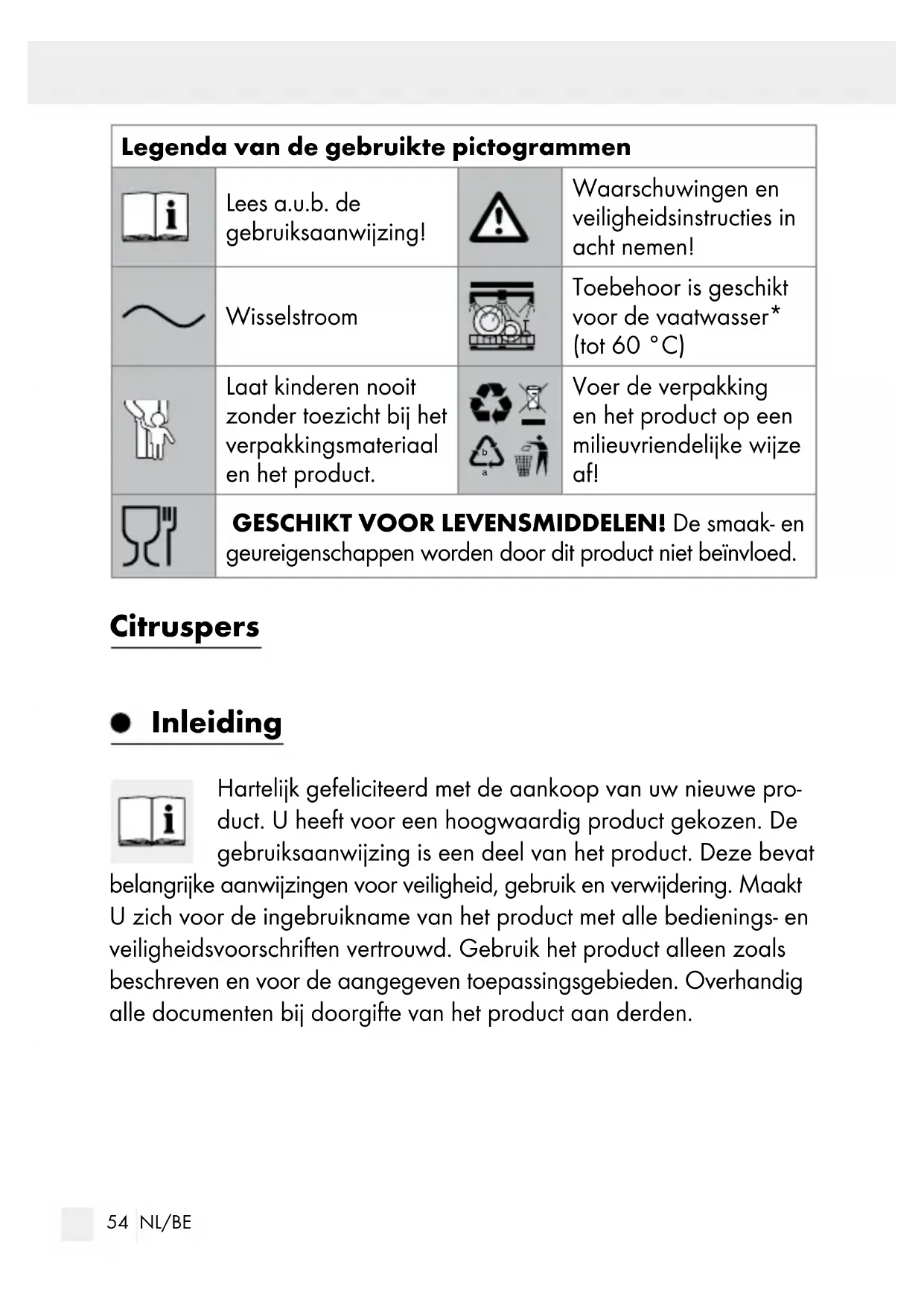 Voer de verpakking en het product op een milieuvriendelijke wijze af! GESCHIKT VOOR LEVENSMIDDELEN! De smaak- en geureigenschappen worden door dit product niet beïnvloed. Citruspers Inleiding Hartelijk gefeliciteerd met de aankoop van uw nieuwe pro- duct. U heeft voor een hoogwaardig product gekozen. De gebruiksaanwijzing is een deel van het product. Deze bevat belangrijke aanwijzingen voor veiligheid, gebruik en verwijdering. Maakt U zich voor de ingebruikname van het product met alle bedienings- en veiligheidsvoorschriften vertrouwd. Gebruik het product alleen zoals beschreven en voor de aangegeven toepassingsgebieden. Overhandig alle documenten bij doorgifte van het product aan derden.55 NL/BE Doelmatig gebruik Het product is uitsluitend bestemd voor het uitpersen van citrusvruchten. Een ander gebruik dan tevoren beschreven of een verandering van het product is niet toegestaan en leidt tot schade aan het product. De fabri- kant is niet aansprakelijk voor schade die terug te voeren is op ondoel- matig gebruik. Het product is niet bestemd voor commercieel gebruik. Beschrijving van de onderdelen