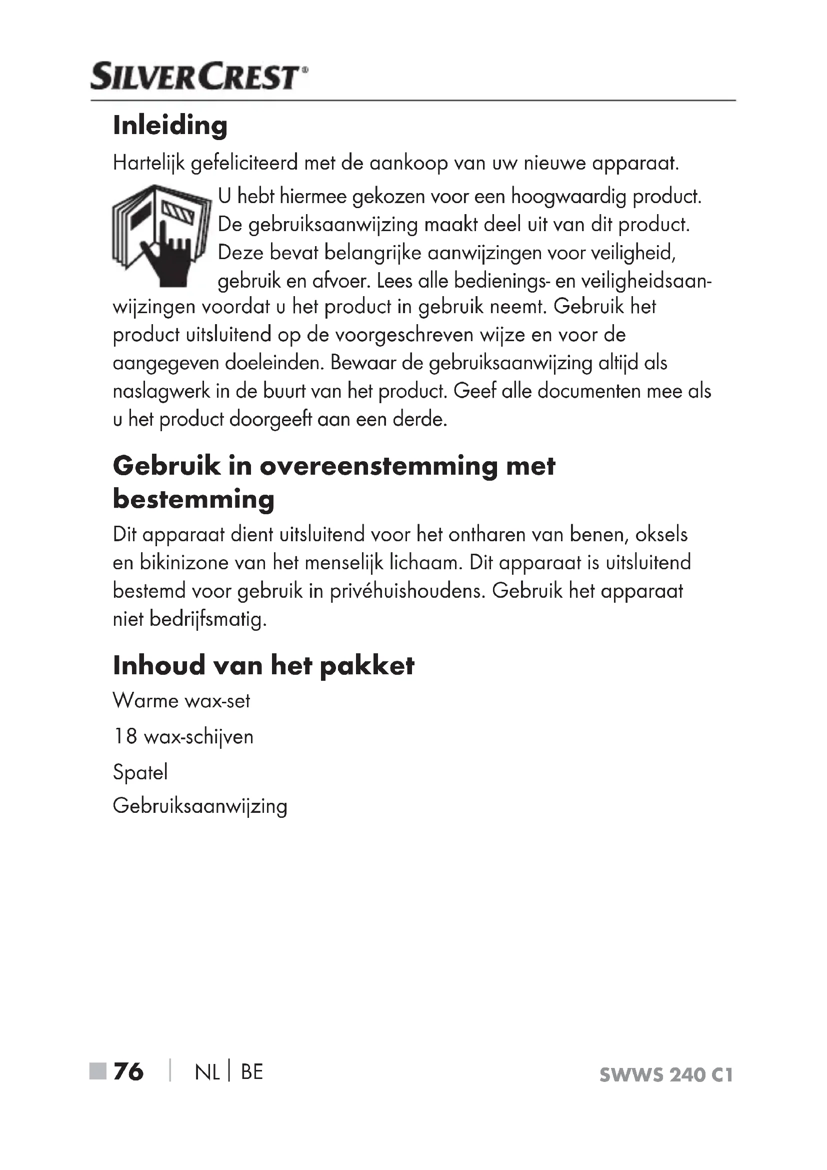 SWWS 240 C1 Inleiding Hartelijk gefeliciteerd met de aankoop van uw nieuwe apparaat. U hebt hiermee gekozen voor een hoogwaardig product. De gebruiksaanwijzing maakt deel uit van dit product. Deze bevat belangrijke aanwijzingen voor veiligheid, gebruik en afvoer. Lees alle bedienings- en veiligheidsaan- wijzingen voordat u het product in gebruik neemt. Gebruik het product uitsluitend op de voorgeschreven wijze en voor de aangegeven doeleinden. Bewaar de gebruiksaanwijzing altijd als naslagwerk in de buurt van het product. Geef alle documenten mee als u het product doorgeeft aan een derde. Gebruik in overeenstemming met bestemming Dit apparaat dient uitsluitend voor het ontharen van benen, oksels en bikinizone van het menselijk lichaam. Dit apparaat is uitsluitend bestemd voor gebruik in privéhuishoudens. Gebruik het apparaat niet bedrijfsmatig. Inhoud van het pakket Warme wax-set 18 wax-schijven Spatel Gebruiksaanwijzing IB_339566_SWWS240C1_LB8.indb 76 05.02.2020 14:43:52NL