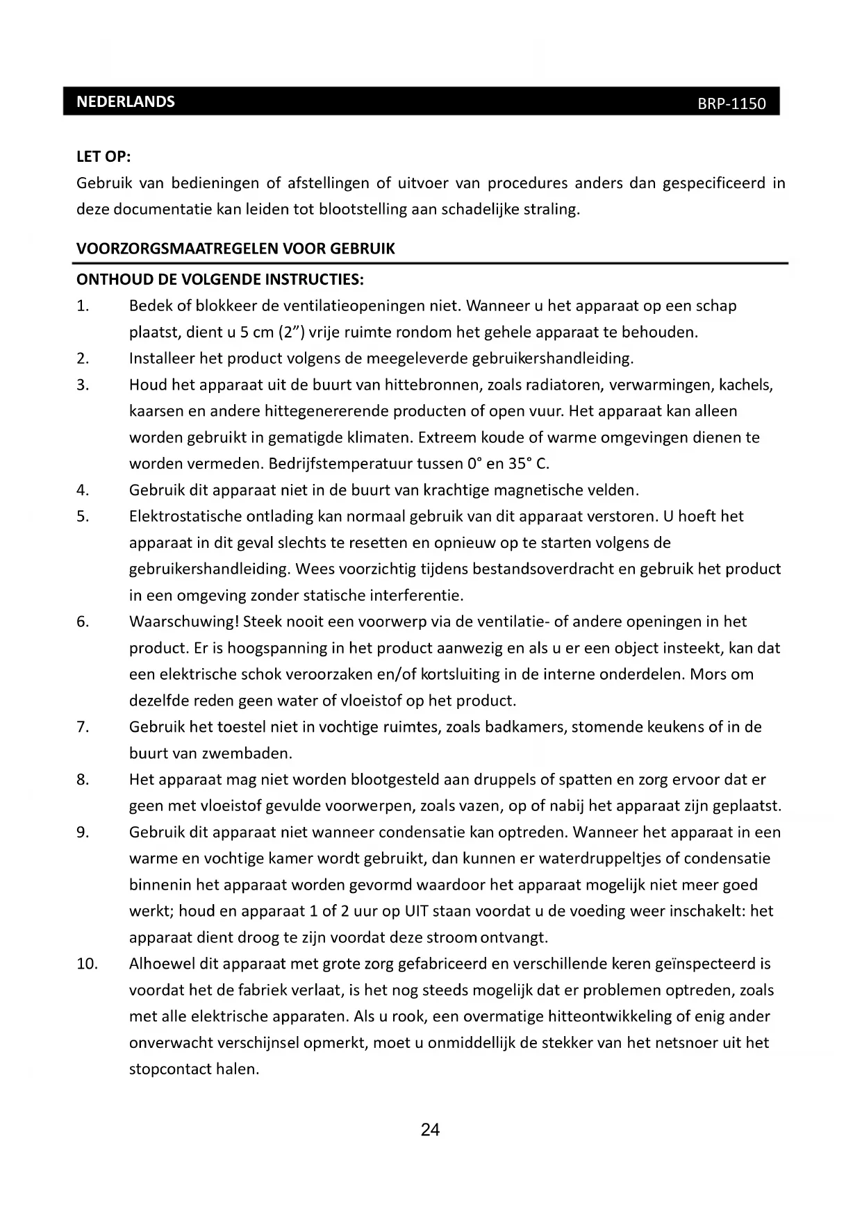 verwarmingen,kachels, kaarsenenanderehittegenererendeproductenofopenvuur.Hetapparaatkanalleen wordengebruiktingematigdeklimaten.Extreemkoudeofwarmeomgevingendienente wordenvermeden.Bedrijfstemperatuurtussen0°en35°C.