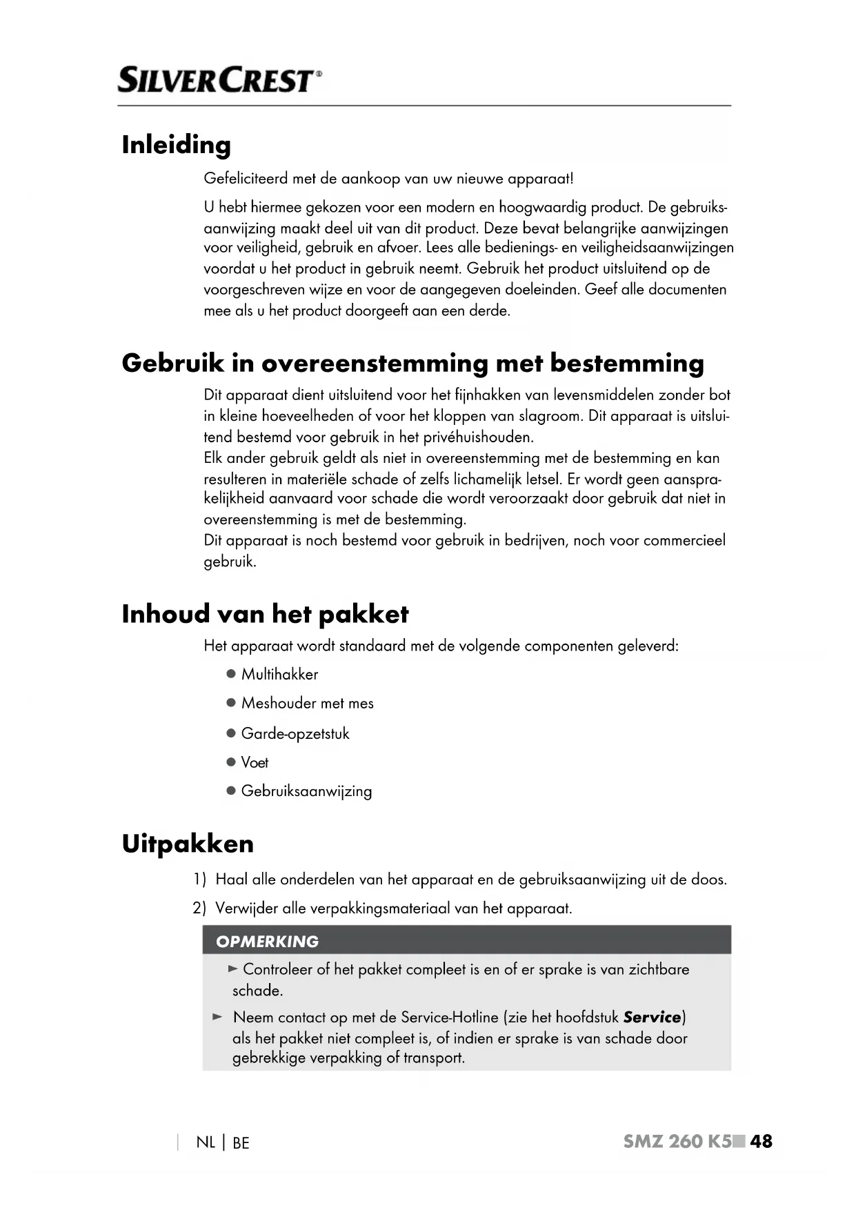 OPMERKING ► Controleer of het pakket compleet is en of er sprake is van zichtbare schade. ► Neem contact op met de Service-Hotline (zie het hoofdstuk Service) als het pakket niet compleet is, of indien er sprake is van schade door gebrekkige verpakking of transport.SMZ 260 K5 NL