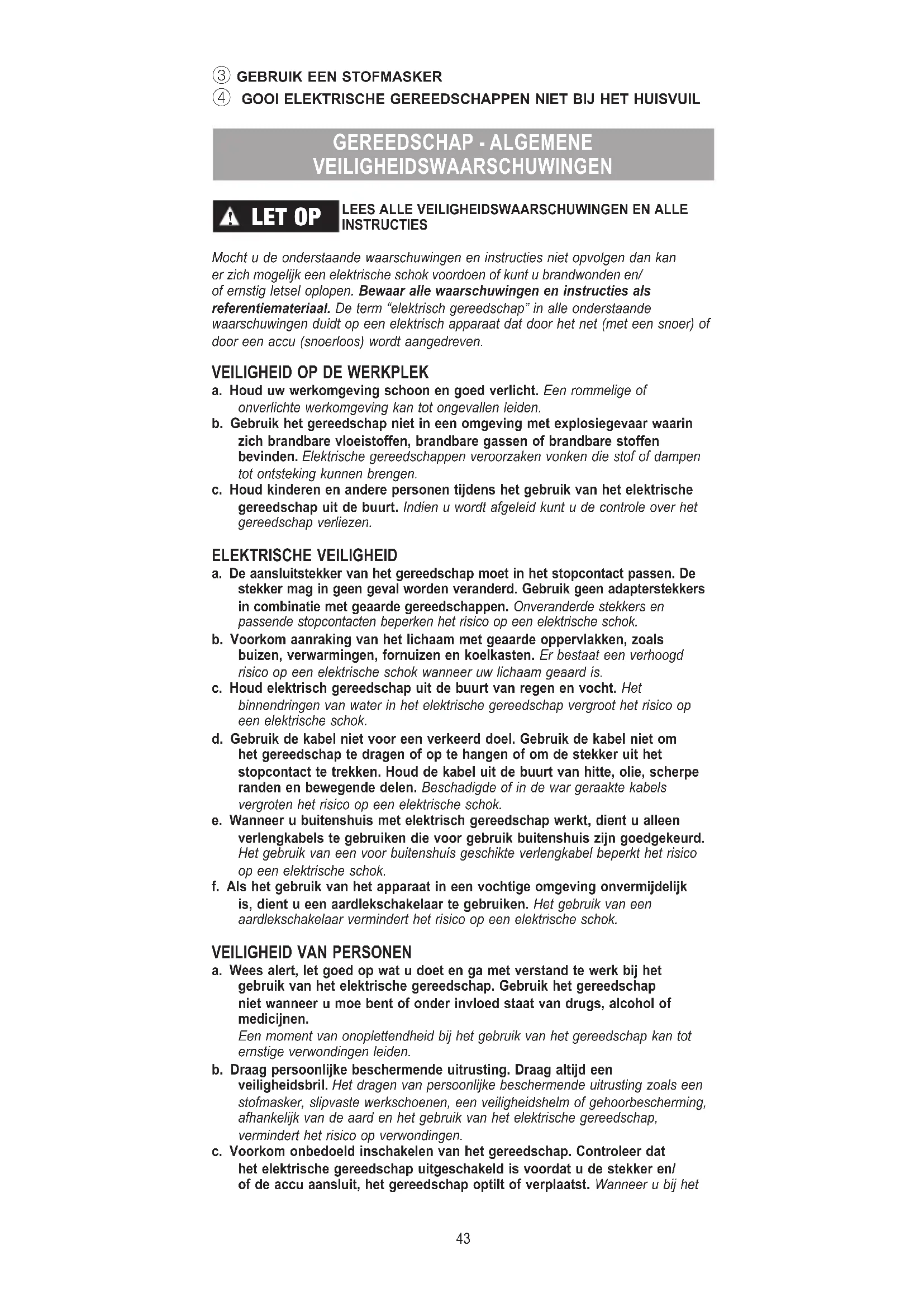 a. Houd uw werkomgeving schoon en goed verlicht. Een rommelige of onverlichte werkomgeving kan tot ongevallen leiden.b. Gebruik het gereedschap niet in een omgeving met explosiegevaar waarin zich brandbare vloeistoffen, brandbare gassen of brandbare stoffen bevinden. Elektrische gereedschappen veroorzaken vonken die stof of dampen tot ontsteking kunnen brengen.c. Houd kinderen en andere personen tijdens het gebruik van het elektrische gereedschap uit de buurt. Indien u wordt afgeleid kunt u de controle over het gereedschap verliezen. ELEKTRISCHE VEILIGHEID a. De aansluitstekker van het gereedschap moet in het stopcontact passen. De stekker mag in geen geval worden veranderd. Gebruik geen adapterstekkers in combinatie met geaarde gereedschappen. Onveranderde stekkers en passende stopcontacten beperken het risico op een elektrische schok.b. Voorkom aanraking van het lichaam met geaarde oppervlakken, zoals buizen, verwarmingen, fornuizen en koelkasten. Er bestaat een verhoogd risico op een elektrische schok wanneer uw lichaam geaard is.c. Houd elektrisch gereedschap uit de buurt van regen en vocht. Het binnendringen van water in het elektrische gereedschap vergroot het risico op een elektrische schok.d. Gebruik de kabel niet voor een verkeerd doel. Gebruik de kabel niet om het gereedschap te dragen of op te hangen of om de stekker uit het stopcontact te trekken. Houd de kabel uit de buurt van hitte, olie, scherpe randen en bewegende delen. Beschadigde of in de war geraakte kabels vergroten het risico op een elektrische schok.e. Wanneer u buitenshuis met elektrisch gereedschap werkt, dient u alleen verlengkabels te gebruiken die voor gebruik buitenshuis zijn goedgekeurd. Het gebruik van een voor buitenshuis geschikte verlengkabel beperkt het risico op een elektrische schok.f. Als het gebruik van het apparaat in een vochtige omgeving onvermijdelijk is, dient u een aardlekschakelaar te gebruiken. Het gebruik van een aardlekschakelaar vermindert het risico op een elektrische schok.