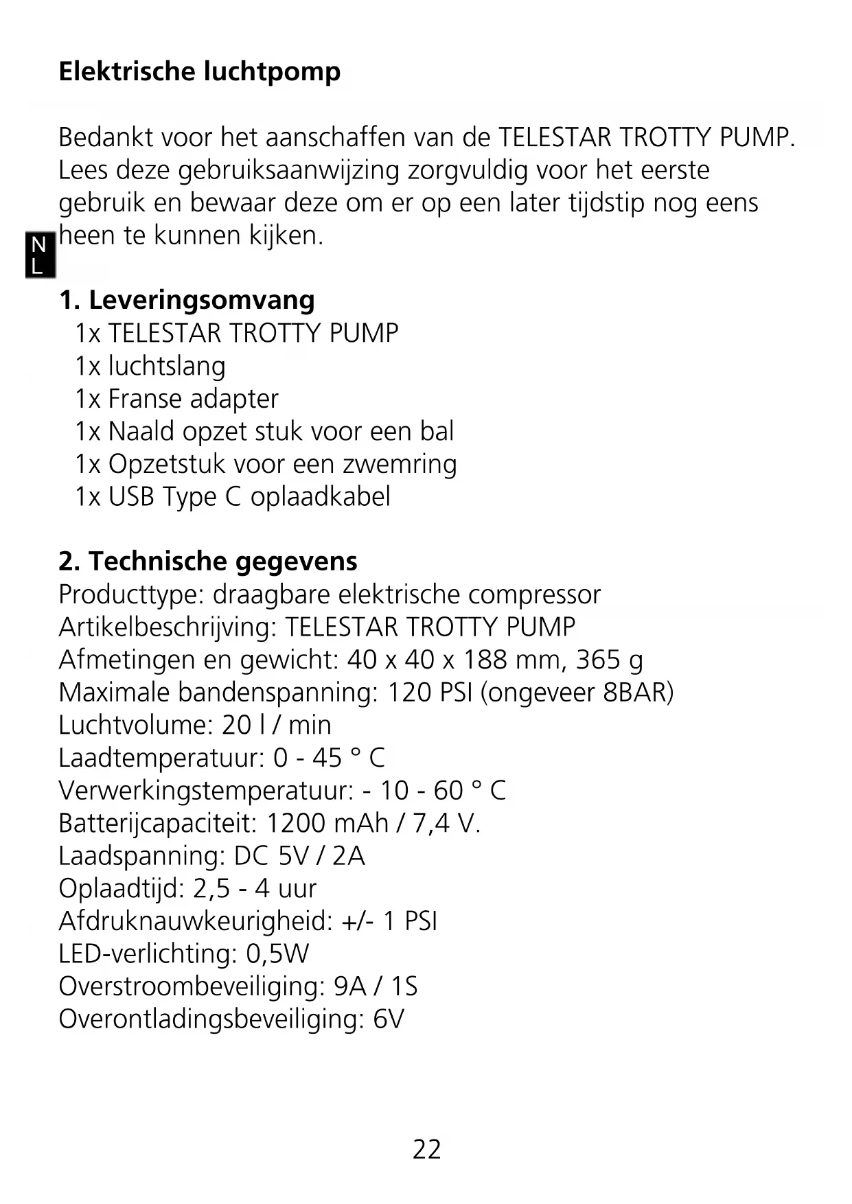 Elektrische luchtpomp Bedankt voor het aanschaffen van de TELESTAR TROTTY PUMP. Lees deze gebruiksaanwijzing zorgvuldig voor het eerste gebruik en bewaar deze om er op een later tijdstip nog eens heen te kunnen kijken.