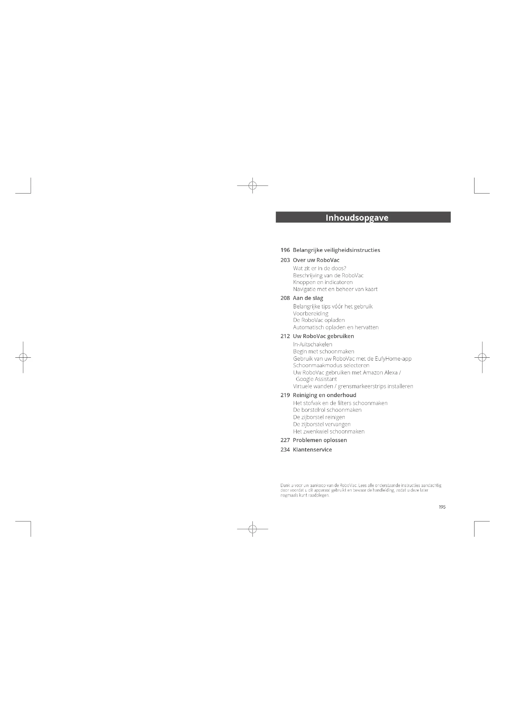 Specifiche Ingresso 24 V 1 A Tensione della batteria 14,4 V Consumo energetico 60 W Tipo di batteria 14,4 V Agli ioni di litio da 5.200 mAh (tipico) Capacità del contenitore della polvere 0,6 L Durata della pulizia Max. 150 minuti Durata della ricarica 240 - 300 min Ingresso 24 V 1 A Uscita 24 V 1 A195 Dank u voor uw aankoop van de RoboVac. Lees alle onderstaande instructies aandachtig door voordat u dit apparaat gebruikt en bewaar de handleiding, zodat u deze later nogmaals kunt raadplegen. Inhoudsopgave 196 Belangrijkeveiligheidsinstructies 203 OveruwRoboVac Wat zit er in de doos? Beschrijving van de RoboVac Knoppen en indicatoren Navigatie met en beheer van kaart 208 Aandeslag Belangrijke tips vóór het gebruik Voorbereiding De RoboVac opladen Automatisch opladen en hervatten 212 UwRoboVacgebruiken In-/uitschakelen Begin met schoonmaken Gebruik van uw RoboVac met de EufyHome-app Schoonmaakmodus selecteren Uw RoboVac gebruiken met Amazon Alexa / Google Assistant Virtuele wanden / grensmarkeerstrips installeren 219 Reinigingenonderhoud Het stofvak en de lters schoonmaken De borstelrol schoonmaken De zijborstel reinigen De zijborstel vervangen Het zwenkwiel schoonmaken 227 Problemenoplossen 234 KlantenserviceNederlands Nederlands