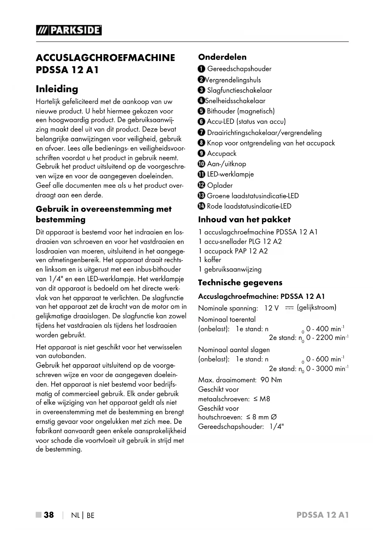 ACCUSLAGCHROEFMACHINE PDSSA 12 A1 Inleiding Hartelijk gefeliciteerd met de aankoop van uw nieuwe product. U hebt hiermee gekozen voor een hoogwaardig product. De gebruiksaanwij- zing maakt deel uit van dit product. Deze bevat belangrijke aanwijzingen voor veiligheid, gebruik en afvoer. Lees alle bedienings- en veiligheidsvoor- schriften voordat u het product in gebruik neemt. Gebruik het product uitsluitend op de voorgeschre- ven wijze en voor de aangegeven doeleinden. Geef alle documenten mee als u het product over- draagt aan een derde. Gebruik in overeenstemming met bestemming Dit apparaat is bestemd voor het indraaien en los- draaien van schroeven en voor het vastdraaien en losdraaien van moeren, uitsluitend in het aangege- ven afmetingenbereik. Het apparaat draait rechts- en linksom en is uitgerust met een inbus-bithouder van 1/4" en een LED-werklampje. Het werklampje van dit apparaat is bedoeld om het directe werk- vlak van het apparaat te verlichten. De slagfunctie van het apparaat zet de kracht van de motor om in gelijkmatige draaislagen. De slagfunctie kan zowel tijdens het vastdraaien als tijdens het losdraaien worden gebruikt. Het apparaat is niet geschikt voor het verwisselen van autobanden. Gebruik het apparaat uitsluitend op de voorge- schreven wijze en voor de aangegeven doelein- den. Het apparaat is niet bestemd voor bedrijfs- matig of commercieel gebruik. Elk ander gebruik of elke wijziging van het apparaat geldt als niet in overeenstemming met de bestemming en brengt ernstig gevaar voor ongelukken met zich mee. De fabrikant aanvaardt geen enkele aansprakelijkheid voor schade die voortvloeit uit gebruik in strijd met de bestemming. Onderdelen Gereedschapshouder Vergrendelingshuls Slagfunctieschakelaar Snelheidsschakelaar Bithouder (magnetisch) Accu-LED (status van accu) Draairichtingschakelaar/vergrendeling Knop voor ontgrendeling van het accupack Accupack Aan-/uitknop LED-werklampje Oplader Groene laadstatusindicatie-LED Rode laadstatusindicatie-LED Inhoud van het pakket 1 accuslagchroefmachine PDSSA 12 A1 1 accu-snellader PLG 12 A2 1 accupack PAP 12 A2 1 koffer 1 gebruiksaanwijzing Technische gegevens Accuslagchroefmachine: PDSSA 12 A1 Nominale spanning: 12 V (gelijkstroom) Nominaal toerental (onbelast): 1e stand: n