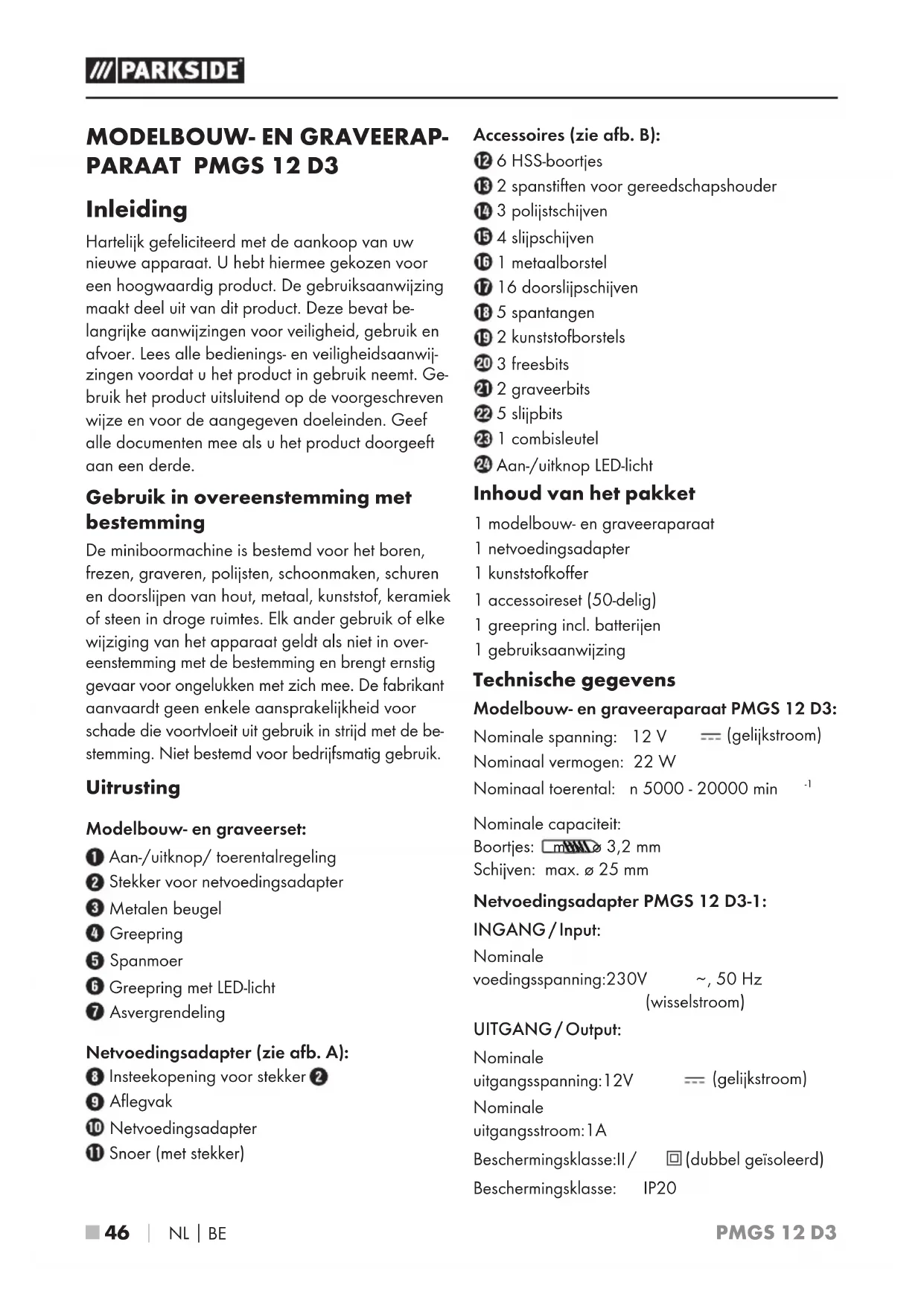 Inleiding Hartelijk gefeliciteerd met de aankoop van uw nieuwe apparaat. U hebt hiermee gekozen voor een hoogwaardig product. De gebruiksaanwijzing maakt deel uit van dit product. Deze bevat be- langrijke aanwijzingen voor veiligheid, gebruik en afvoer. Lees alle bedienings- en veiligheidsaanwij- zingen voordat u het product in gebruik neemt. Ge- bruik het product uitsluitend op de voorgeschreven wijze en voor de aangegeven doeleinden. Geef alle documenten mee als u het product doorgeeft aan een derde. Gebruik in overeenstemming met bestemming De miniboormachine is bestemd voor het boren, frezen, graveren, polijsten, schoonmaken, schuren en doorslijpen van hout, metaal, kunststof, keramiek of steen in droge ruimtes. Elk ander gebruik of elke wijziging van het apparaat geldt als niet in over- eenstemming met de bestemming en brengt ernstig gevaar voor ongelukken met zich mee. De fabrikant aanvaardt geen enkele aansprakelijkheid voor schade die voortvloeit uit gebruik in strijd met de be- stemming. Niet bestemd voor bedrijfsmatig gebruik. Uitrusting Modelbouw- en graveerset: Aan-/uitknop/ toerentalregeling Stekker voor netvoedingsadapter Metalen beugel Greepring Spanmoer Greepring met LED-licht Asvergrendeling Netvoedingsadapter (zie afb. A): Insteekopening voor stekker Aflegvak Netvoedingsadapter Snoer (met stekker) Accessoires (zie afb. B): 6 HSS-boortjes 2 spanstiften voor gereedschapshouder 3 polijstschijven 4 slijpschijven 1 metaalborstel 16 doorslijpschijven 5 spantangen 2 kunststofborstels 3 freesbits 2 graveerbits 5 slijpbits 1 combisleutel Aan-/uitknop LED-licht Inhoud van het pakket 1 modelbouw- en graveeraparaat 1 netvoedingsadapter 1 kunststofkoffer 1 accessoireset (50-delig) 1 greepring incl. batterijen 1 gebruiksaanwijzing Technische gegevens Modelbouw- en graveeraparaat PMGS 12 D3: Nominale spanning: 12 V (gelijkstroom) Nominaal vermogen: 22 W Nominaal toerental: n 5000 - 20000 min
