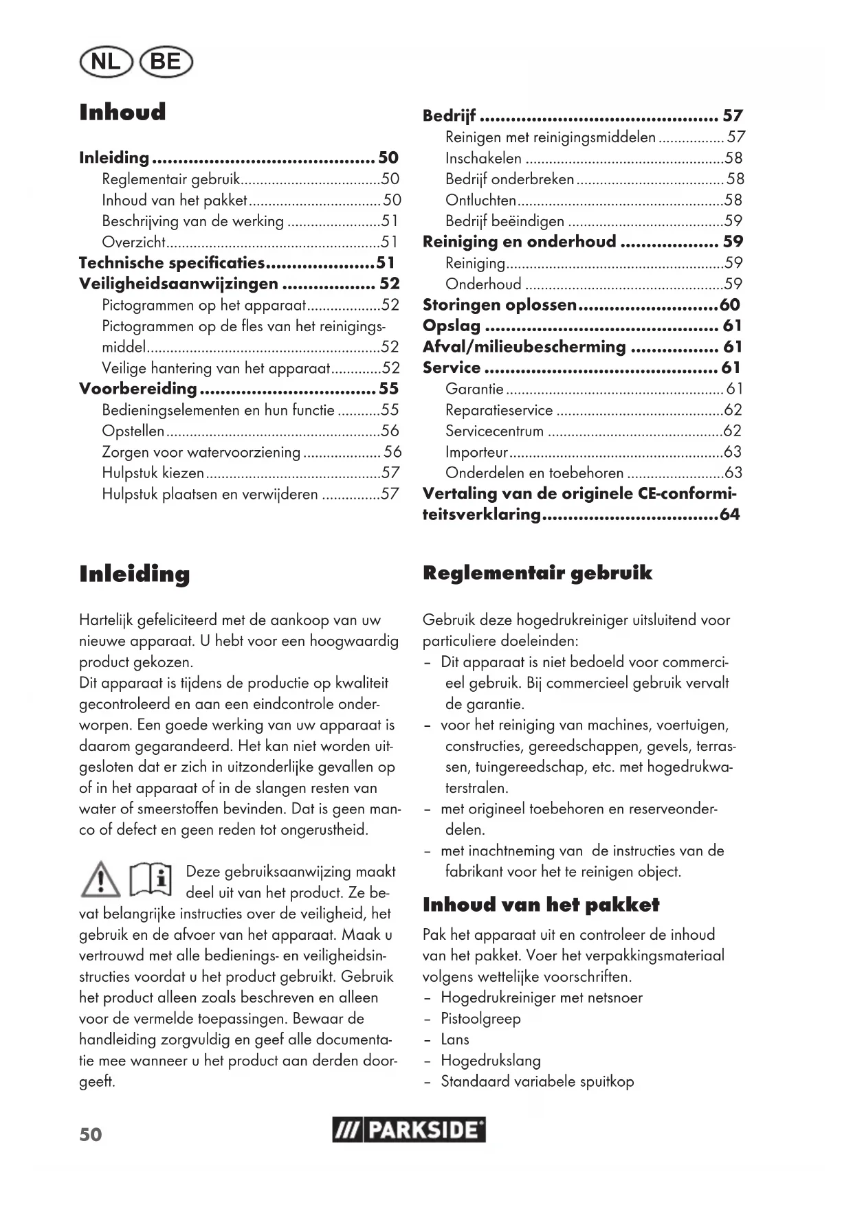 - Reglementair gebruik Gebruik deze hogedrukreiniger uitsluitend voor particuliere doeleinden: – Dit apparaat is niet bedoeld voor commerci- eel gebruik. Bij commercieel gebruik vervalt de garantie. – voor het reiniging van machines, voertuigen, constructies, gereedschappen, gevels, terras- sen, tuingereedschap, etc. met hogedrukwa- terstralen. – met origineel toebehoren en reserveonder- delen. – met inachtneming van de instructies van de fabrikant voor het te reinigen object. Inhoud van het pakket Pak het apparaat uit en controleer de inhoud van het pakket. Voer het verpakkingsmateriaal volgens wettelijke voorschriften. – Hogedrukreiniger met netsnoer – Pistoolgreep – Lans – Hogedrukslang – Standaard variabele spuitkop Inleiding Hartelijk gefeliciteerd met de aankoop van uw nieuwe apparaat. U hebt voor een hoogwaardig product gekozen. Dit apparaat is tijdens de productie op kwaliteit gecontroleerd en aan een eindcontrole onder- worpen. Een goede werking van uw apparaat is daarom gegarandeerd. Het kan niet worden uit- gesloten dat er zich in uitzonderlijke gevallen op of in het apparaat of in de slangen resten van water of smeerstoffen bevinden. Dat is geen man- co of defect en geen reden tot ongerustheid. Deze gebruiksaanwijzing maakt deel uit van het product. Ze be- vat belangrijke instructies over de veiligheid, het gebruik en de afvoer van het apparaat. Maak u vertrouwd met alle bedienings- en veiligheidsin- structies voordat u het product gebruikt. Gebruik het product alleen zoals beschreven en alleen voor de vermelde toepassingen. Bewaar de handleiding zorgvuldig en geef alle documenta- tie mee wanneer u het product aan derden door- geeft. Inhoud Inleiding 50 Reglementair gebruik p. 50