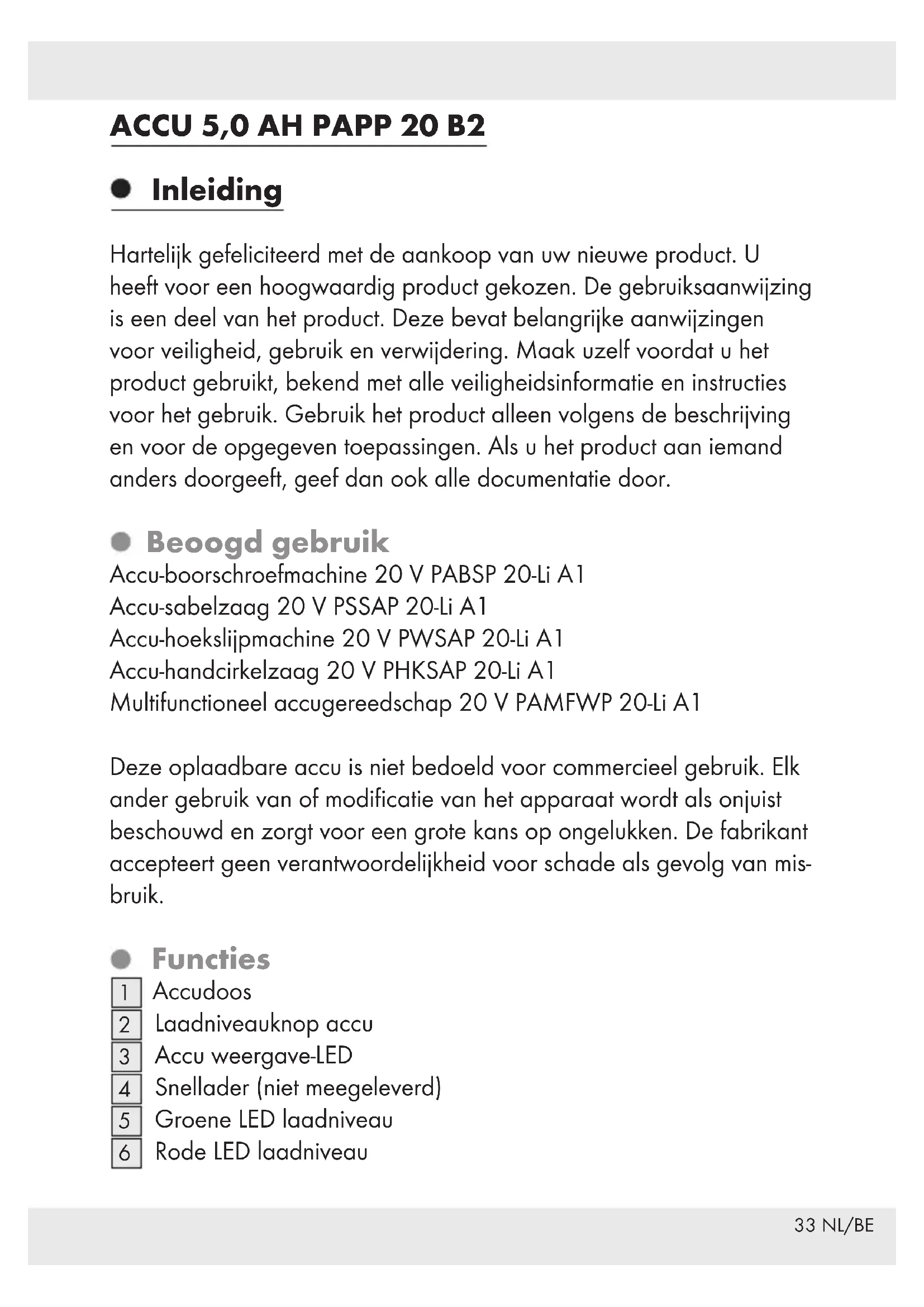Inleiding Hartelijk gefeliciteerd met de aankoop van uw nieuwe product. U heeft voor een hoogwaardig product gekozen. De gebruiksaanwijzing is een deel van het product. Deze bevat belangrijke aanwijzingen voor veiligheid, gebruik en verwijdering. Maak uzelf voordat u het product gebruikt, bekend met alle veiligheidsinformatie en instructies voor het gebruik. Gebruik het product alleen volgens de beschrijving en voor de opgegeven toepassingen. Als u het product aan iemand anders doorgeeft, geef dan ook alle documentatie door. Beoogd gebruik Accu-boorschroefmachine 20 V PABSP 20-Li A1 Accu-sabelzaag 20 V PSSAP 20-Li A1 Accu-hoekslijpmachine 20 V PWSAP 20-Li A1 Accu-handcirkelzaag 20 V PHKSAP 20-Li A1 Multifunctioneel accugereedschap 20 V PAMFWP 20-Li A1 Deze oplaadbare accu is niet bedoeld voor commercieel gebruik. Elk ander gebruik van of modificatie van het apparaat wordt als onjuist beschouwd en zorgt voor een grote kans op ongelukken. De fabrikant accepteert geen verantwoordelijkheid voor schade als gevolg van mis- bruik. Functies