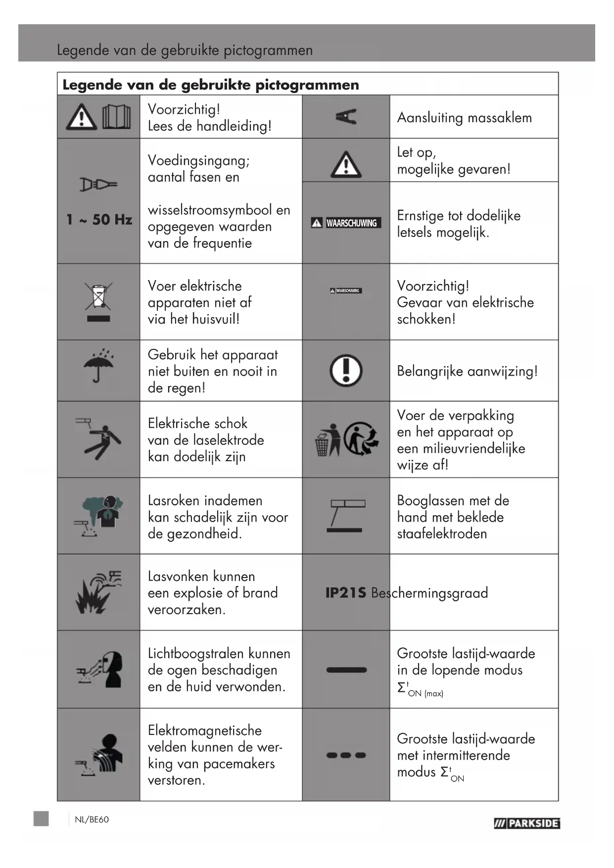 ONNL/BE 61 Legende van de gebruikte pictogrammen / Inleiding Elektrisch lasapparaat PESG 120 B4 z Inleiding Hartelijk gefeliciteerd! U hebt gekozen voor een van onze hoogwaardige apparaten. Leer het product voor de eerste ingebruikname kennen. Lees hiertoe aandachtig de volgende hand- leiding en de veiligheidsvoorschriften. De ingebruikname van dit gereedschap mag alleen door geïnstrueerde personen gebeuren.