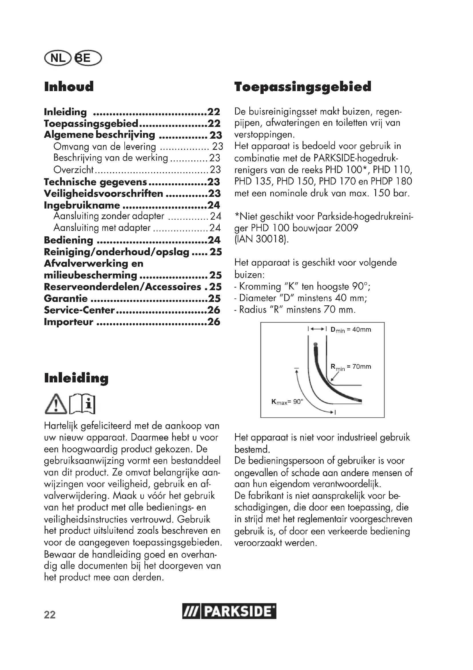 Niet geschikt voor Parkside-hogedrukreini- ger PHD 100 bouwjaar 2009 (IAN 30018). Het apparaat is geschikt voor volgende buizen: - Kromming “K” ten hoogste 90°; - Diameter “D” minstens 40 mm; - Radius “R” minstens 70 mm. min D = 40mm min R = 70mm K = 90° max Het apparaat is niet voor industrieel gebruik bestemd. De bedieningspersoon of gebruiker is voor ongevallen of schade aan andere mensen of aan hun eigendom verantwoordelk. De fabrikant is niet aansprakelk voor be- schadigingen, die door een toepassing, die in strd met het reglementair voorgeschreven gebruik is, of door een verkeerde bediening veroorzaakt werden. Inhoud Inleiding ...................................22 Toepassingsgebied
