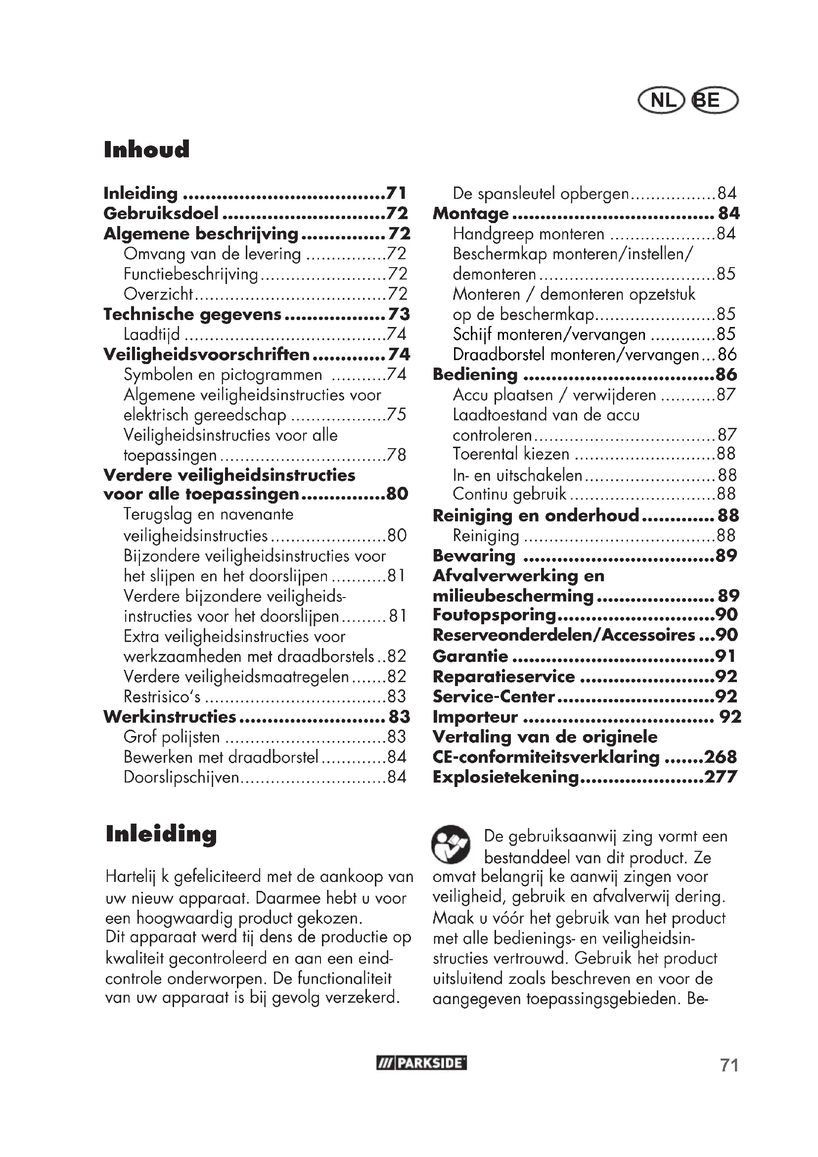 - Schakel het apparaat uit en haal de accu uit het apparaat - om een geblokkeerd gebruikt werktuig los te maken, - als de elektrische leiding beschadigd of verstrikt is, - bij abnormale geluiden. Restrisico‘s Ook als u dit elektrische gereedschap zoals voorgeschreven bedient, blijven er altijd restrisico’s bestaan. Volgende geva- ren kunnen zich in verband met de const- ructiewijze en uitvoering van dit elektrische gereedsc hap voordoen: a) schade aan de longen, indien geen ge- schikte ademhalingsbescherming wordt gedragen. b) gehoorschade indien geen passende gehoorbescherming wordt gedragen. c) schade aan de gezondheid door - aanraking van de slijpwerktuigen in de niet afgedekte zone; - wegslingeren van delen van werkstuk- ken of beschadigde slijpschijven. d) Schade aan de gezondheid, die van hand-/armtrillingen het gevolg zijn indi- en het apparaat gedurende een lange- re periode gebruikt wor dt of niet zoals reglementair voorgeschreven beheerd en onderhouden wordt. Waarschuwing! Dit elektrische gereedschap produceert tijdens de werking een elektromagnetisch veld. Dit veld kan in bepaalde om- standigheden actieve of passieve medische implantaten in negatieve zin beïnvloeden. Om het gevaar voor ernstige of dodelijke verwon- dingen te verminderen, adviseren wij personen met medische implan- taten, hun arts en de fabrikant van het medische implantaat te raadple- gen voordat de machine bediend wordt. Werkinstructies Zorg er bij het kiezen van de opzetstukken voor dat het vermelde maximale toeges- tane toerental minstens even hoog is als het maximale to- erental dat is vermeld op het apparaat. Let bij het kiezen van de sli- jpschijf op de maximaal toe- gestane diameter en dikte. Kies een borstel met een schroefdraad van M14. Grof polijsten Gebruik nooit doorslipschij- ven voor het opruwen! Het apparaat met voorbe- werkingschijf mag slechts gebruikt worden met de ge- monteerde beschermkap. Monteer de beschermkap (7) voor grof slijpen, zie „Monteren / afstellen / demon- teren beschermkap“. Oefen slechts matige druk op het werkstuk uit. Beweeg het apparaat gelijkmatig weg en weer. Bij een werkhoek van 30° of 40° bereikt u bij het grof slijpen het beste resultaat.84 NL BE Bewerken met draadborstel Let bij het kiezen van de draadborstel altijd op het toegestane toerental. Het maximale toegestane toeren- tal van de draadborstel moet minstens even hoog zijn als het maximale toerental dat op de haakse slijpmachine is vermeld. Draag altijd een veiligheidsbril: er kunnendradenlosraken! Geschikt voor het grof verwijderen van roest, het reinigen van lasnaden en het ver- wijderen van verf. Druk de draadborstel met matige kracht tegen het te behandelen werkstuk. Overbelast de draadborstel niet door een te hoge contactdruk. Doorslipschijven Gebruik nooit ruwslijpschij- ven voor het doorslijpen ! Het apparaat met doorslip- schijf mag slechts gebruikt worden met de gemonteerde beschermkap. Voor het doorslijpen de beschermkap (7) met opzetstuk (11) monteren, zie „Monte- ren / instellen / demonteren beschermkap“ en „Monteren / demonteren opzetstuk op de beschermkap“. Er mogen alleen gekeurde, vezelstofversterk- te doorslip- of slijpschijven worden gebruikt. Werk in principe met geringe snelheid. Oe- fen slechts matige druk op het werkstuk uit. Werk steeds met parallelle bewegingen. Zo wordt het apparaat niet ongecontrole- erd uit de snede geduwd. De spansleutel opbergen De spansleutel (10) kan in de handgreep (1) worden opgeborgen, zie detail-afbeelding op de overzichtsafbeelding. Montage Let op! Gevaar voor verwondingen! - Zorg ervoor dat u voldoende plaats te heeft om te werken en andere personen niet in gevaar brengt. - Voor ingebruikname moeten alle af- dekkingen en beschermende systemen naar behoren zijn gemonteerd. - Verwijder de batterij uit het toestel voordat u aanpassingen aan het ap- paraat verricht. Handgreep monteren Het apparaat mag slechts gebruikt worden met de ge- monteerde handgreep. Schroef de handgreep (1) op de schroef- draad voor de handgreep. Kies de draad voor de handgreep (2) links, rechts of bo- ven op het apparaat, afhankelijk van hoe u werkt.85 NL BE Beschermkap monteren/ instellen/demonteren Stel de beschermkap zo op dat een vonken- regen of geloste delen noch de gebruiker noch omstaande personen kunnen treffen. De opstelling van de beschermkap moet ook zo gebeuren dat de vonkenregen geen brandbare delen, ook omliggende, kan doen ontvlammen. Snij-/slijpschijf/borstel de- monteren: