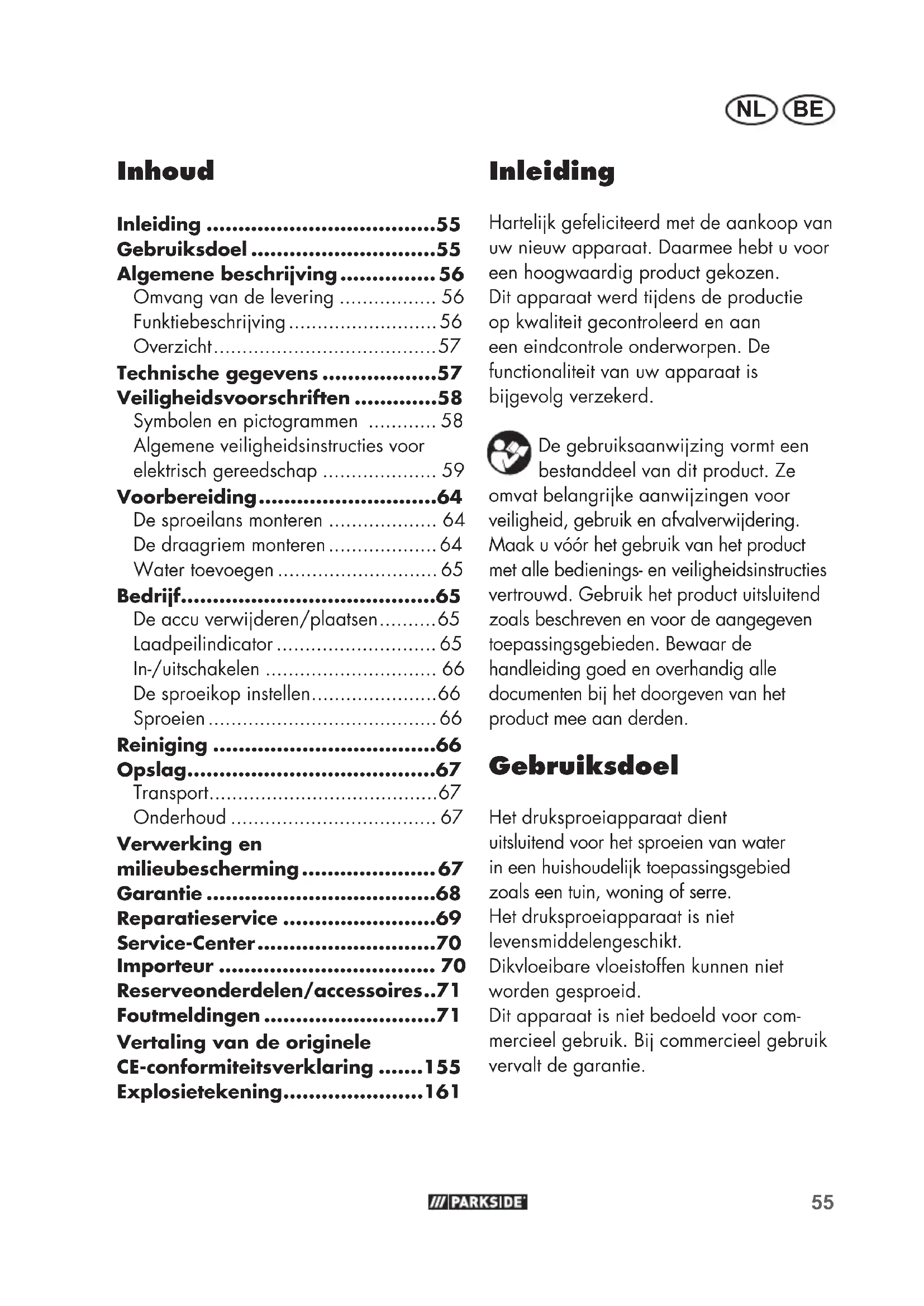 Pos. Désignation ......................................................Article n° 9 Sangle de transport .................................................... 91106073 7+8+22 Lance de pulvérisation avec gicleur + Écrou de serrage du tube de pulvérisation ................. 91106072 6 Support de la lance de pulvérisation ............................ 91106071 1+2+3+23 Poignée de pistolet complète ....................................... 91106070 11 Bouchon à vis ...........................................................9110606855 BENL Inhoud Inleiding ....................................55 Gebruiksdoel .............................55 Algemene beschrijving ............... 56 Omvang van de levering ................. 56 Funktiebeschrijving .......................... 56 Overzicht ....................................... 57 Technische gegevens ..................57 Veiligheids voorschriften .............58 Symbolen en pictogrammen ............ 58 Algemene veiligheidsinstructies voor elektrisch gereedschap .................... 59 Voorbereiding ............................64 De sproeilans monteren ................... 64 De draagriem monteren ................... 64 Water toevoegen ............................ 65 Bedrijf ........................................65 De accu verwijderen/plaatsen .......... 65 Laadpeilindicator ............................ 65 In-/uitschakelen .............................. 66 De sproeikop instellen ...................... 66 Sproeien ........................................ 66 Reiniging ...................................66 Opslag .......................................67 Transport ........................................ 67 Onderhoud .................................... 67 Verwerking en milieubescherming ..................... 67 Garantie ....................................68 Reparatieservice ........................69 Service-Center ............................70 Importeur .................................. 70 Reserveonderdelen/accessoires ..71 Foutmeldingen ...........................71 Inleiding Hartelijk gefeliciteerd met de aankoop van uw nieuw apparaat. Daarmee hebt u voor een hoogwaardig product gekozen. Dit apparaat werd tijdens de productie op kwaliteit gecontroleerd en aan een eindcontrole onderworpen. De functionaliteit van uw apparaat is bijgevolg verzekerd. De gebruiksaanwijzing vormt een bestanddeel van dit product. Ze omvat belangrijke aanwijzingen voor veiligheid, gebruik en afvalverwijdering. Maak u vóór het gebruik van het product met alle bedienings- en veiligheidsinstructies vertrouwd. Gebruik het product uitsluitend zoals beschreven en voor de aangegeven toepassingsgebieden. Bewaar de handleiding goed en overhandig alle documenten bij het doorgeven van het product mee aan derden. Gebruiksdoel Het druksproeiapparaat dient uitsluitend voor het sproeien van water in een huishoudelijk toepassingsgebied zoals een tuin, woning of serre. Het druksproeiapparaat is niet levensmiddelengeschikt. Dikvloeibare vloeistoffen kunnen niet worden gesproeid. Dit apparaat is niet bedoeld voor com- mercieel gebruik. Bij commercieel gebruik vervalt de garantie. Vertaling van de originele CE-conformiteitsverklaring .......155 Explosietekening ......................16156 BENL Als oneigenlijk gebruik geldt meer bepaald het sproeien van: - oplosmiddelen; - oplosmiddelhoudende vloeistoffen; - gewasbeschermingsmiddelen; - onkruidverdelgers; - ontsmettingsmiddelen; - meststoffen; - olie, vet; - verf, beits; - impregneermiddelen; - licht ontvlambare vloeistoffen; - bijtende vloeistoffen zoals zuur of loog; Minderjarigen mogen niet met het apparaat werken, behalve dan jongeren van 16 jaar en ouder die onder toezicht worden opgeleid. De bediener of gebruiker van het ap- paraat is verantwoordelijk voor ongeluk- ken of schades aan andere personen of hun eigendom. De producent is niet verantwoordelk voor beschadigingen, die door onrechtmatig gebruik of verkeerde bediening worden veroorzaakt. Elke andere toepassing, die in deze hand- leiding niet uitdrukkelk wordt toegelaten, kan schade aan het apparaat aanrichten en kan een ernstig gevaar voor de gebrui- ker betekenen. Het apparaat maakt deel uit van de Parkside-reeksen X 12 V TEAM en X20VTEAM en kan met accu‘s van de Parkside-reeks X 12 V TEAM dan wel X20VTEAM worden gebruikt. De accu‘s mogen alleen met originele la- ders van de Parkside-reeks X12VTEAM of X 20 VTEAM worden geladen. Algemene beschrijving De afbeeldingen bevinden zich op de uitvouwpagina‘s. Omvang van de levering Pak het apparaat uit en controleer, of de inhoud volledig is. - Accu-druksproeier - Sproeilans: Pistoolgreep met buis Sproeibuis met sproeikop - Gebruiksaanwijzing Batterij en lader zijn niet inbegrepen. Zorg voor een reglementair voorgeschreven afvalverwijdering van het verpakkingsmateriaal. Funktiebeschrijving Met de sproeilans kan het water in het reservoir doelgericht op planten of oppervlakken worden aangebracht. De werking van de verschillende bedieningselementen wordt hieronder beschreven.57 BENL Overzicht 1 Pistoolgreep 2 Activeringshendel 3 Metaalbuis 4 Slang 5 Riembevestiging 6 Houder voor sproeilans 7 Sproeilans 8 Sproeikop 9 Draagriem 10 Reservoir 11 Schroefsluiting 12 Draaggreep 13 Klemmoer slangaansluiting 14 Veerbehuizing 15 Accu-deksel 16 Schaal 17 Aan-/uitschakelaar 18 LED-laadpeilindicator 19 Accuschacht 20 Ontgrendelingstoets 21 Accu 22 Klemmoer sproeibuis 23 Verbindingsstuk 24 Lengteregeling draagriem 25 Accuvak 12V 26 Accuvak 20V 27 Accu-regelknop Technische gegevens 12 en 20 V-accu- druksproeier....................... PDSA 20-Li A1 Spanning: ............... motor 12 V/20 V DC Pomp: Maximale druk ..........................1,5 bar Debiet: ....................350 ml/min (water) Reikwijdte: .............................. 50-60 cm Sproeihoek: ......................................45° Reservoirgehalte/nominaal volumen: .... 5 l Technisch restvolume: .....................<0,1 l Gewicht (leeg, zonder accu): m