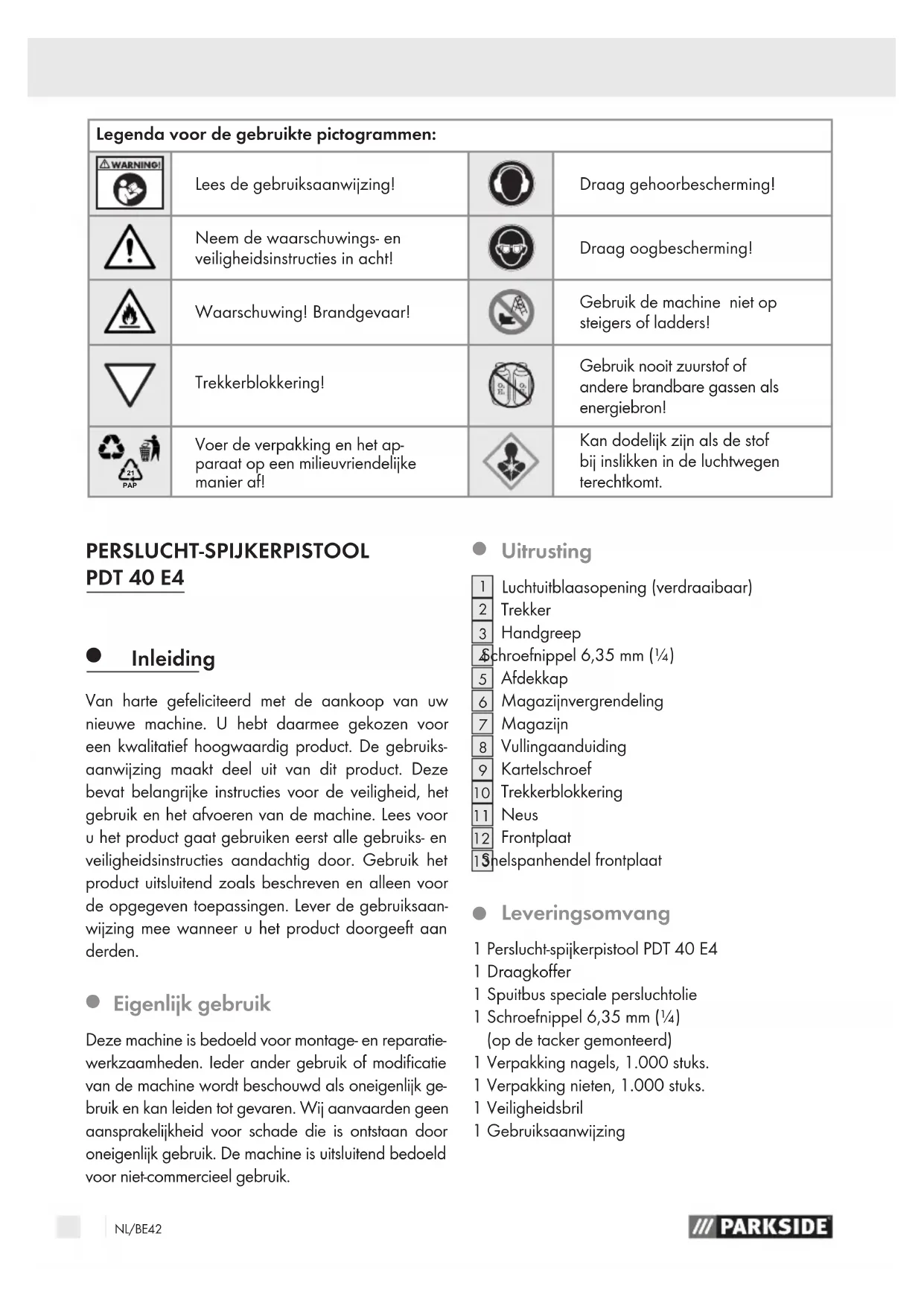 Luchtuitblaasopening (verdraaibaar) Trekker Handgreep Schroefnippel 6,35 mm (¼) Afdekkap Magazijnvergrendeling Magazijn Vullingaanduiding Kartelschroef Trekkerblokkering Neus Frontplaat Snelspanhendel frontplaat Leveringsomvang 1 Perslucht-spijkerpistool PDT 40 E4 1 Draagkoffer 1 Spuitbus speciale persluchtolie 1 Schroefnippel 6,35 mm (¼) (op de tacker gemonteerd) 1 Verpakking nagels, 1.000 stuks. 1 Verpakking nieten, 1.000 stuks. 1 Veiligheidsbril 1 Gebruiksaanwijzing Lees de gebruiksaanwijzing! Neem de waarschuwings- en veiligheidsinstructies in acht! Waarschuwing! Brandgevaar! Draag gehoorbescherming! Draag oogbescherming! Trekkerblokkering! Gebruik de machine niet op steigers of ladders! Gebruik nooit zuurstof of andere brandbare gassen als energiebron! Voer de verpakking en het ap- paraat op een milieuvriendelijke manier af! Legenda voor de gebruikte pictogrammen: