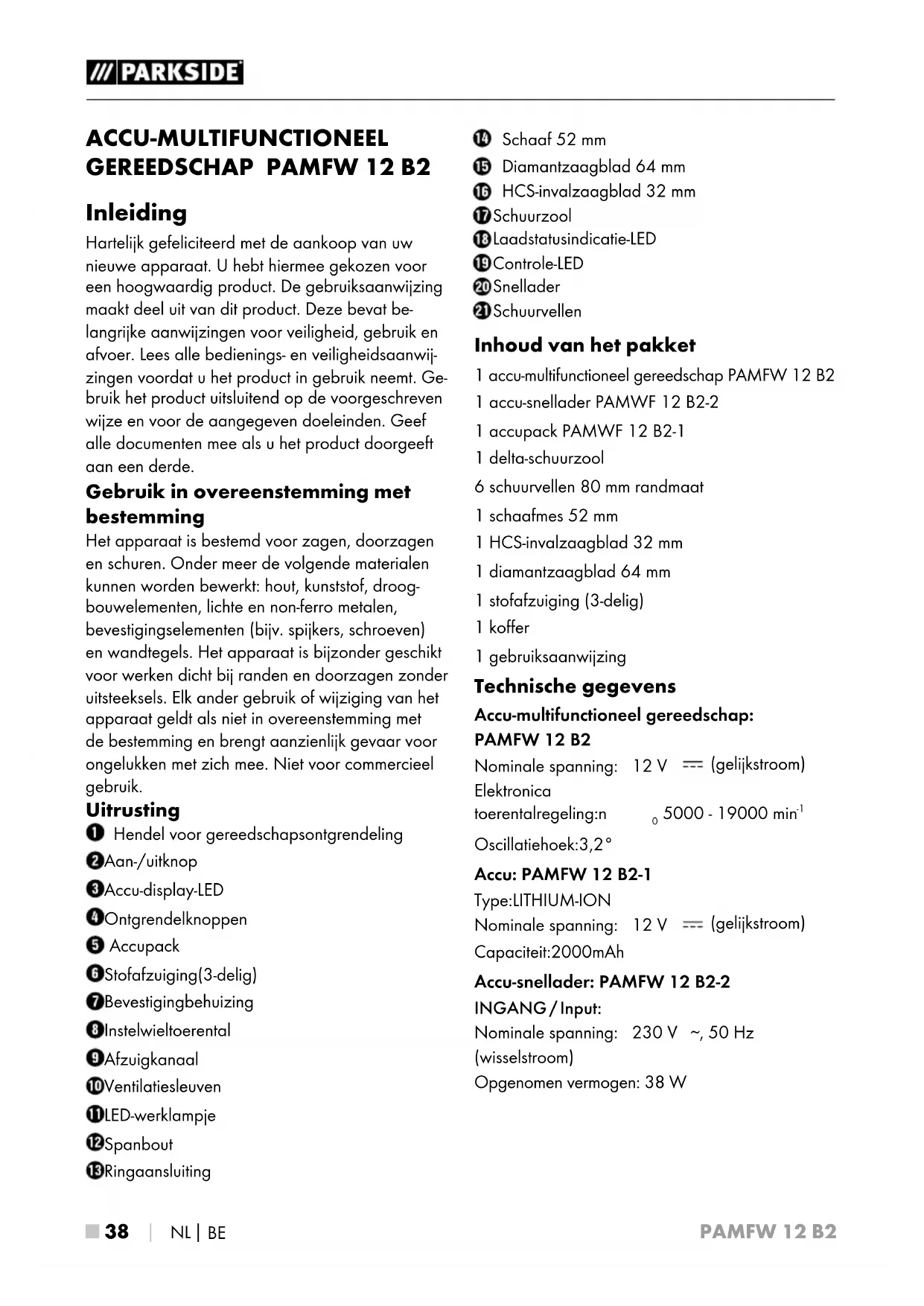 Inleiding Hartelijk gefeliciteerd met de aankoop van uw nieuwe apparaat. U hebt hiermee gekozen voor een hoogwaardig product. De gebruiksaanwijzing maakt deel uit van dit product. Deze bevat be- langrijke aanwijzingen voor veiligheid, gebruik en afvoer. Lees alle bedienings- en veiligheidsaanwij- zingen voordat u het product in gebruik neemt. Ge- bruik het product uitsluitend op de voorgeschreven wijze en voor de aangegeven doeleinden. Geef alle documenten mee als u het product doorgeeft aan een derde. Gebruik in overeenstemming met bestemming Het apparaat is bestemd voor zagen, doorzagen en schuren. Onder meer de volgende materialen kunnen worden bewerkt: hout, kunststof, droog- bouwelementen, lichte en non-ferro metalen, bevestigingselementen (bijv. spijkers, schroeven) en wandtegels. Het apparaat is bijzonder geschikt voor werken dicht bij randen en doorzagen zonder uitsteeksels. Elk ander gebruik of wijziging van het apparaat geldt als niet in overeenstemming met de bestemming en brengt aanzienlijk gevaar voor ongelukken met zich mee. Niet voor commercieel gebruik. Uitrusting Hendel voor gereedschapsontgrendeling Aan-/uitknop Accu-display-LED Ontgrendelknoppen Accupack Stofafzuiging (3-delig) Bevestiging behuizing Instelwiel toerental Afzuigkanaal Ventilatiesleuven LED-werklampje Spanbout Ringaansluiting Schaaf 52 mm Diamantzaagblad 64 mm HCS-invalzaagblad 32 mm Schuurzool Laadstatusindicatie-LED Controle-LED Snellader Schuurvellen Inhoud van het pakket 1 accu-multifunctioneel gereedschap PAMFW 12 B2 1 accu-snellader PAMWF 12 B2-2 1 accupack PAMWF 12 B2-1 1 delta-schuurzool 6 schuurvellen 80 mm randmaat 1 schaafmes 52 mm 1 HCS-invalzaagblad 32 mm 1 diamantzaagblad 64 mm 1 stofafzuiging (3-delig) 1 koffer 1 gebruiksaanwijzing Technische gegevens Accu-multifunctioneel gereedschap: PAMFW 12 B2 Nominale spanning: 12 V (gelijkstroom) Elektronica toerentalregeling: n