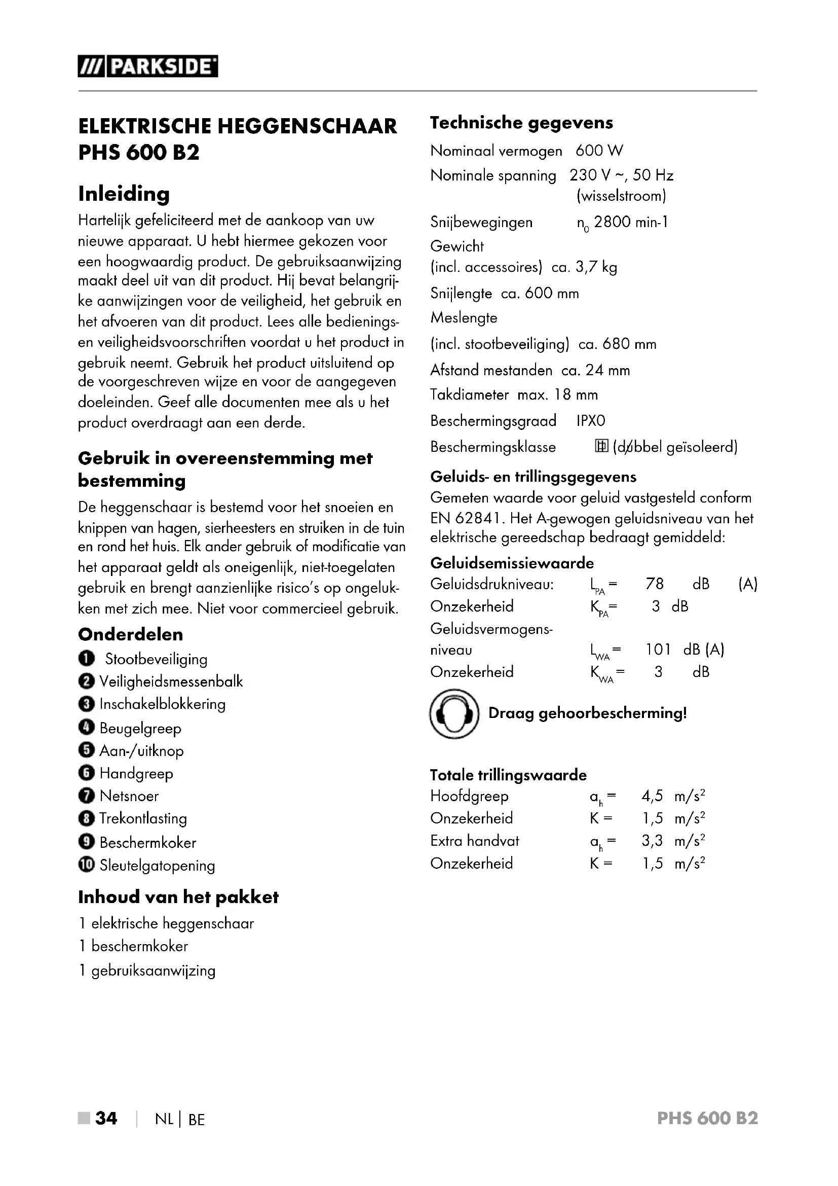 PHS 600 B2 ELEKTRISCHE HEGGENSCHAAR PHS 600 B2 Inleiding Hartelijk gefeliciteerd met de aankoop van uw nieuwe apparaat. U hebt hiermee gekozen voor een hoogwaardig product. De gebruiksaanwijzing maakt deel uit van dit product. Hij bevat belangrij- ke aanwijzingen voor de veiligheid, het gebruik en het afvoeren van dit product. Lees alle bedienings- en veiligheidsvoorschriften voordat u het product in gebruik neemt. Gebruik het product uitsluitend op de voorgeschreven wijze en voor de aangegeven doeleinden. Geef alle documenten mee als u het product overdraagt aan een derde. Gebruik in overeenstemming met bestemming De heggenschaar is bestemd voor het snoeien en knippen van hagen, sierheesters en struiken in de tuin en rond het huis. Elk ander gebruik of modificatie van het apparaat geldt als oneigenlijk, niet-toegelaten gebruik en brengt aanzienlijke risico’s op ongeluk- ken met zich mee. Niet voor commercieel gebruik. Onderdelen Stootbeveiliging Veiligheidsmessenbalk Inschakelblokkering Beugelgreep Aan-/uitknop Handgreep Netsnoer Trekontlasting Beschermkoker Sleutelgatopening Inhoud van het pakket 1 elektrische heggenschaar 1 beschermkoker 1 gebruiksaanwijzing Technische gegevens Nominaal vermogen 600 W Nominale spanning 230 V ∼, 50 Hz (wisselstroom) Snijbewegingen n