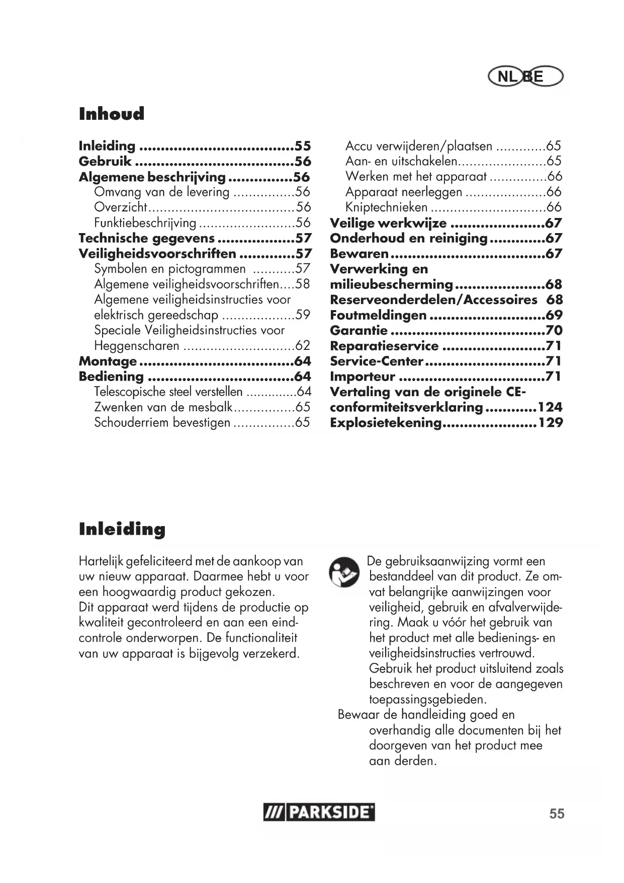 - Explosietekening De gebruiksaanwzing vormt een bestanddeel van dit product. Ze om- vat belangrke aanwzingen voor veiligheid, gebruik en afvalverwde- ring. Maak u vóór het gebruik van het product met alle bedienings- en veiligheidsinstructies vertrouwd. Gebruik het product uitsluitend zoals beschreven en voor de aangegeven toepassingsgebieden. Bewaar de handleiding goed en overhandig alle documenten b het doorgeven van het product mee aan derden.56 NL BE Gebruik De machine is enkel voor het knippen en maaien van heggen, struiken en sierhees-ters op privégebied geschikt. Elk ander ge-bruik, dat in deze gebruiksaanwzing niet uitdrukkelk wordt vermeld, kan schade aan de machine veroorzaken en een ern-stig gevaar voor de gebruiker betekenen.Het apparaat is bedoeld voor gebruik door volwassenen. Jongeren boven 16 jaar mogen het apparaat enkel onder toe-zicht gebruiken. Gebruik de heggenschaar niet als het regent of als de heg nat is.De gebruiker is voor ongevallen of schade aan derden aansprakelk.De producent is niet verantwoordelk voor beschadigingen, die door onrechtmatig gebruik of verkeerde bediening worden veroorzaakt. Gebruik de machine niet als het mes stomp is. Stark versiete mes-balk kann schade aan de machine veroorzaken. Mesbalk regelmatig laten slpen.Het apparaat maakt deel uit van de serie Parkside X20V TEAM en kan met accu’s van de serie X20VTEAM worden ge-bruikt. De accu’s mogen alleen met laders van de serie Parkside X20VTEAM wor-den geladen. Algemene beschrving De afbeeldingen kunt u vinden op de voorste uitklappagina.Omvang van de levering- Telescopische accuheggenschaar (tweedelig)- Messenbescherming- Schouderriem- Inbussleutel- Gebruiksaanwzing De accu en de lader zijn niet meegeleverd!Overzicht p. 129
