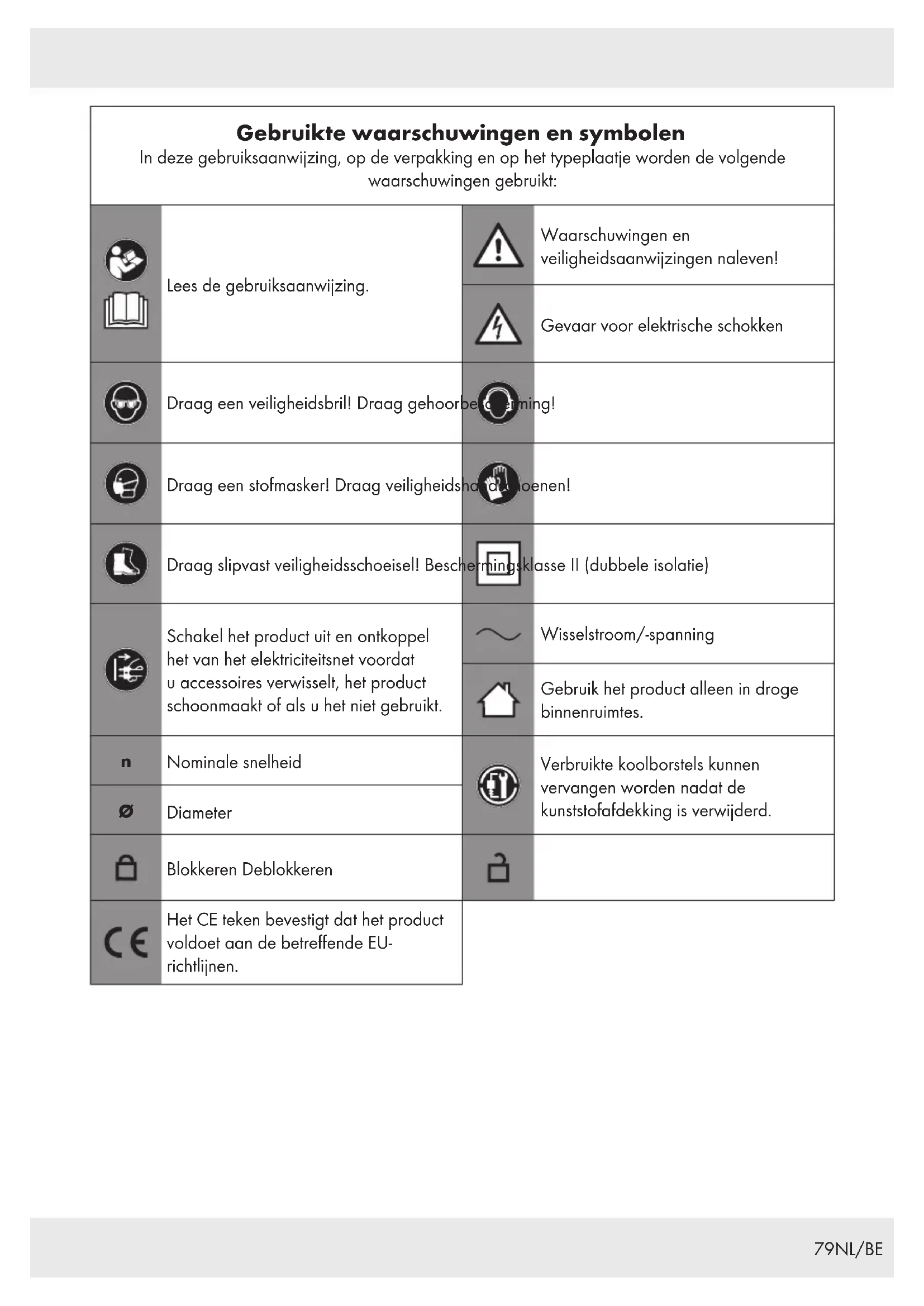 Diameter Blokkeren Deblokkeren Het CE teken bevestigt dat het product voldoet aan de betreffende EU- richtlijnen.80 NL/BE WAND- EN PLAFONDSCHUURMACHINE Inleiding Hartelijk gefeliciteerd met de aankoop van uw nieuwe product. U heeft voor een hoogwaardig product gekozen. De gebruiksaanwijzing is een deel van het product. Deze bevat belangrijke aanwijzingen voor veiligheid, gebruik en verwijdering. Maakt U zich voor de ingebruikname van het product met alle bedienings- en veiligheidsvoorschriften vertrouwd. Gebruik het product alleen zoals beschreven en voor de aangegeven toepassingsgebieden. Overhandig alle documenten bij doorgifte van het product aan derden. Beoogd gebruik Deze wand- en plafondschuurmachine (hierna “product” of “elektrisch apparaat” genoemd) is geschikt voor de volgende toepassingen: Oppervlaktevoorbereiding voor verven/ behangen: – Schuren van geprimerde of gepleisterde gipswanden – Houten wanden/plafonds (natuurlijk hout of multiplex) schuren Ongewenste reststoffen verwijderen: – Behangresten – Verfresten – Coatingen/lijm – Los pleisterwerk Gebruik het product niet voor de volgende toepassingen: Behang verwijderen Metaal doorsnijden of slijpen Ruwslijpen of polijsten Asbesthoudende materialen schuren Gebruik het product niet in een vochtige omgeving. Gebruik het product niet samen met staalborstels of gelijksoortige accessoires. Gebruik altijd een schuurblad van het juiste type, overeenkomstig het gebruiksdoel. Let bij de aankoop en het gebruik van schuurbladen op de technische vereisten van het product (zie “Technische gegevens” en “Schuurblad selecteren”). De LED-werklampen op dit product dienen voor de verlichting van de directe werkomgeving. Andere manieren van gebruik of veranderingen van het product worden beschouwd als onjuist en kunnen risico’s zoals levensgevaar, verwondingen en beschadigingen met zich meebrengen. De fabrikant wijst iedere aansprakelijkheid af voor schade die is ontstaan door ander gebruik dan het beoogde. Het product is uitsluitend bestemd voor persoonlijk gebruik. Het product is niet voor commercieel gebruik of voor vergelijkbare toepassingen bestemd. Houd de hand aan alle geldende lokale veiligheidsvoorschriften, normen en verordeningen. Gebruik van elektrische apparaten die veel lawaai produceren, kan conform nationale of lokale voorschriften alleen gedurende bepaalde tijden toegestaan zijn.81NL/BE Leveringsomvang