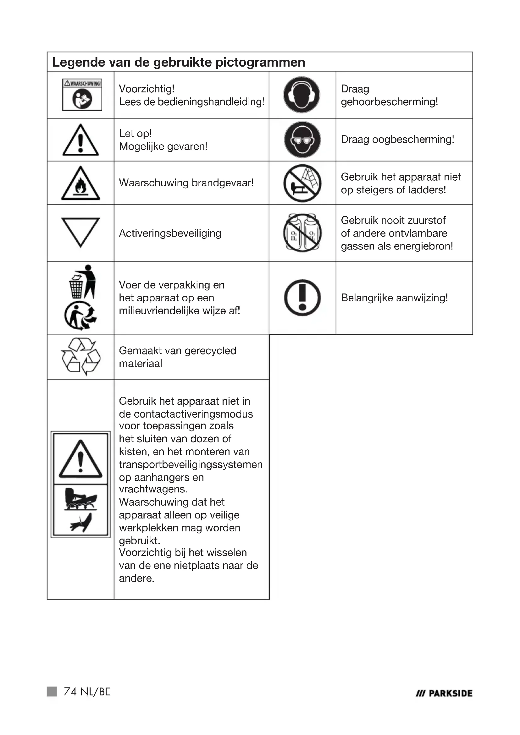 niet worden gebruikt. z Activeringssysteem LETSELGEVAAR! Gebruik het niet op steigers of ladders! Nietpistolen die zijn uitge- rust met contactactivering, moeten zijn gemarkeerd met het symbool “Niet gebruiken vanaf steigers of ladders”. Deze mogen niet worden gebruikt voor bepaalde toe- passingen, bijvoorbeeld: wanneer het wisselen van de ene nietplaats naar de andere 494747_2504_Drucklufttacker_LB8_content.indb 86494747_2504_Drucklufttacker_LB8_content.indb 86 13.08.2025 13:33:5413.08.2025 13:33:5487NL/BE plaatsvindt via steigers, trap- pen, ladders of ladderachtige constructies, zoals panlatten, of deze zijn voorzien voor het sluiten van kisten of kratten, voor het plaatsen van trans- portzekeringen, bijv. op voer- tuigen en wagons. z Aanvullende aanwijzingen voor met perslucht aangedreven nietpistolen LETSELGEVAAR! Stel het apparaat niet in bedrijf, wanneer de activeringsbeveili- ging