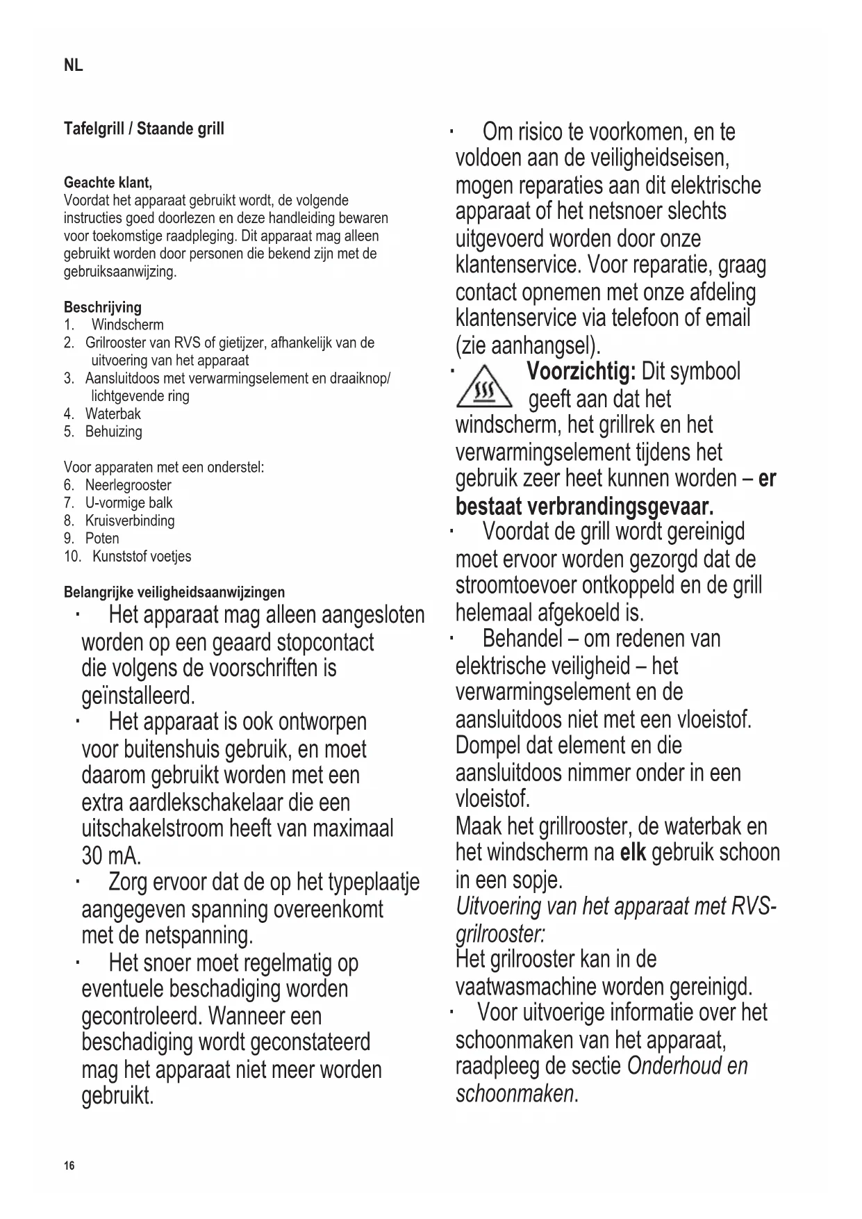Voorzichtig: Dit symbool geeft aan dat het windscherm, het grillrek en het verwarmingselement tijdens het gebruik zeer heet kunnen worden – er bestaat verbrandingsgevaar. ∙ Voordat de grill wordt gereinigd moet ervoor worden gezorgd dat de stroomtoevoer ontkoppeld en de grill helemaal afgekoeld is. ∙ Behandel – om redenen van elektrische veiligheid – het verwarmingselement en de aansluitdoos niet met een vloeistof. Dompel dat element en die aansluitdoos nimmer onder in een vloeistof. Maak het grillrooster, de waterbak en het windscherm na elk gebruik schoon in een sopje. Uitvoering van het apparaat met RVS- grilrooster: Het grilrooster kan in de vaatwasmachine worden gereinigd. ∙ Voor uitvoerige informatie over het schoonmaken van het apparaat, raadpleeg de sectie Onderhoud en schoonmaken. NL17 142 x 208 mm ∙ Dit apparaat is niet geschikt voor gebruik met een externe tijdklok of een apart afstandsbedieningssysteem. ∙ Waarschuwing! Onder geen enkele omstandigheid houtskool of andere vaste brandstof of vloeibare brandstof gebruiken. ∙ Let wel: Het grillrek, barbecueschotels en andere items niet met aluminiumfolie bedekken, dit kan een opbouw van hitte tot gevolg hebben hetgeen de grill ernstig kan beschadigen. ∙ Vul de waterbak met maximaal 1,1 liter water. ∙ Dit apparaat is bestemd voor huishoudelijk of gelijkwaardig gebruik, zoals - in bedrijfskeukens, in winkels, kantoren of andere bedrijfsruimtes, - in agrarische instellingen, - door klanten in hotels, motels enz. en gelijkwaardige accommodaties, - in bed-and-breakfast-gasthuizen. ∙ Dit apparaat mag gebruikt worden door kinderen (tenminste 8 jaar oud) en door personen met verminderde fysische, zintuigelijke of mentale bekwaanheden, of gebrek van ervaring en kennis, wanneer deze onder begeleiding zijn of instructies ontvangen hebben over het gebruik van dit apparaat en volledig de gevaren en veiligheidsvoorschriften begrijpen. ∙ Kinderen mogen niet met het apparaat spelen. ∙ Kinderen mogen in geen geval dit apparaat schoonmaken of onderhoudswerkzaamheden uitvoeren behalve wanneer onder toezicht van een volwassene en ze tenminste 8 jaar oud zijn. ∙ Het apparaat en het snoer moeten altijd goed weggehouden worden van kinderen jonger dan 8 jaar. ∙ Waarschuwing: Houd kinderen weg van inpakmateriaal, daar deze een bron van gevaar zijn b.v. door verstikking. ∙ Voordat het apparaat wordt gebruikt moet zowel de hoofdeenheid als gelijk welk hulpstuk, dat wordt aangebracht, eerst zorgvuldig op eventuele defecten worden gecontroleerd. Ingeval het apparaat, bijvoorbeeld, op een hard oppervlak is gevallen mag het niet meer worden gebruikt: zelfs onzichtbare beschadiging kan ongewenste effecten hebben op de gebruiksveiligheid van het apparaat. ∙ Tijdens gebruik moet de grill altijd op een hittebestendige ondergrond geplaatst zijn die tevens bestand is tegen spetteren en vlekken. Wanneer men voedsel grilt met een hoog vetgehalte kan spetteren niet altijd voorkomen worden. ∙ De grill niet bij een muur of in een hoek plaatsen, en zorg ervoor dat in de buurt ervan geen ontvlambare materialen worden opgeslagen. ∙ Gebruik het windscherm niet als u de gril binnenshuis gebruikt. ∙ Vette voedingsmiddelen kunnen tijdens grillen ontbranden. Vul daarom de waterbak met water voordat u de gril gebruikt! Steek pas daarna de stekker in het stopconatct. Op die manier wordt de waterbak gekoeld, wordt de rookontwikkeling verminderd en vergemakkelijkt u het schoonmaken naderhand. ∙ Het waterniveau in de gaten blijven houden. Water moet bijtijds worden bijgevuld, hierbij moet er echter goed op worden gelet dat het water niet met het verwarmingselement in aanraking komt. Voorzichtig: de grill eerst van de netspanning loskoppelen voordat er water toegevoegd wordt. ∙ Controleer voordat u de gril aanzet: (a) of het verwarmingselement goed in de behuizing is geplaatst en (b) of de waterbak is geplaatst en gevuld. ∙ De grill moet tijdens het gebruik steeds onder toezicht blijven. ∙ Zowel verwarmingselement als grilrooster worden na het inschakelen zeer heet. Raak – nadat u het verwarmingselement hebt uitgeschakeld – het element niet aan zolang dat nog heet is. Letselgevaar door verbranding! ∙ Zorg dat het snoer niet in aanraking komt met hete delen van het apparaat.18 142 x 208 mm ∙ Bevestig het elektriciteitssnoer dusdanig dat niemand erover kan struikelen. ∙ Haal de stekker uit het stopcontact - voordat men de reectorbak met water vult, - na ieder gebruik, - in geval van storing, - voor het schoonmaken. ∙ Het gebruik van een verlengsnoer of snoerhaspel veroorzaakt verlies van vermogen, mogelijk gecombineerd met een daaropvolgende warmte-opbouw in het snoer. Het is daarom noodzakelijk dat vóór het gebruik het snoer helemaal afgewikkeld wordt. Let erop dat het snoer goedgekeurd is voor buitenshuis gebruik en voor het gespeciceerd vermogen (zie typeplaatje met waarde). ∙ Voor apparaten met een onderstel: Belast het neerlegrooster maar tot maximaal 4 kg. ∙ Verplaats de grill nooit terwijl deze in gebruik is. ∙ Voorzichtig! Laat de grill altijd volledig afkoelen voordat u deze verplaatst, schoonmaakt, afdekt of opbergt. ∙ Voorzichtig! Als de grill niet wordt gebruik, moeten het verwarmingselement en de aansluitkast van de grill worden verwijderd en in een droge ruimte worden bewaard. ∙ De andere onderdelen van de grill mogen niet buiten worden opgeslagen of op open plaatsen waar ze kunnen worden beïnvloed door weersinvloeden. ∙ De fabrikant heeft geen verantwoordelijkheid wanneer dit apparaat verkeerd gebruikt wordt of wanneer de veiligheidsinstructies niet gevolgd worden. ∙ Dit product komt overeen met de richtlijnen aangegeven op het CE-label. Voordat het apparaat voor de eerste keer wordt gebruikt ∙ Alle verpakkingsmaterialen en stickers van het apparaat verwijderen. ∙ Verwijder ook de vier siliconenslangen op de dwarssteunen van het verwarmingselement. ∙ Maak grilrooster, waterbak en windscher
