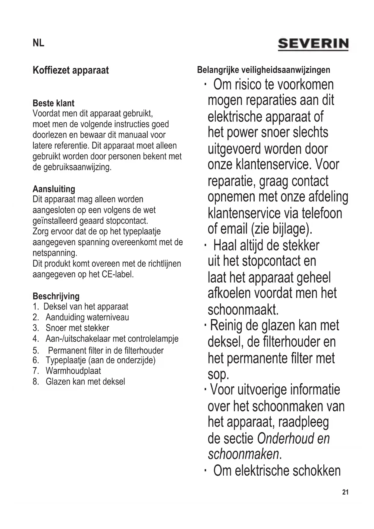 een volwassene en ze tenminste 8 jaar oud zijn. ∙ Het apparaat en het snoer moeten altijd goed weggehouden worden van kinderen jonger dan 8 jaar. ∙ Waarschuwing: Houdt kinderen weg van inpakmateriaal, daar deze een bron van gevaar zijn b.v. door verstikking. ∙ Voordat het apparaat wordt gebruikt moet zowel de hoofdeenheid inclusief het powersnoer als gelijk welk hulpstuk, dat wordt aangebracht, eerst zorgvuldig op eventuele defecten worden gecontroleerd. Ingeval het apparaat, bijvoorbeeld, op een hard oppervlak is gevallen, of wanneer men met overdadige kracht aan het power snoer getrokken heeft, mag men het niet meer gebruiken: zelfs onzichtbare beschadiging kan ongewenste effecten hebben op de gebruiksveiligheid van het apparaat. ∙ Tijdens het gebruik moet men zorgen dathetkofezetapparaatopeenvlakke en non-slip ondergrond geplaatst is die tegen spetteren en vlekken kan. ∙ Zorg ervoor dat het apparaat en het snoer niet in aanraking komen met een hete ondergrond of andere hittebronnen. ∙ Waarschuwing! Het uitgeschakelde kofezetapparaat moet eerst grondig afkoelen, voordat het wordt geopend of er accessoires worden verwijderd. Anders kan er heet water of damp vrijkomen. ∙ Laat het apparaat nooit onbeheerd achter terwijl deze op het lichtnet aangesloten zit. ∙ Verwijder altijd de stekker uit het stopcontact: - wanneer het apparaat niet werkt, - na gebruik, - wanneer men het apparaat schoonmaakt. ∙ Trek de stekker niet aan het snoer uit het stopcontact, trek aan de stekker zelf. ∙ Laat het snoer nooit los hangen: het snoer moet vrijgehouden worden van hete onderdelen van het apparaat. ∙ Wordt dit apparaat op een verkeerde manier gebruikt of worden de veiligheidsregels niet gevolgd, dan kan de fabrikant niet aansprakelijk worden gesteld voor eventuele schades. Automatische uitschakeling Om energie te besparen zal het apparaat (inclusief de warmhoudplaat) ongeveer 35 minuten, nadat de brouw cyclus is voltooid, zichzelf automatisch uitschakelen.24 104 x 142 mm Gebruik voor de eerste keer ∙ Verwijder alle verpakkingsmaterialen en eventuele reclamestickers van het apparaat. Verwijder het typeplaatje niet. ∙ Reinig het apparaat zoals beschreven onder Reiniging en onderhoud. ∙ Voordat men het apparaat voor het eerst gebruikt moet men eerst twee of drie keerhetltersysteemlatendraaienmet de maximale hoeveelheid water maar zonderhetgebruikvankofepoeder.Dit moet men ook doen wanneer men het apparaat voor een langere tijd gebruikt heeft, en na het ontkalken. Algemene informatie ∙ Er bevindt zich aan aanduiding van het waterniveau op het waterreservoir en op de kan voor het doseren van de hoeveelheid water. De aanduiding van het waterniveau geldt voor kopjes van normale grootte met een inhoud van ongeveer 125 ml. Overschrijd het aangegeven maximale aantal kopjes niet. ∙ Wanneer meerdere brouwcycles nodig zijnmoetmenhetkofezetapparaat na iedere cycle uitschakelen en het apparaat voor ongeveer 5 minuten laten afkoelen. ∙ Belangrijke: Er kan hete damp vrijkomen uit de wateruitloop bij het vullen van koud water kort na het zetproces (gevaar voor brandwonden). Laat het apparaat daarom eerst afkoelen, voordat er weer water wordt gevuld. Kofe maken ∙ Vullen met water: Open het deksel van het apparaat en vul het waterreservoir met de gewenste hoeveelheid koud water. ∙ Inzetten van de papieren lter: Plaatshetpermanentelterofeen papierenltervanmaat4indelterhouder. Vouw eerst de geperforeerde kanten van hetpapierenlterom. ∙ Vullen met gemalen kofe: We bevelen aan om voor ieder kopje van normale grootte (125 ml) ongeveer 6 g =1½-2theelepelsmetjntotzeerjn gemalenkofetegebruiken.Sluitdaarna het deksel van het apparaat. ∙ Voorbereiden van de glazen karaf: Sluit het deksel van de kan en plaats de kan in het apparaat. De druppelstop in het lterwordttijdenshetzetprocesgeopend door het deksel. ∙ Starten van de brouwcycle: Steek de stekker in het stopcontact en schakel hetkofezetapparaatinmetde toets. Het water begint door te lopen. ∙ Verwijderen van de glazen karaf: Wacht totdat het water is doorgelopen door hetlterenneemdekanuithetapparaat. ∙ Uitschakelen van het kofezetapparaat: Dekofekanwarmgehoudenworden in de karaf door deze op de hete plaat te laten staan. Nadat het laatste kopje is ingeschonken de knop indrukken om het kofezetapparaatuitteschakelen. Tenzij het apparaat handmatig wordt uitgeschakeld blijft de warmhoudplaat ongeveer 35 minuten warm nadat de brouw cyclus is voltooid, waarna het apparaat104 x 142 mm
