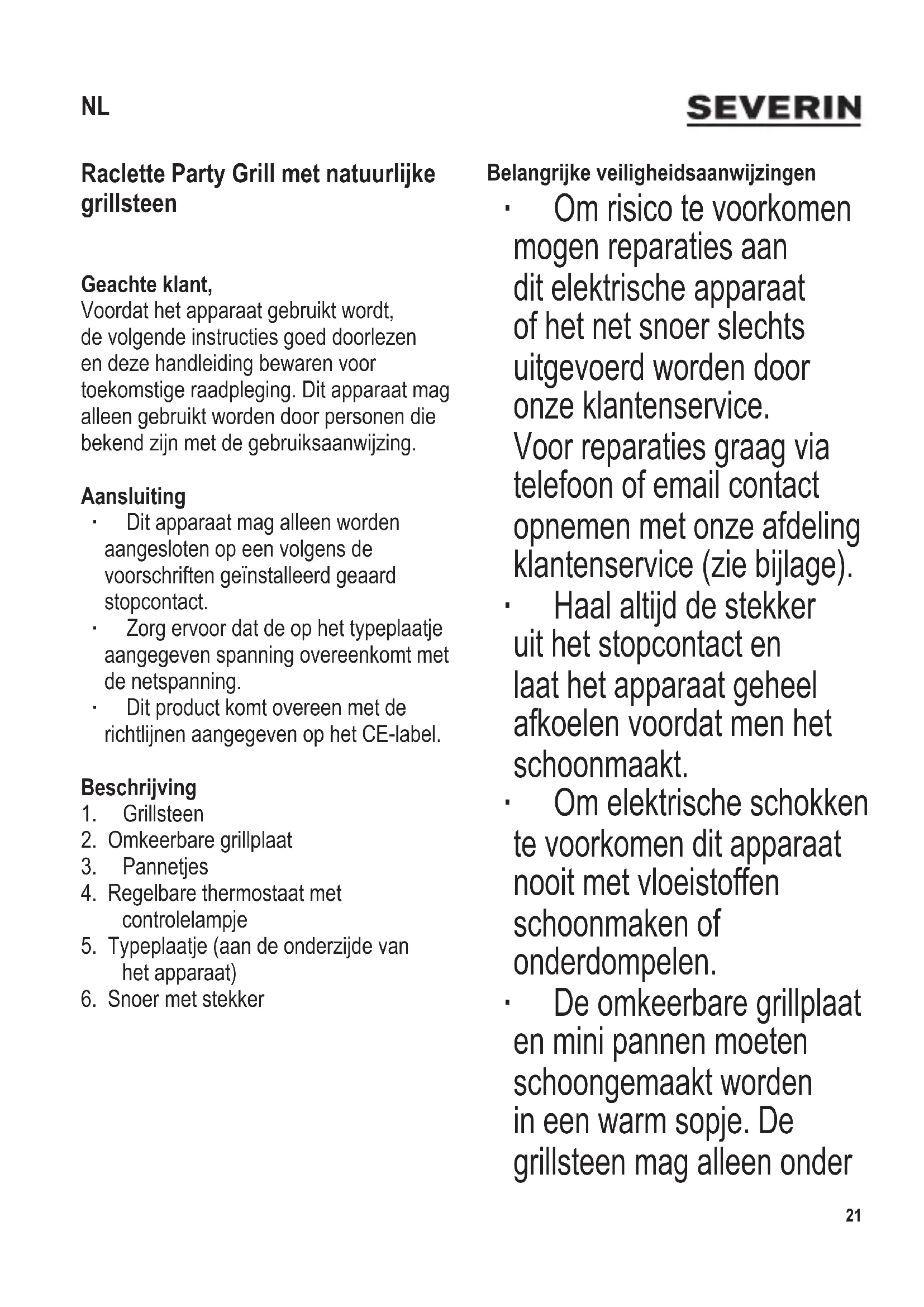 snoer moeten altijd goed weggehouden worden van kinderen jonger dan 8 jaar. ∙ Waarschuwing: Houd kinderen weg van inpakmateriaal, daar deze een bron van gevaar zijn bijvoorbeeld door verstikking. ∙ Voordat het apparaat wordt gebruikt moet zowel de hoofdeenheid inclusief het netsnoer evenals elk hulpstuk dat wordt aangebracht, eerst zorgvuldig op eventuele defecten worden gecontroleerd. Indien het apparaat, bijvoorbeeld, op een hard oppervlak is gevallen, of wanneer men met overdadige kracht aan het netsnoer getrokken heeft, mag men het niet meer gebruiken: zelfs onzichtbare beschadiging kan ongewenste effecten hebben op de gebruiksveiligheid van het apparaat. ∙ De oppervlaktes van het apparaat, de omkeerbare grillplaat, grillsteen en de mini pannetjes worden heet tijdens gebruik en zullen voor een lange periode heet blijven. Waarschuwing: Er bestaat gevaar voor verbranding. ∙ Laat dit apparaat nooit onbeheerd achter. ∙ Het snoer moet vrijgehouden worden van hete delen van het apparaat. ∙ Tijdens gebruik moet het apparaat altijd op een stabiel, recht en hittebestendige ondergrond geplaatst zijn die tevens bestand is tegen spetteren en vlekken. Wanneer men voedsel grilt met een hoog vetgehalte kan spetteren niet altijd voorkomen worden. ∙ De grill niet bij een muur of in een hoek plaatsen, en zorg ervoor dat in de buurt ervan geen ontvlambare materialen worden opgeslagen. ∙ Plaats het apparaat nooit op een hete ondergrond of in de buurt van open vuur of brandbare gassen. ∙ Pas op: Gebruik dit apparaat niet buitenshuis. ∙ Voor gebruik, moeten de omkeerbare grillplaat en de grillsteen op de top van het verwarmingselement van het apparaat geplaatst worden. ∙ Verwijder altijd de stekker uit het stopcontact: - na gebruik, - wanneer het apparaat niet werkt, - wanneer men het apparaat schoonmaakt. ∙ Trek de stekker niet aan het snoer uit het stopcontact, trek aan de stekker zelf. ∙ De fabrikant heeft geen verantwoordelijkheid wanneer dit apparaat verkeerd gebruikt wordt of wanneer de veiligheidsinstructies niet gevolgd worden. Toepassingen Dit apparaat is een elektrische raclettegrill, geschikt voor het vetarm grillen van vlees, vis en groenten en voor gegratineerde kaas. Elk ander gebruik dan datgene wat in deze instructies beschreven is, moet als onjuist beschouwd worden en kan leiden tot persoonlijk letsel of materiële schade.24 104 x 142 mm Eerste ingebruikname ∙ Verwijder al het verpakkingsmateriaal. ∙ Voordat men de grill voor de eerste keer gebruikt, moeten eerst de omkeerbare grillplaat, grillsteen en mini pannetjes schoongemaakt worden met een vochtige doek. ∙ Wij adviseren u om vóór het eerste gebruik, het apparaat met steen / plaat en de pannetjes ca. 10 minuten op max. stand zonder vlees te verwarmen zodat de reuk, van het apparaat zelf, kan verdwijnen (hierbij kan een lichte rookontwikkeling ontstaan, zorg voor goede ventilatie). Men moet daarom zorgen voor voldoende ventilatie door ramen en balkon deuren te openen. ∙ Maak het toestel daarna schoon zoals beschreven in het hoofdstuk Onderhoud en schoonmaken. Steen ∙ Voordat het apparaat wordt gebruikt, plaats de steen, met de gepolijste kant naar boven gericht, naast de omkeerbare grillplaat op het apparaat, en zorg ervoor dat de ronde hoeken naar buiten gericht staan. Let op: Een koude steen mag niet op een heet element worden aangebracht. ∙ De steen kan, naar wens, worden gebruikt voor het koken van groenten, van in schijven gesneden vlees of vis, etc. ∙ Deze steen is gemaakt van natuurlijk materiaal. Kleine barsten erin zijn het resultaat van het natuurlijk uitzetten en krimpen ervan tijdens het verwarmen en afkoelen, terwijl ook een verandering in een donkerder kleur normaal is; een en ander heeft echter geen nadelige effecten. ∙ Plaats geen diepgevroren voedsel of voorwerpen die azijn bevatten (zoals zure augurken of mosterd) op de steen. Omkeerbare grillplaat ∙ Voordat het apparaat wordt gebruikt, plaats de omkeerbare grillplaat naast de steen op het apparaat, en zorg ervoor dat de ronde hoeken naar buiten gericht staan. ∙ Met de geribbelde kant naar boven gericht, kan de omkeerbare grillplaat worden gebruikt voor het grillen van vlees, worstjes, etc. De gladde kant is geschikt voor vis en groente. De grillplaat moet vóór het gebruik lichtjes ingevet worden. Regelbare thermostaat en controlelampje ∙ Met de thermostaat kan de temperatuur worden ingesteld tussen MIN en MAX. ∙ Het controlelampje geeft de status van het verwarmingselement aan: Verwarming aan = controlelampje aan Verwarming uit = controlelampje uit ∙ Na het beëindigen van maaltijdbereiding, thermostaat in laagste stand draaien, en stekker uit het stopcontact trekken.104 x 142 mm