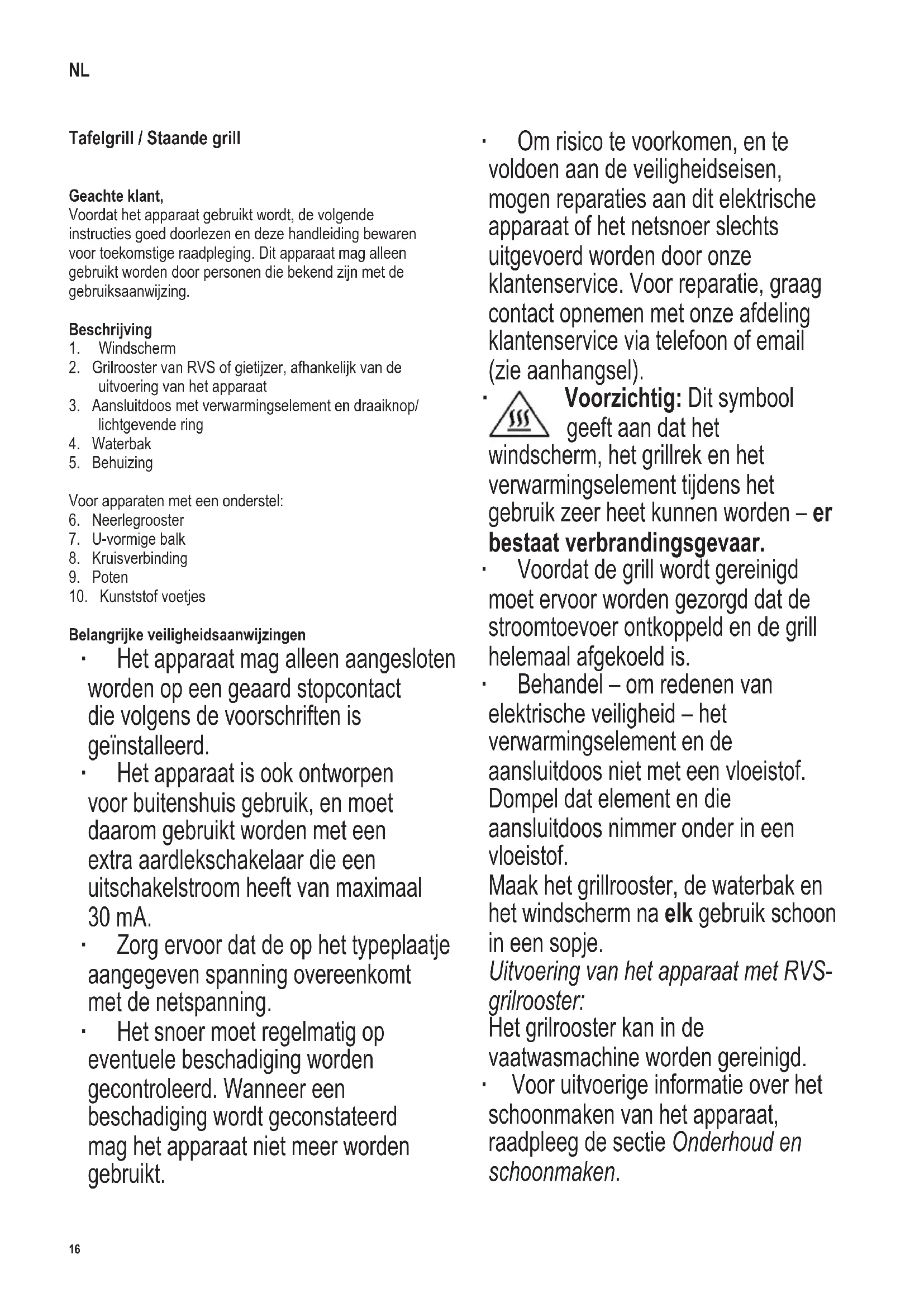 Voorzichtig: Dit symbool geeft aan dat het windscherm, het grillrek en het verwarmingselement tijdens het gebruik zeer heet kunnen worden – er bestaat verbrandingsgevaar. ∙ Voordat de grill wordt gereinigd moet ervoor worden gezorgd dat de stroomtoevoer ontkoppeld en de grill helemaal afgekoeld is. ∙ Behandel – om redenen van elektrische veiligheid – het verwarmingselement en de aansluitdoos niet met een vloeistof. Dompel dat element en die aansluitdoos nimmer onder in een vloeistof. Maak het grillrooster, de waterbak en het windscherm na elk gebruik schoon in een sopje. Uitvoering van het apparaat met RVS- grilrooster: Het grilrooster kan in de vaatwasmachine worden gereinigd. ∙ Voor uitvoerige informatie over het schoonmaken van het apparaat, raadpleeg de sectie Onderhoud en schoonmaken. NL17 142 x 208 mm ∙ Dit apparaat is niet geschikt voor gebruik met een externe tijdklok of een apart afstandsbedieningssysteem. ∙ Waarschuwing! Onder geen enkele omstandigheid houtskool of andere vaste brandstof of vloeibare brandstof gebruiken. ∙ Let wel: Het grillrek, barbecueschotels en andere items niet met aluminiumfolie bedekken, dit kan een opbouw van hitte tot gevolg hebben hetgeen de grill ernstig kan beschadigen. ∙ Vul de waterbak met maximaal 1,1 liter water. ∙ Dit apparaat is bestemd voor huishoudelijk of gelijkwaardig gebruik, zoals - in bedrijfskeukens, in winkels, kantoren of andere bedrijfsruimtes, - in agrarische instellingen, - door klanten in hotels, motels enz. en gelijkwaardige accommodaties, - in bed-and-breakfast-gasthuizen. ∙ Dit apparaat mag gebruikt worden door kinderen (tenminste 8 jaar oud) en door personen met verminderde fysische, zintuigelijke of mentale bekwaanheden, of gebrek van ervaring en kennis, wanneer deze onder begeleiding zijn of instructies ontvangen hebben over het gebruik van dit apparaat en volledig de gevaren en veiligheidsvoorschriften begrijpen. ∙ Kinderen mogen niet met het apparaat spelen. ∙ Kinderen mogen in geen geval dit apparaat schoonmaken of onderhoudswerkzaamheden uitvoeren behalve wanneer onder toezicht van een volwassene en ze tenminste 8 jaar oud zijn. ∙ Het apparaat en het snoer moeten altijd goed weggehouden worden van kinderen jonger dan 8 jaar. ∙ Waarschuwing: Houd kinderen weg van inpakmateriaal, daar deze een bron van gevaar zijn b.v. door verstikking. ∙ Voordat het apparaat wordt gebruikt moet zowel de hoofdeenheid als gelijk welk hulpstuk, dat wordt aangebracht, eerst zorgvuldig op eventuele defecten worden gecontroleerd. Ingeval het apparaat, bijvoorbeeld, op een hard oppervlak is gevallen mag het niet meer worden gebruikt: zelfs onzichtbare beschadiging kan ongewenste effecten hebben op de gebruiksveiligheid van het apparaat. ∙ Tijdens gebruik moet de grill altijd op een hittebestendige ondergrond geplaatst zijn die tevens bestand is tegen spetteren en vlekken. Wanneer men voedsel grilt met een hoog vetgehalte kan spetteren niet altijd voorkomen worden. ∙ De grill niet bij een muur of in een hoek plaatsen, en zorg ervoor dat in de buurt ervan geen ontvlambare materialen worden opgeslagen. ∙ Gebruik het windscherm niet als u de gril binnenshuis gebruikt. ∙ Vette voedingsmiddelen kunnen tijdens grillen ontbranden. Vul daarom de waterbak met water voordat u de gril gebruikt! Steek pas daarna de stekker in het stopconatct. Op die manier wordt de waterbak gekoeld, wordt de rookontwikkeling verminderd en vergemakkelijkt u het schoonmaken naderhand. ∙ Het waterniveau in de gaten blijven houden. Water moet bijtijds worden bijgevuld, hierbij moet er echter goed op worden gelet dat het water niet met het verwarmingselement in aanraking komt. Voorzichtig: de grill eerst van de netspanning loskoppelen voordat er water toegevoegd wordt. ∙ Controleer voordat u de gril aanzet: (a) of het verwarmingselement goed in de behuizing is geplaatst en (b) of de waterbak is geplaatst en gevuld. ∙ De grill moet tijdens het gebruik steeds onder toezicht blijven. ∙ Zowel verwarmingselement als grilrooster worden na het inschakelen zeer heet. Raak – nadat u het verwarmingselement hebt uitgeschakeld – het element niet aan zolang dat nog heet is. Letselgevaar door verbranding! ∙ Zorg dat het snoer niet in aanraking komt met hete delen van het apparaat.18 142 x 208 mm ∙ Bevestig het elektriciteitssnoer dusdanig dat niemand erover kan struikelen. ∙ Haal de stekker uit het stopcontact - voordat men de reectorbak met water vult, - na ieder gebruik, - in geval van storing, - voor het schoonmaken. ∙ Het gebruik van een verlengsnoer of snoerhaspel veroorzaakt verlies van vermogen, mogelijk gecombineerd met een daaropvolgende warmte-opbouw in het snoer. Het is daarom noodzakelijk dat vóór het gebruik het snoer helemaal afgewikkeld wordt. Let erop dat het snoer goedgekeurd is voor buitenshuis gebruik en voor het gespeciceerd vermogen (zie typeplaatje met waarde). ∙ Voor apparaten met een onderstel: Belast het neerlegrooster maar tot maximaal 4 kg. ∙ Verplaats de grill nooit terwijl deze in gebruik is. ∙ Voorzichtig! Laat de grill altijd volledig afkoelen voordat u deze verplaatst, schoonmaakt, afdekt of opbergt. ∙ Voorzichtig! Als de grill niet wordt gebruik, moeten het verwarmingselement en de aansluitkast van de grill worden verwijderd en in een droge ruimte worden bewaard. ∙ De andere onderdelen van de grill mogen niet buiten worden opgeslagen of op open plaatsen waar ze kunnen worden beïnvloed door weersinvloeden. ∙ De fabrikant heeft geen verantwoordelijkheid wanneer dit apparaat verkeerd gebruikt wordt of wanneer de veiligheidsinstructies niet gevolgd worden. ∙ Dit product komt overeen met de richtlijnen aangegeven op het CE-label. Voordat het apparaat voor de eerste keer wordt gebruikt ∙ Alle verpakkingsmaterialen en stickers van het apparaat verwijderen. ∙ Verwijder ook de vier siliconenslangen op de dwarssteunen van het verwarmingselement. ∙ Maak grilrooster, waterbak en windscher