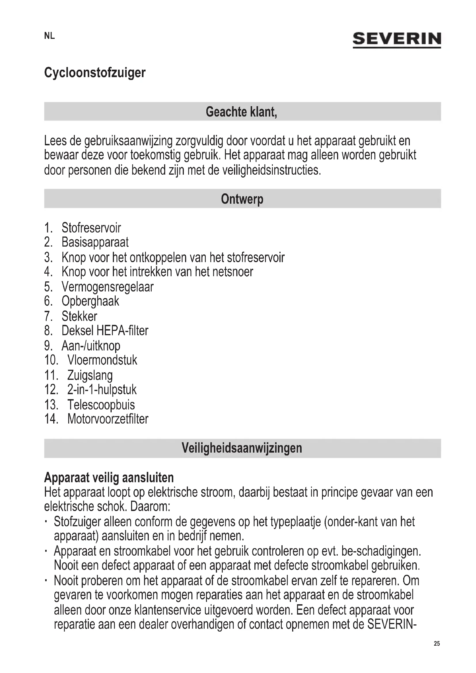 Veiligheidsaanwijzingen Apparaat veilig aansluiten Het apparaat loopt op elektrische stroom, daarbij bestaat in principe gevaar van een elektrische schok. Daarom: ∙ Stofzuiger alleen conform de gegevens op het typeplaatje (onder-kant van het apparaat) aansluiten en in bedrijf nemen. ∙ Apparaat en stroomkabel voor het gebruik controleren op evt. be-schadigingen. Nooit een defect apparaat of een apparaat met defecte stroomkabel gebruiken. ∙ Nooit proberen om het apparaat of de stroomkabel ervan zelf te repareren. Om gevaren te voorkomen mogen reparaties aan het apparaat en de stroomkabel alleen door onze klantenservice uitgevoerd worden. Een defect apparaat voor reparatie aan een dealer overhandigen of contact opnemen met de SEVERIN- NL26 142 x 208 mm klantenservice. ∙ Apparaat niet in water of andere vloeistoffen dompelen en niet metvloeistoffen behandelen. Apparaat niet gebruiken in de buitenlucht of ruimtes met hoge luchtvochtigheid. De stekker niet met natte handen aanraken. ∙ Zorg ervoor dat de voedingskabel slechts tot het eerste merkteken uit het apparaat wordt getrokken. ∙ Erop letten, dat de stroomkabel niet geknikt, ingeklemd of erover heen gereden wordt of met hittebronnen, vocht of scherpe randen in aanraking komt. Erop letten, dat de stroomkabel niet voor struikelgevaar zorgt. ∙ Apparaat niet aan de stroomkabel trekken of transporteren. Bij hetuittrekken van de stekker uit het stopcontact altijd direct aan de stekker trekken. ∙ Indien mogelijk geen verlengsnoeren gebruiken. Indien dit onvermij-delijk is, alleen GS-gecontroleerde, enkele verlengsnoeren (geen stekkerdozen) gebruiken die bedoeld zijn voor de krachtontneming van het apparaat. ∙ Voor het reinigen of onderhouden van het apparaat alsmede voorhet wisselen van toebehoren apparaat uitschakelen en stekker uit het stopcontact trekken. Veiligheid van bepaalde groepen personen ∙ Het apparaat kan door kinderen vanaf 8 jaar en ouder alsmede doorpersonen met verminderde fysieke, sensorische of mentale vaardigheden of gebrek aan ervaring en/of kennis alleen gebruikt worden, als er toezicht op hen gehouden wordt of als zij in het veilige gebruik van het apparaat geïnstrueerd zijn en de daaruit resulterende gevaren begrepen hebben. Apparaat en stroomkabel buiten bereik van kinderen jonger dan 8 jaar houden. ∙ Kinderen mogen niet met het apparaat spelen of op het apparaatgaan zitten of staan. Reiniging en gebruikersonderhoud mag niet door kinderen zonder toezicht uitgevoerd worden. ∙ Verpakkingsmaterialen buiten bereik van kinderen bewaren en verwijderen. Anders bestaat er verstikkingsgevaar. Gebruik volgens de voorschriften Het apparaat mag alleen in het huishouden gebruikt worden. Daarbij uitsluitend droge, normaal verontreinigde vloeren of afhankelijk van toebehoren ook meubels en kussens zuigen. Elk ander gebruik geldt als verkeerd gebruik en is verboden. Om letsel, brand en schade te voorkomen, mag het apparaat niet gebruikt worden voor het zuigen van: ∙ Mensen, dieren of planten. Mondstukken en zuigopeningen altijdbuiten bereik houden van lichaamsdelen, haar en kledingstukken. Niet in de buurt van het hoofd zuigen.27 142 x 208 mm ∙ Gloeiende, brandende of smeulende deeltjes (zoals as, kool, houts-kool, sigaretten, lucifers). ∙ Explosieve of licht ontvlambare stoffen of toners. ∙ Water en andere vloeistoffen, bijv. vochtige tapijtreinigers. ∙ Puntige voorwerpen zoals glassplinters, spijkers of puin. ∙ Fijnstof zoals gips, cement, jn boorstof, poeder. CE-markering Het apparaat voldoet aan de EU-richtlijnen die bindend zijn voor CE-markering. Het apparaat bedienen Vóór het eerste gebruik ∙ Verwijder alle verpakkingsmateriaal of bijsluiters van het apparaat. ∙ Assembleer het apparaat zoals hieronder aangegeven en controleer of het stofreservoir en de lters correct zijn aangebracht (zie ook “Stofreservoir legen” en “Filter reinigen of vervangen”. Monteren ∙ Apparaatonderdelen alleen monteren, als de stekker uit het stopcontact is getrokken. ∙ Plaats indien van toepassing het stofreservoir in het apparaat tot het hoorbaar vastklikt. ∙ Bevestig de slang aan het apparaat en vergrendel deze door een kwartslag te draaien. ∙ Schuif de telescoopbuis op de slang tot deze hoorbaar vastklikt en stel hem op de gewenste lengte af. ∙ Kies het mondstuk afhankelijk van het te zuigen oppervlak: Het omschakelbare vloermondstuk beschikt over 2 instelmogelijkheden: Stand 1 is uitstekend geschikt voor het opnemen van vuil en ve-zels van tapijtvloeren, lopers enz. alsmede voor de dieptereiniging van deze ondergronden. Stand 2 is ideaal voor alle soorten gladde harde vloeren. Met de borstel ingeklapt is het 2-in-1-hulpstuk perfect geschikt voor spleten in banken en andere moeilijk bereikbare plaatsen. Met de borstel uitgeklapt is het ideaal voor het stofzuigen van meubels. ∙ Gebruik alleen onbeschadigde mondstukken. Beschadigde mondstukken kunnen krassen op oppervlakken veroorzaken.28 142 x 208 mm Stofzuigen Vooral bij het zuigen van trappen erop letten, dat het apparaat zich altijd onder u bevindt. An-Stofzuigen ders kan het apparaat naar beneden vallen en verwondingen veroorzaken. ∙ Bij gebruik van een borstel met draaiende borstelharen moet deze beslist buiten bereik gehouden worden van mensen, dieren, planten, kabels en leidingen. ∙ Apparaat alleen gebruiken, als de stofbak en de lters correct geplaatst zijn. ∙ Stel het apparaat samen, steek de stekker in het stopcontact en schakel het apparaat in. ∙ Reinigings- en verzorgingsaanwijzingen van de vloerbedekking-, tapijt- of meubelfabrikant in acht nemen! ∙ Als vitrages, gordijnen of andere voorwerpen per ongeluk ingezogen werden, snel de hulpluchtregelaar openen, om deze voorwerpen weer vrij te geven. ∙ Zorg er bovendien altijd voor dat de voor het oppervlak geschikte zuigkracht is ingesteld (zie “Zuigkracht instellen”). ∙ Schakel het apparaat na gebruik uit en trek de stekker uit het stopcontact. ∙ Druk op de knop v