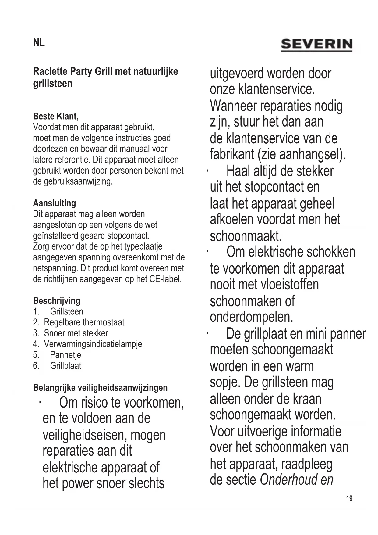 Raclette Party Grill met natuurlijke grillsteen Beste Klant, Voordat men dit apparaat gebruikt, moet men de volgende instructies goed doorlezen en bewaar dit manuaal voor latere referentie. Dit apparaat moet alleen gebruikt worden door personen bekent met de gebruiksaanwijzing. Aansluiting Dit apparaat mag alleen worden aangesloten op een volgens de wet geïnstalleerd geaard stopcontact. Zorg ervoor dat de op het typeplaatje aangegeven spanning overeenkomt met de netspanning. Dit product komt overeen met de richtlijnen aangegeven op het CE-label. Beschrijving