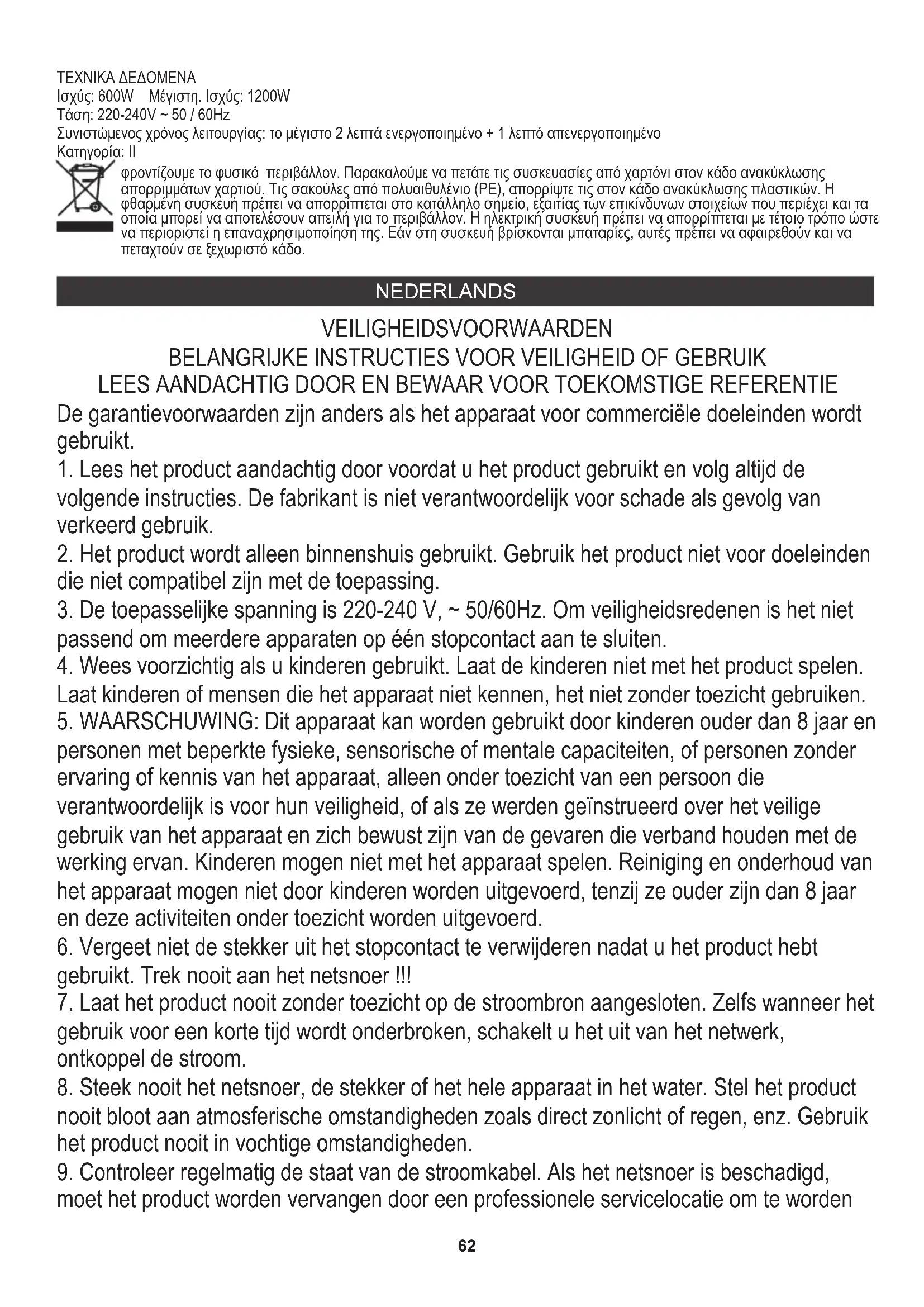 gebruik voor een korte tijd wordt onderbroken, schakelt u het uit van het netwerk, ontkoppel de stroom. NEDERLANDS φροντίζουμε το φυσικό περιβάλλον. Παρακαλούμε να πετάτε τις συσκευασίες από χαρτόνι στον κάδο ανακύκλωσης απορριμμάτων χαρτιού. Τις σακούλες από πολυαιθυλένιο (ΡΕ), απορρίψτε τις στον κάδο ανακύκλωσης πλαστικών. Η φθαρμένη συσκευή πρέπει να απορρίπτεται στο κατάλληλο σημείο, εξαιτίας των επικίνδυνων στοιχείων που περιέχει και τα οποία μπορεί να αποτελέσουν απειλή για το περιβάλλον. Η ηλεκτρική συσκευή πρέπει να απορρίπτεται με τέτοιο τρόπο ώστε να περιοριστεί η επαναχρησιμοποίηση της. Εάν στη συσκευή βρίσκονται μπαταρίες, αυτές πρέπει να αφαιρεθούν και να πεταχτούν σε ξεχωριστό κάδο. Ισχύς: 600W Μέγιστη. Ισχύς: 1200W ΤΕΧΝΙΚΑ ΔΕΔΟΜΕΝΑ Κατηγορία: II Τάση: 220-240V ~ 50 / 60Hz Συνιστώμενος χρόνος λειτουργίας: το μέγιστο 2 λεπτά ενεργοποιημένο + 1 λεπτό απενεργοποιημένο63 vervangen om gevaarlijke situaties te voorkomen.