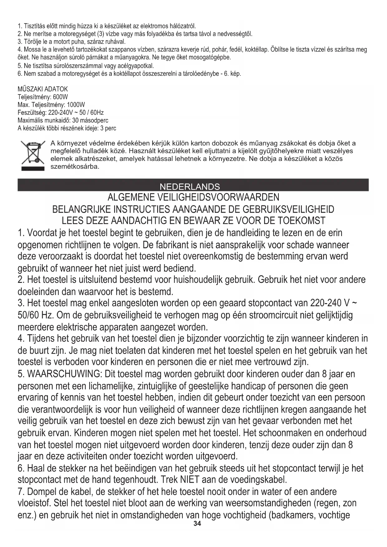 voorzichtig te zijn. Trek de stekker van de voedingskabel uit het stopcontact voordat je de uiteinden van de mixer verandert.36 TECHNISCHE GEGEVENS Tijd om uit te rusten van het apparaat: 3 minuten Voltage: 220-240V ~ 50 / 60Hz Max. Werktijd: 30 seconden Vermogen: 600W Vermogen max: 1000W De staafmixer is geschikt voor de bereiding van soepen, sauzen, babyvoeding en cocktails. Het apparaat is niet bedoeld voor het mengen van ijs en vlees.