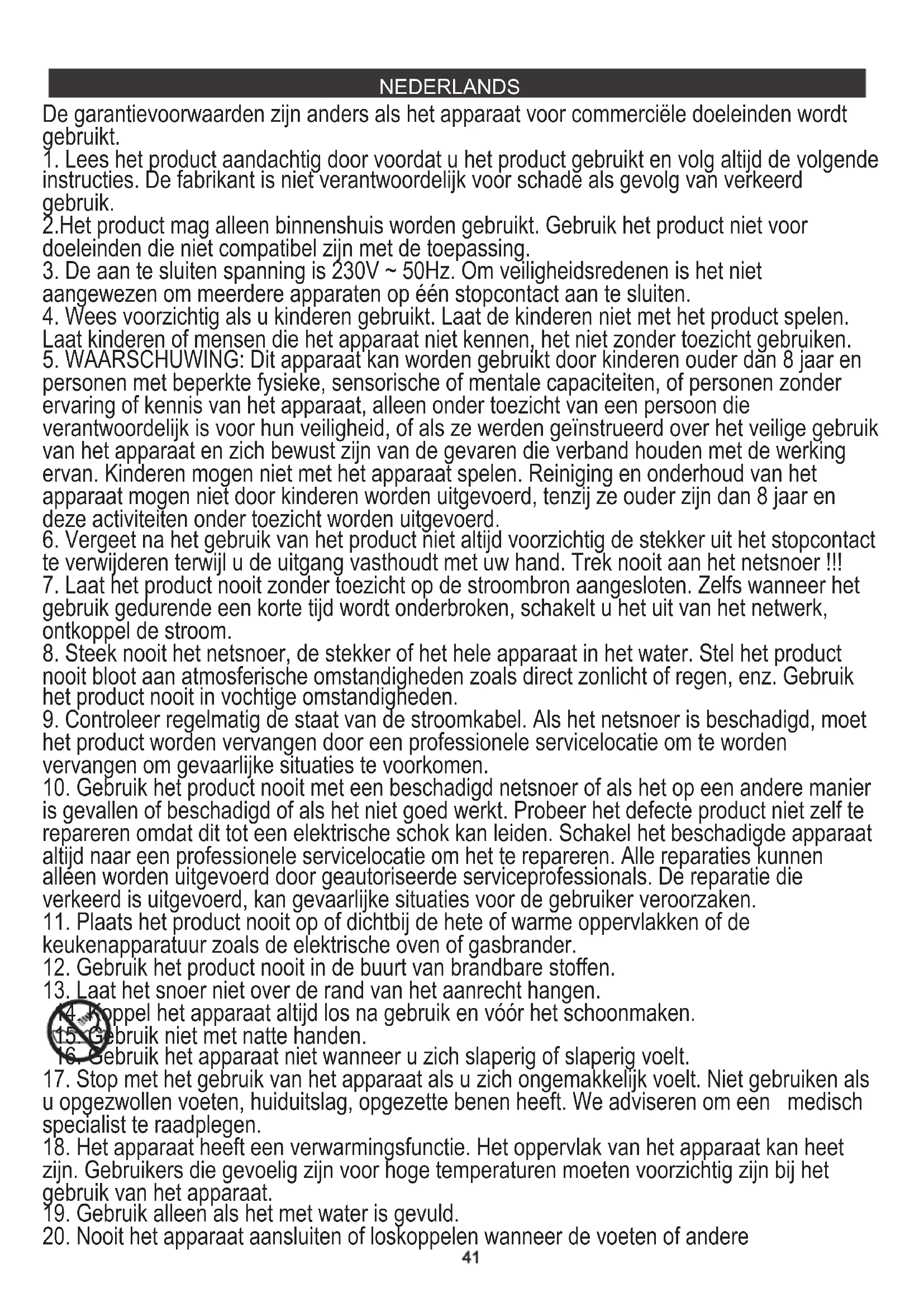 personen met beperkte fysieke, sensorische of mentale capaciteiten, of personen zonder ervaring of kennis van het apparaat, alleen onder toezicht van een persoon die verantwoordelijk is voor hun veiligheid, of als ze werden geïnstrueerd over het veilige gebruik van het apparaat en zich bewust zijn van de gevaren die verband houden met de werking ervan. Kinderen mogen niet met het apparaat spelen. Reiniging en onderhoud van het apparaat mogen niet door kinderen worden uitgevoerd, tenzij ze ouder zijn dan 8 jaar en deze activiteiten onder toezicht worden uitgevoerd. NEDERLANDS23. Als u zich zorgen maakt over uw gezondheid, neem dan voor gebruik contact op met een arts. Gebruikers met hartproblemen, pacemakers, diabeïsche of andere gezondheidsproblemen. Zwangere vrouwen en gebruikers klagen over langdurige gewrichts- en spierpijn. Langdurige en frequente pijn kan een waarschuwing zijn voor ernstige aandoeningen, raadpleeg een arts.
