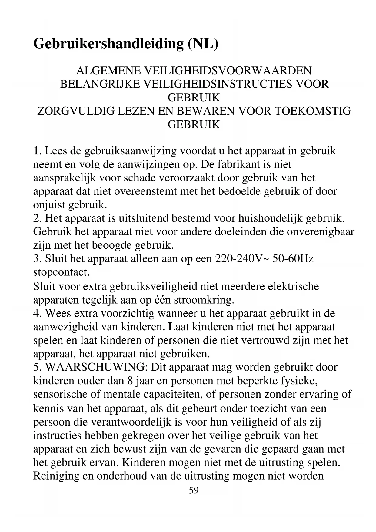 kinderen ouder dan 8 jaar en personen met beperkte fysieke, sensorische of mentale capaciteiten, of personen zonder ervaring of kennis van het apparaat, als dit gebeurt onder toezicht van een persoon die verantwoordelijk is voor hun veiligheid of als zij instructies hebben gekregen over het veilige gebruik van het apparaat en zich bewust zijn van de gevaren die gepaard gaan met het gebruik ervan. Kinderen mogen niet met de uitrusting spelen. Reiniging en onderhoud van de uitrusting mogen niet worden60 uitgevoerd door kinderen, tenzij ze ouder zijn dan 8 jaar en de activiteit onder toezicht wordt uitgevoerd.