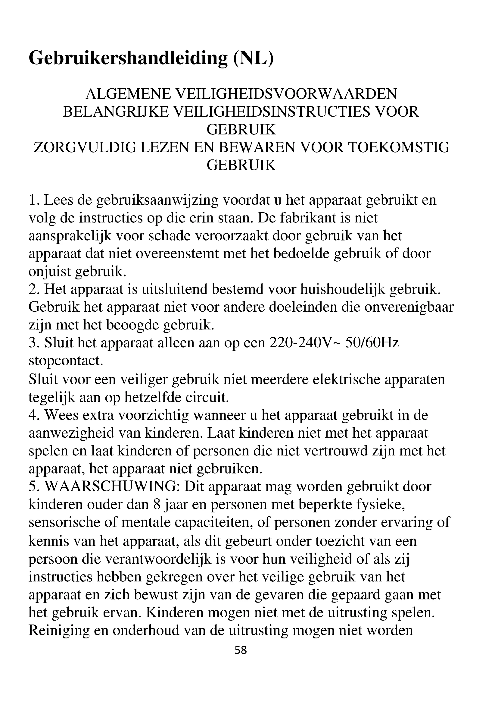 kinderen ouder dan 8 jaar en personen met beperkte fysieke, sensorische of mentale capaciteiten, of personen zonder ervaring of kennis van het apparaat, als dit gebeurt onder toezicht van een persoon die verantwoordelijk is voor hun veiligheid of als zij instructies hebben gekregen over het veilige gebruik van het apparaat en zich bewust zijn van de gevaren die gepaard gaan met het gebruik ervan. Kinderen mogen niet met de uitrusting spelen. Reiniging en onderhoud van de uitrusting mogen niet worden59 uitgevoerd door kinderen, tenzij ze ouder zijn dan 8 jaar en de activiteit onder toezicht wordt uitgevoerd.