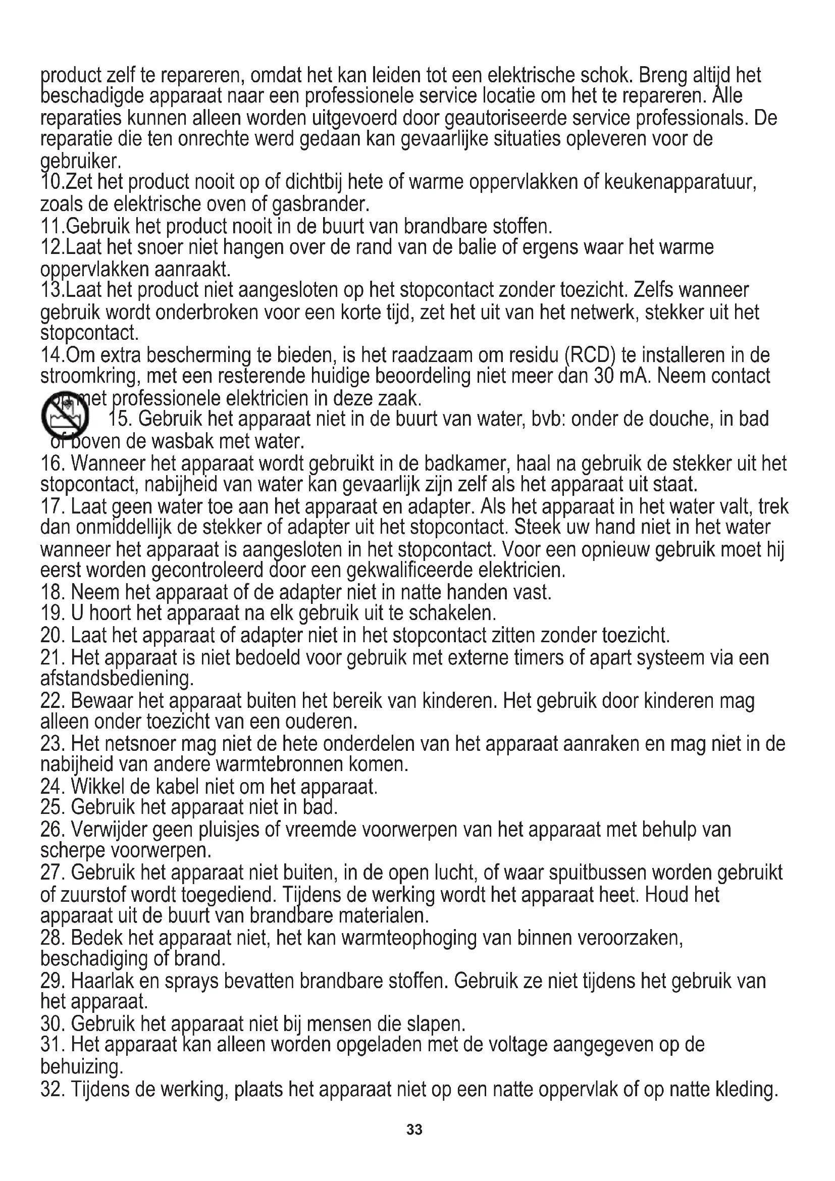15. Gebruik het apparaat niet in de buurt van water, bvb: onder de douche, in bad
