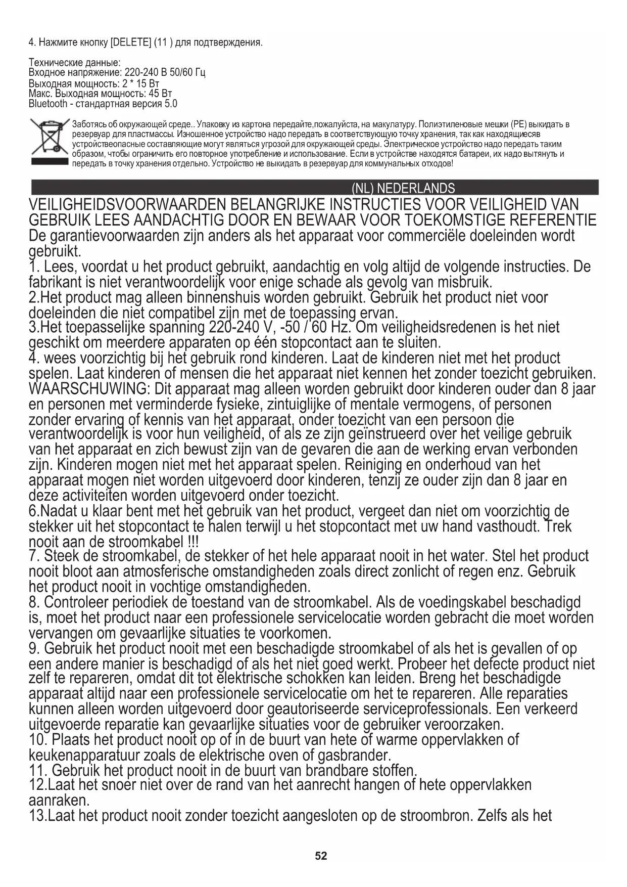 Technische data: Ingangsspanning: 220-240V 50 / 60Hz Uitgangsvermogen: 2 * 15 W. Max Outoput vermogen: 45W Bluetooth - standaard versie 5.0 We geven om het milieu. We vragen u om de kartonnen verpakkingen te storten bij het oud papier. Polyethyleen zakken (PE) storten in de container voor plastic . Versleten apparatuur afgeven bij het juiste verzamelpunkt, als in het apparatuur gevaarlijke elementen zitten kan dat een bedreiging zijn voor het milieu. Elektrisch apparatuur moet worden geretourneerd om het hergebruik te verminderen. Als in het apparatur batterijen ziiten, horen die verwijderd te worden en appart af te worden gegeven bij het juiste verzamelpunkt.56