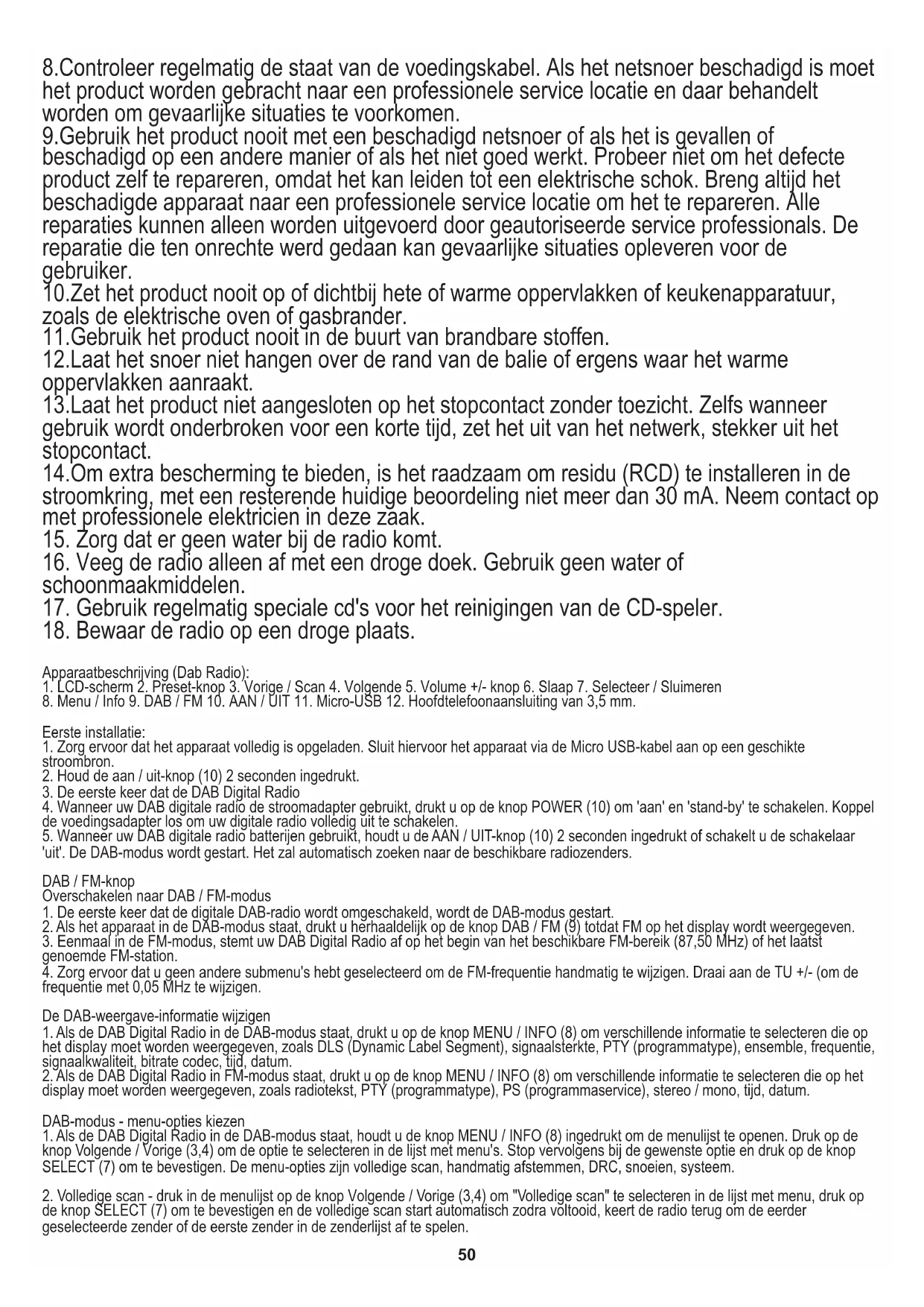 Zrušení zvukového alarmu Stisknutím pohotovostního režimu (10) zrušíte jakýkoli zvukový alarm nebo stisknutím tlačítka Source zrušíte a necháte rádio zapnuté. Odložení zvukového alarmu Chcete-li odložit zvukový alarm, stiskněte tlačítko Select / Snooze (7). Na displeji se zobrazí odpočítávací měřič, který ukazuje, jak dlouho budík odloží. Chcete-li upravit dobu, po kterou bude budík odložen, stiskněte tlačítko Continuous Select / Snooze (7) pro změnu doby odložení v 5minutových intervalech až na 15 minut a poté 30 minut. Pro zrušení budíku stiskněte tlačítko Standby (10). Digitální frekvence: pásmo III 174-240 MHz, FM: 87,5-108 MHz Příjem napájení 5V (1A) DC micro-USB (kabel je součástí dodávky) Lithium-iontová dobíjecí baterie (2000 mAh) Vstupy 5V DC (1A) Micro-USB napájecí zásuvka Ochrana životního prostředí. Kartón odevzdejte do sběru. Polyetylénové sáčky (PE) vyhazujte do kontejneru na plasty. Vysloužilý přístroj odevzdejte do příslušného sběrného dvoru, protože některé části zařízení mohou představovat pro životní prostředí nebezpečí. Elektrický přístroj odevzdejte tak, aby se omezilo jeho opětovné používání. Pokud jsou v přístroji baterie, vyjměte je a odevzdejte do příslušného sběrného místa zvlášť. Přístroj nevyhazujte do popelnic ani kontejneru na směsný odpad!! NEDERLANDS Spotřebič je proveden v 2. třídě izolace. Spotřebič vyhovuje požadavkům směrnic: Elektrická zařízení nízkého napětí (LVD) Elektromagnetická kompatibilita (EMC) Výrobek je na výrobním štítku označen znakem CE. VEILIGHEID CONDITIES. BELANGRIJKE INSTRUCTIES VOOR DE VEILIGHEID VAN GEBRUIK. LEES DIT ZORGVULDIG DOOR EN BEWAAR HET VOOR LATER GEBRUIK. De garantievoorwaarden zijn verschillend, als het apparaat wordt gebruikt voor commerciële doeleinden. 1.Voordat u het product gebruikt, lees aandachtig en voldoe altijd aan de volgende instructies. De fabrikant is niet verantwoordelijk voor eventuele schade als gevolg van verkeerd gebruik. 2.Het product is alleen voor binnenshuis gebruik. Gebruik het product niet voor een doel dat niet verenigbaar is met de toepassing ervan. 3.De toepasselijke voltage is 230V, ~ 50Hz. Om veiligheidsredenen is het niet wenselijk om meerdere apparaten aan te sluiten op een stopcontact. 4.Wees voorzichtig bij het gebruik rond kinderen. Laat de kinderen niet spelen met het product. Laat kinderen of mensen die niet weten hoe het apparaat werkt er niet mee bezig zonder toezicht. 5.WAARSCHUWING: Dit apparaat kan worden gebruikt door kinderen vanaf 8 jaar en personen met verminderde lichamelijke, zintuiglijke of geestelijke vermogens, of personen zonder ervaring of kennis van het apparaat alleen onder toezicht van een persoon die verantwoordelijk is voor hun veiligheid, of als ze werden geïnstrueerd over het veilige gebruik van het apparaat en zijn zich bewust van de gevaren in verband met de werking ervan. Kinderen mogen niet met het apparaat spelen. Reiniging en onderhoud van het apparaat mag niet door kinderen worden uitgevoerd, tenzij ze ouder zijn dan 8 jaar en deze activiteiten moeten worden uitgevoerd onder toezicht. 6.Nadat u klaar bent met het product moet u altijd onthouden om de stekker voorzichtig uit het stopcontact te trekken. Trek nooit aan het netsnoer!! 7.Zet nooit het netsnoer, de stekker of het hele apparaat in het water. Nooit het product aan de atmosferische omstandigheden bloot leggen, zoals direct zonlicht of regen, etc. Gebruik het product nooit in vochtige omstandigheden.50 8.Controleer regelmatig de staat van de voedingskabel. Als het netsnoer beschadigd is moet het product worden gebracht naar een professionele service locatie en daar behandelt worden om gevaarlijke situaties te voorkomen. 9.Gebruik het product nooit met een beschadigd netsnoer of als het is gevallen of beschadigd op een andere manier of als het niet goed werkt. Probeer niet om het defecte product zelf te repareren, omdat het kan leiden tot een elektrische schok. Breng altijd het beschadigde apparaat naar een professionele service locatie om het te repareren. Alle reparaties kunnen alleen worden uitgevoerd door geautoriseerde service professionals. De reparatie die ten onrechte werd gedaan kan gevaarlijke situaties opleveren voor de gebruiker. 10.Zet het product nooit op of dichtbij hete of warme oppervlakken of keukenapparatuur, zoals de elektrische oven of gasbrander. 11.Gebruik het product nooit in de buurt van brandbare stoffen. 12.Laat het snoer niet hangen over de rand van de balie of ergens waar het warme oppervlakken aanraakt. 13.Laat het product niet aangesloten op het stopcontact zonder toezicht. Zelfs wanneer gebruik wordt onderbroken voor een korte tijd, zet het uit van het netwerk, stekker uit het stopcontact. 14.Om extra bescherming te bieden, is het raadzaam om residu (RCD) te installeren in de stroomkring, met een resterende huidige beoordeling niet meer dan 30 mA. Neem contact op met professionele elektricien in deze zaak.