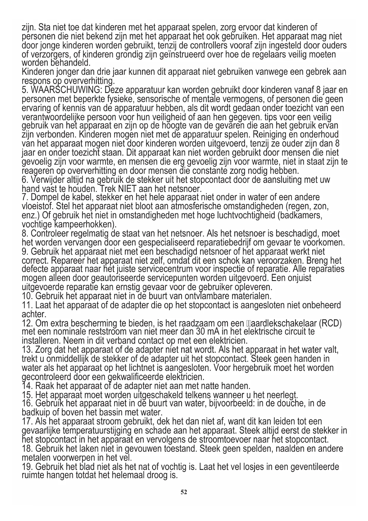 personen met beperkte fysieke, sensorische of mentale vermogens, of personen die geen ervaring of kennis van de apparatuur hebben, als dit wordt gedaan onder toezicht van een verantwoordelijke persoon voor hun veiligheid of aan hen gegeven. tips voor een veilig gebruik van het apparaat en zijn op de hoogte van de gevaren die aan het gebruik ervan zijn verbonden. Kinderen mogen niet met de apparatuur spelen. Reiniging en onderhoud van het apparaat mogen niet door kinderen worden uitgevoerd, tenzij ze ouder zijn dan 8 jaar en onder toezicht staan. Dit apparaat kan niet worden gebruikt door mensen die niet gevoelig zijn voor warmte, en mensen die erg gevoelig zijn voor warmte, niet in staat zijn te reageren op oververhitting en door mensen die constante zorg nodig hebben.