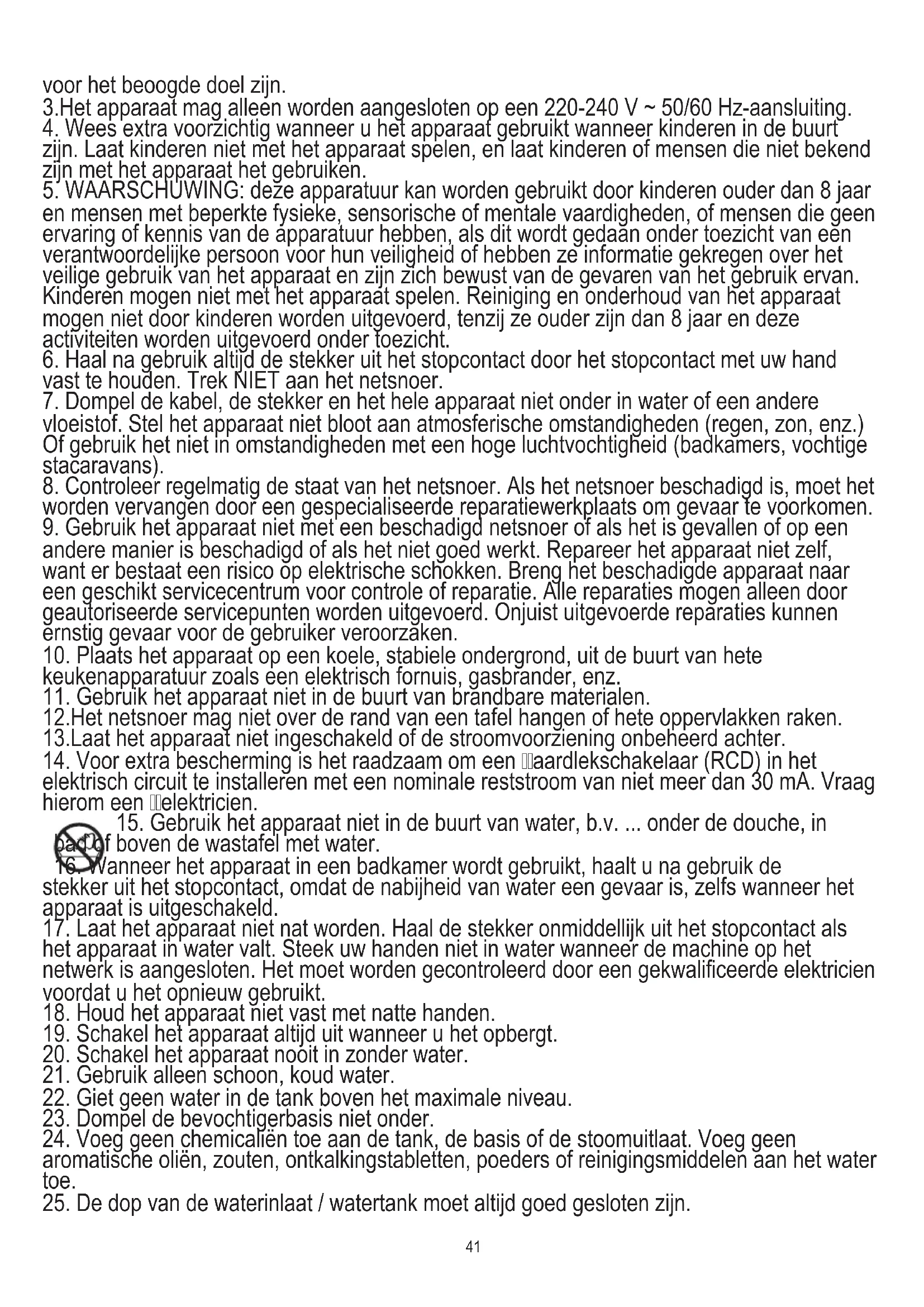 25. De dop van de waterinlaat / watertank moet altijd goed gesloten zijn.42