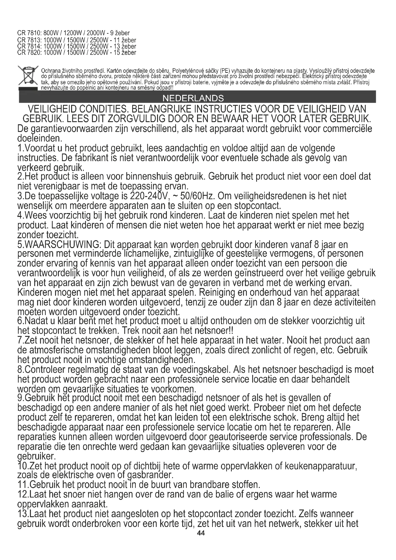 4. K čištění topného tělesa nikdy nepoužívejte vosk, lešticí prostředky nebo chemické prostředky. Mohou reagovat se zařízením a způsobit změnu barvy nebo dokonce poškození. TECHNICKÁ DATA Zdroj energie: 220-240 V ~ 50/60 Hz Úrovně výkonu: (nízký / střední / vysoký) CR 7812: 600W / 900W / 1500W - 7 žeber44 CR 7810: 800W / 1200W / 2000W - 9 žeber CR 7813: 1000W / 1500W / 2500W - 11 žeber CR 7814: 1000W / 1500W / 2500W - 13 žeber CR 7820: 1000W / 1500W / 2500W - 15 žeber Ochrana životního prostředí. Kartón odevzdejte do sběru. Polyetylénové sáčky (PE) vyhazujte do kontejneru na plasty. Vysloužilý přístroj odevzdejte do příslušného sběrného dvoru, protože některé části zařízení mohou představovat pro životní prostředí nebezpečí. Elektrický přístroj odevzdejte tak, aby se omezilo jeho opětovné používání. Pokud jsou v přístroji baterie, vyjměte je a odevzdejte do příslušného sběrného místa zvlášť. Přístroj nevyhazujte do popelnic ani kontejneru na směsný odpad!! NEDERLANDS VEILIGHEID CONDITIES. BELANGRIJKE INSTRUCTIES VOOR DE VEILIGHEID VAN GEBRUIK. LEES DIT ZORGVULDIG DOOR EN BEWAAR HET VOOR LATER GEBRUIK. De garantievoorwaarden zijn verschillend, als het apparaat wordt gebruikt voor commerciële doeleinden. 1.Voordat u het product gebruikt, lees aandachtig en voldoe altijd aan de volgende instructies. De fabrikant is niet verantwoordelijk voor eventuele schade als gevolg van verkeerd gebruik. 2.Het product is alleen voor binnenshuis gebruik. Gebruik het product niet voor een doel dat niet verenigbaar is met de toepassing ervan. 3.De toepasselijke voltage is 220-240V, ~ 50/60Hz. Om veiligheidsredenen is het niet wenselijk om meerdere apparaten aan te sluiten op een stopcontact. 4.Wees voorzichtig bij het gebruik rond kinderen. Laat de kinderen niet spelen met het product. Laat kinderen of mensen die niet weten hoe het apparaat werkt er niet mee bezig zonder toezicht. 5.WAARSCHUWING: Dit apparaat kan worden gebruikt door kinderen vanaf 8 jaar en personen met verminderde lichamelijke, zintuiglijke of geestelijke vermogens, of personen zonder ervaring of kennis van het apparaat alleen onder toezicht van een persoon die verantwoordelijk is voor hun veiligheid, of als ze werden geïnstrueerd over het veilige gebruik van het apparaat en zijn zich bewust van de gevaren in verband met de werking ervan. Kinderen mogen niet met het apparaat spelen. Reiniging en onderhoud van het apparaat mag niet door kinderen worden uitgevoerd, tenzij ze ouder zijn dan 8 jaar en deze activiteiten moeten worden uitgevoerd onder toezicht. 6.Nadat u klaar bent met het product moet u altijd onthouden om de stekker voorzichtig uit het stopcontact te trekken. Trek nooit aan het netsnoer!! 7.Zet nooit het netsnoer, de stekker of het hele apparaat in het water. Nooit het product aan de atmosferische omstandigheden bloot leggen, zoals direct zonlicht of regen, etc. Gebruik het product nooit in vochtige omstandigheden. 8.Controleer regelmatig de staat van de voedingskabel. Als het netsnoer beschadigd is moet het product worden gebracht naar een professionele service locatie en daar behandelt worden om gevaarlijke situaties te voorkomen. 9.Gebruik het product nooit met een beschadigd netsnoer of als het is gevallen of beschadigd op een andere manier of als het niet goed werkt. Probeer niet om het defecte product zelf te repareren, omdat het kan leiden tot een elektrische schok. Breng altijd het beschadigde apparaat naar een professionele service locatie om het te repareren. Alle reparaties kunnen alleen worden uitgevoerd door geautoriseerde service professionals. De reparatie die ten onrechte werd gedaan kan gevaarlijke situaties opleveren voor de gebruiker. 10.Zet het product nooit op of dichtbij hete of warme oppervlakken of keukenapparatuur, zoals de elektrische oven of gasbrander. 11.Gebruik het product nooit in de buurt van brandbare stoffen. 12.Laat het snoer niet hangen over de rand van de balie of ergens waar het warme oppervlakken aanraakt. 13.Laat het product niet aangesloten op het stopcontact zonder toezicht. Zelfs wanneer gebruik wordt onderbroken voor een korte tijd, zet het uit van het netwerk, stekker uit het45 stopcontact.