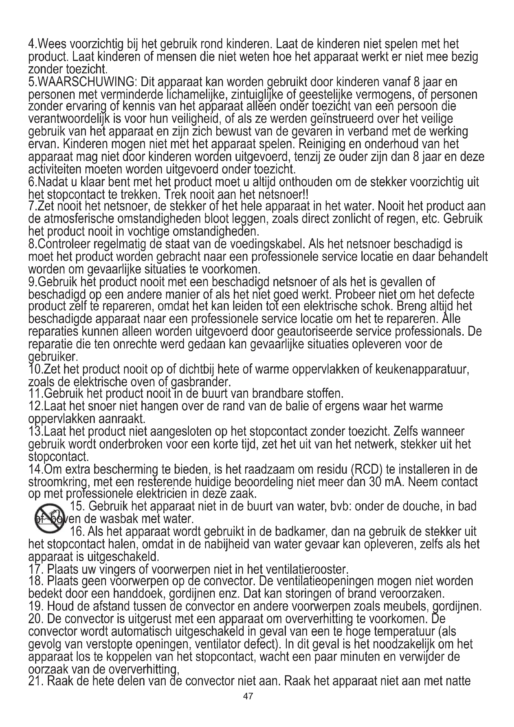 21. Raak de hete delen van de convector niet aan. Raak het apparaat niet aan met natte48