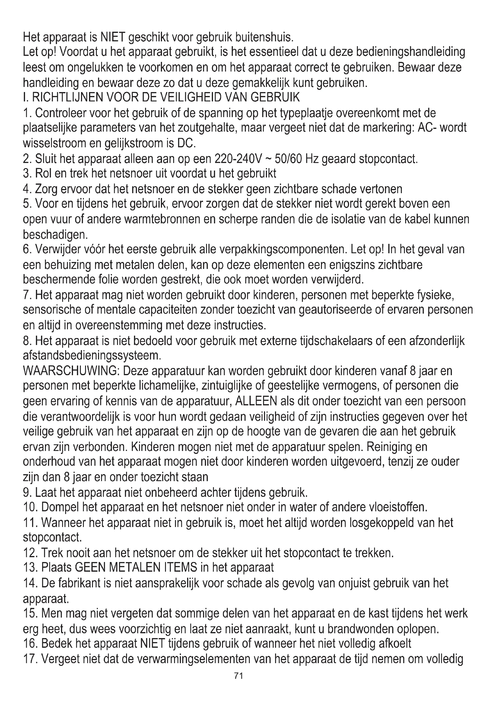 17. Vergeet niet dat de verwarmingselementen van het apparaat de tijd nemen om volledig72