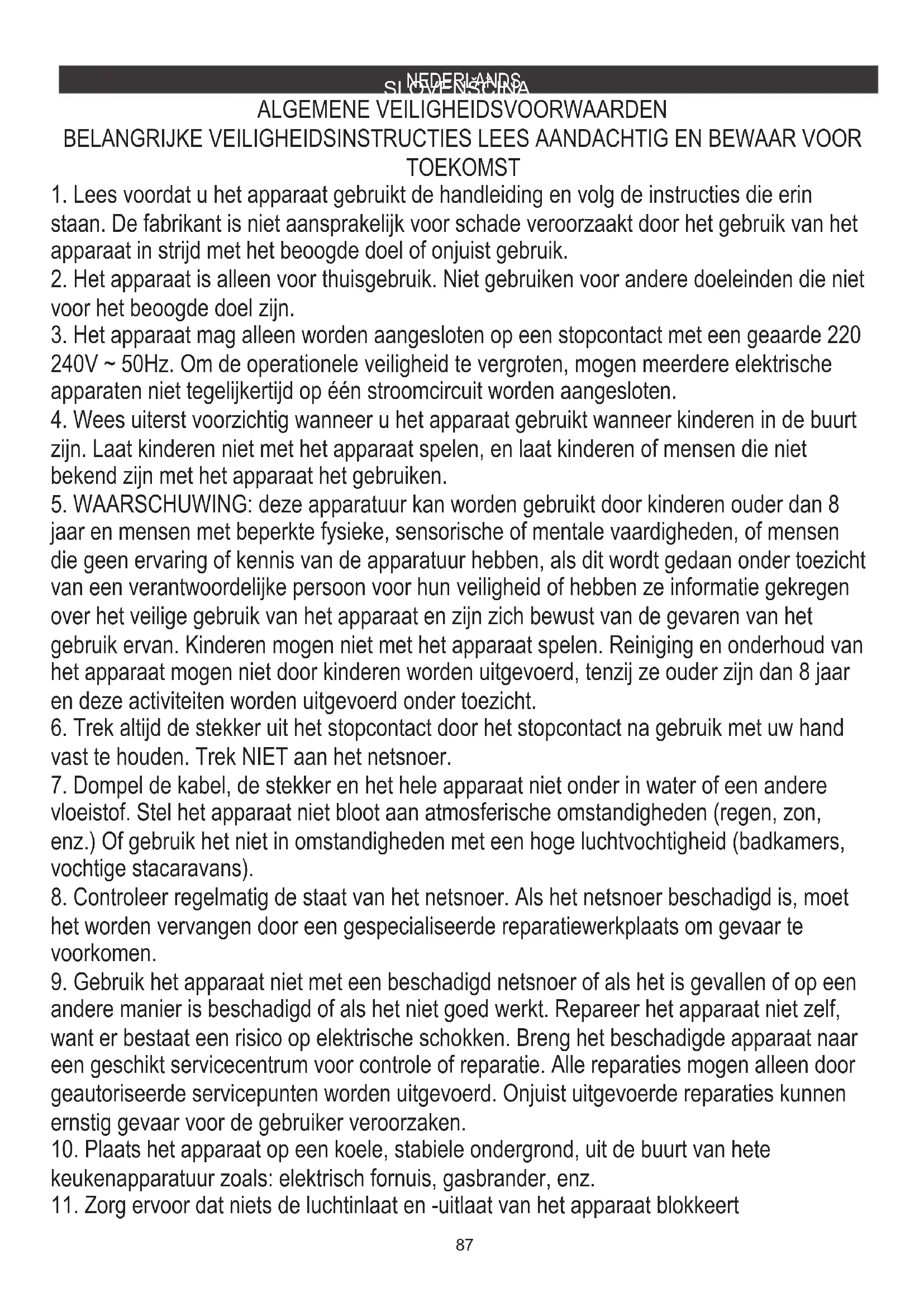 jaar en mensen met beperkte fysieke, sensorische of mentale vaardigheden, of mensen die geen ervaring of kennis van de apparatuur hebben, als dit wordt gedaan onder toezicht van een verantwoordelijke persoon voor hun veiligheid of hebben ze informatie gekregen over het veilige gebruik van het apparaat en zijn zich bewust van de gevaren van het gebruik ervan. Kinderen mogen niet met het apparaat spelen. Reiniging en onderhoud van het apparaat mogen niet door kinderen worden uitgevoerd, tenzij ze ouder zijn dan 8 jaar en deze activiteiten worden uitgevoerd onder toezicht. BELANGRIJKE VEILIGHEIDSINSTRUCTIES LEES AANDACHTIG EN BEWAAR VOOR TOEKOMST ALGEMENE VEILIGHEIDSVOORWAARDEN