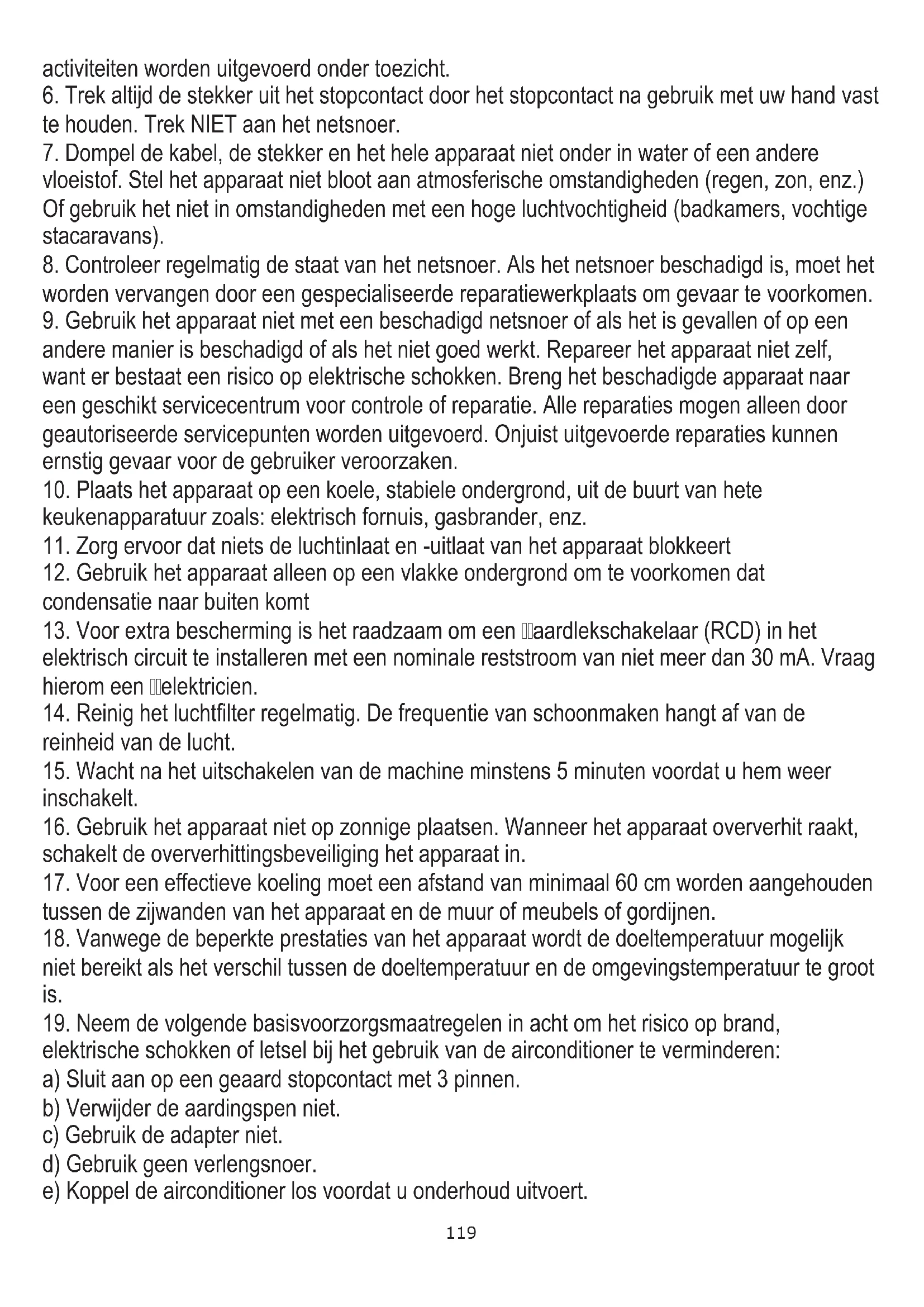 elektrische schokken of letsel bij het gebruik van de airconditioner te verminderen: a) Sluit aan op een geaard stopcontact met 3 pinnen. b) Verwijder de aardingspen niet. c) Gebruik de adapter niet. d) Gebruik geen verlengsnoer. e) Koppel de airconditioner los voordat u onderhoud uitvoert. 119f) Gebruik twee of meer mensen om de airconditioner te verplaatsen en te installeren.